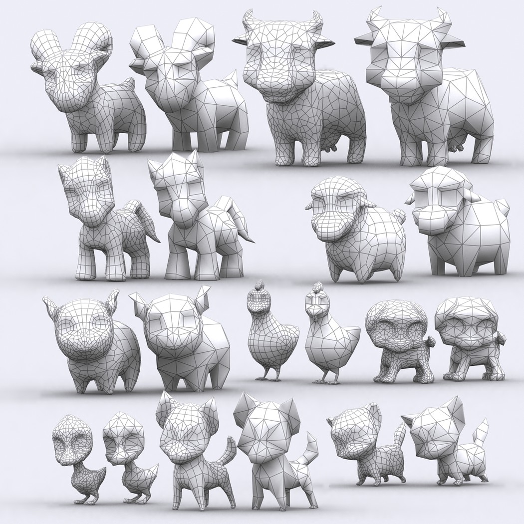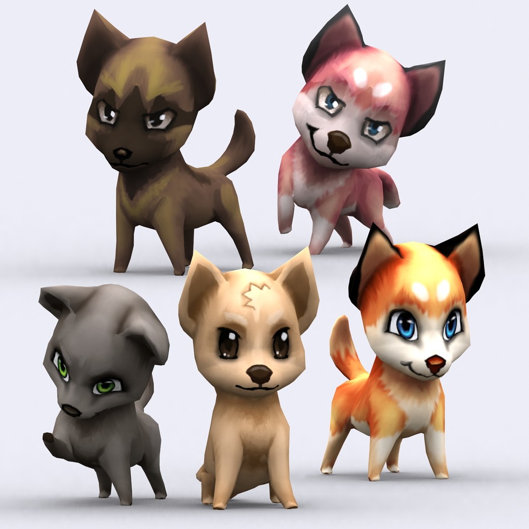Chibii animals lowpoly 3d animated pack. 10 animals: cow, pony, dog, cat, goat, sheep, pig, puppy, chicken, duck. Each animal has 5 texture skins making it total 50 animals. Triangles count: cat - 330 chicken - 315 cow - 578 dog - 250 duck - 336 goat - 298 pig - 270 pony - 338 puppy - 512 sheep - 204