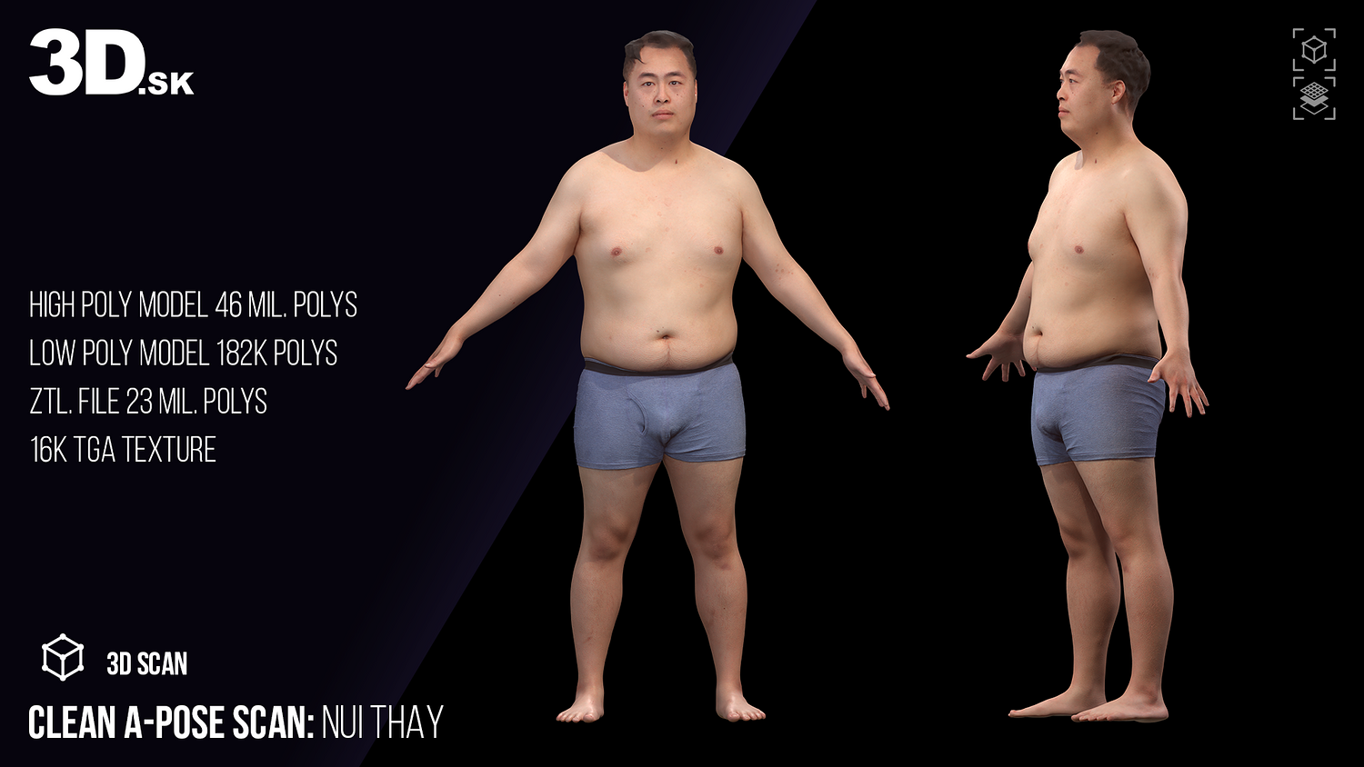 • High Poly Model: 46 million polygons • Low Poly Model: 186,000 polygons • ZTL File (ZBrush): 23 million polygons • Texture Resolution: 16K TGA • Clean, watertight geometry • Neutral A-pose and expression • Realistic proportions and clean skin surface