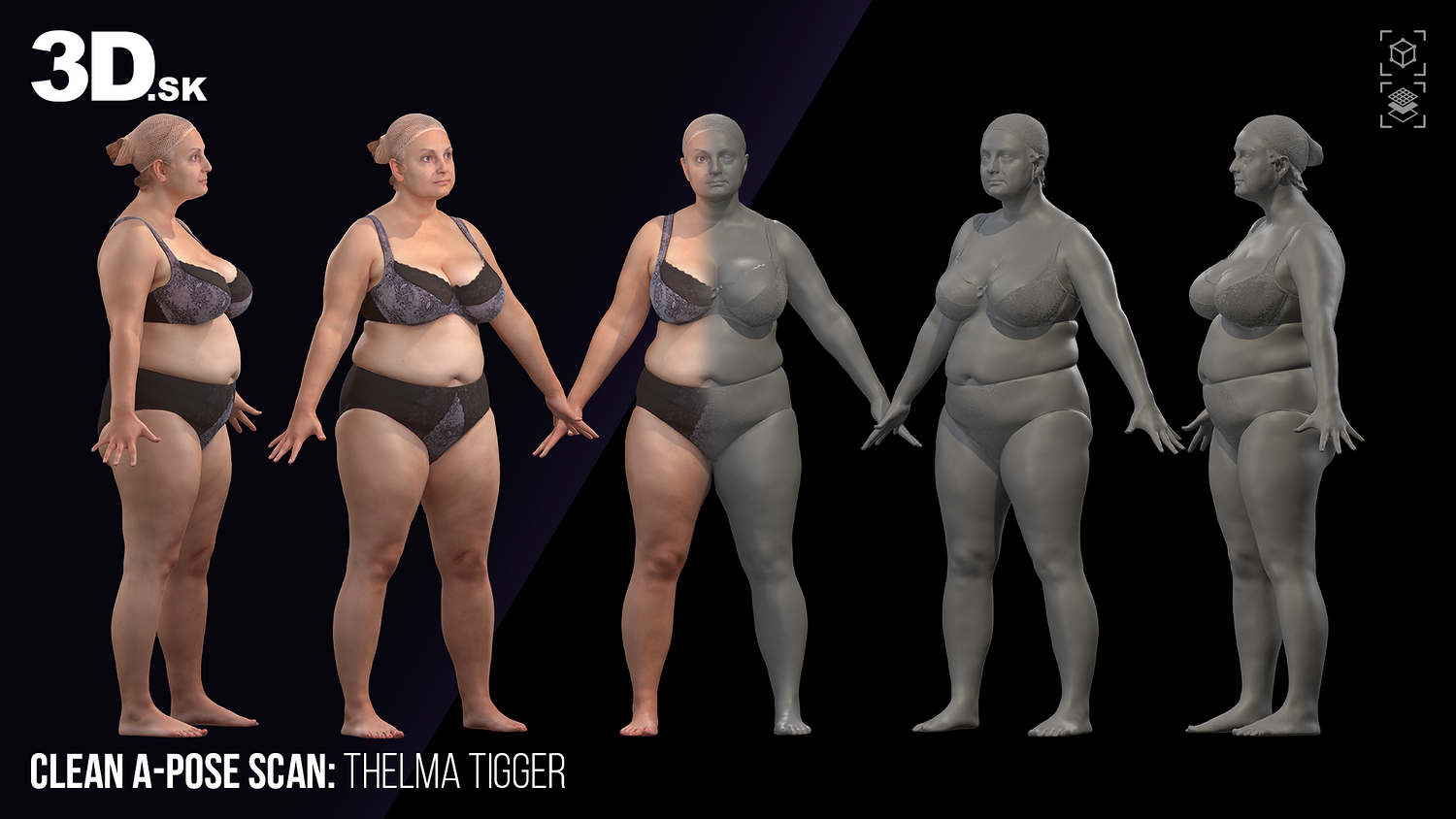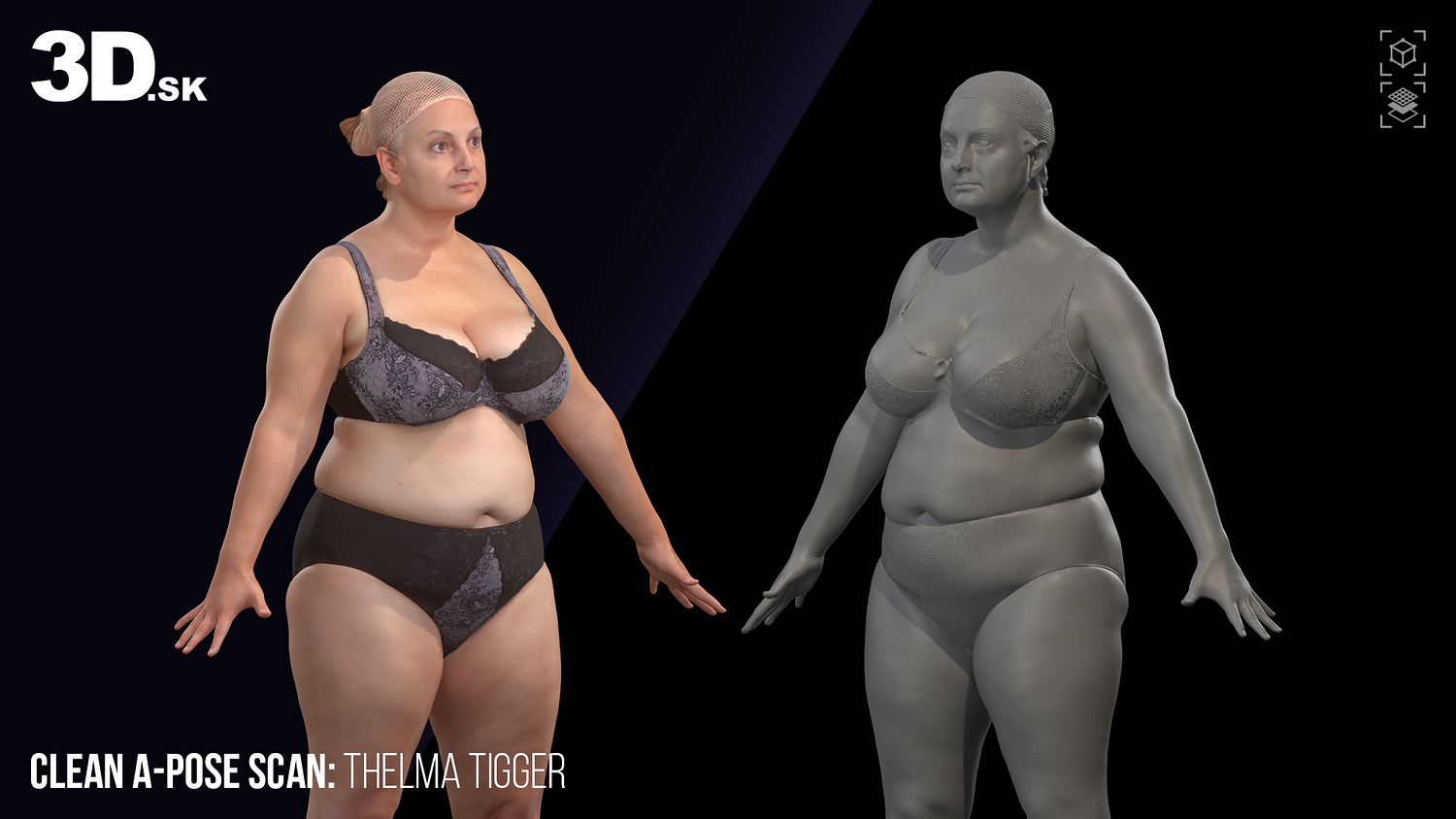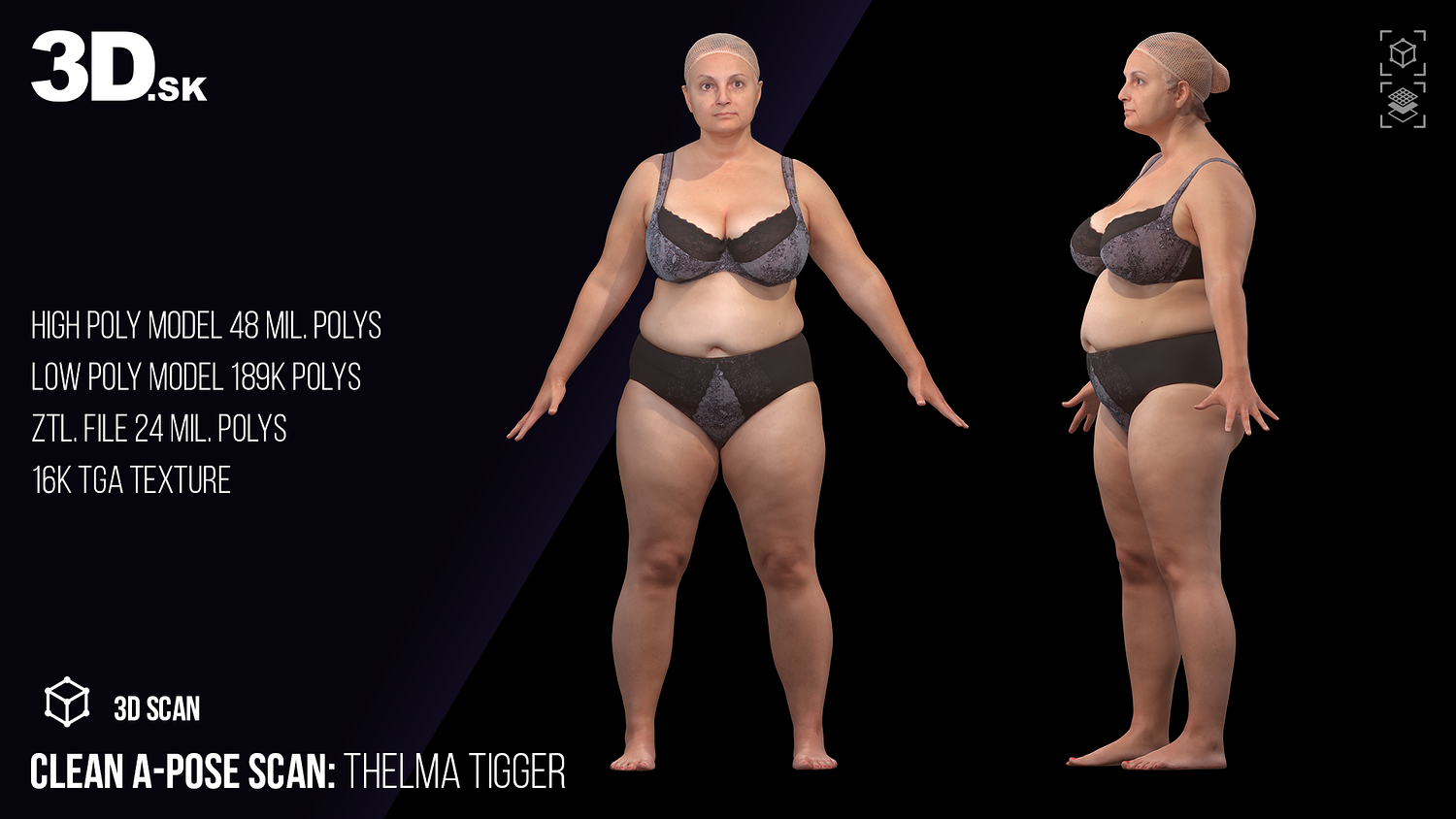 Introducing Thelma Tigger – a high-resolution 3D body scan captured in a clean A-pose wearing form-fitting underwear. This scan preserves realistic anatomy, natural body proportions, and detailed skin surface information, making it a valuable asset for character artists, game developers, and digital human creators.
