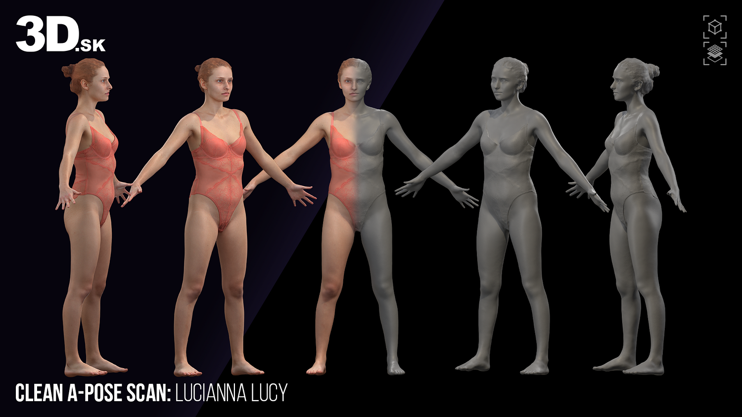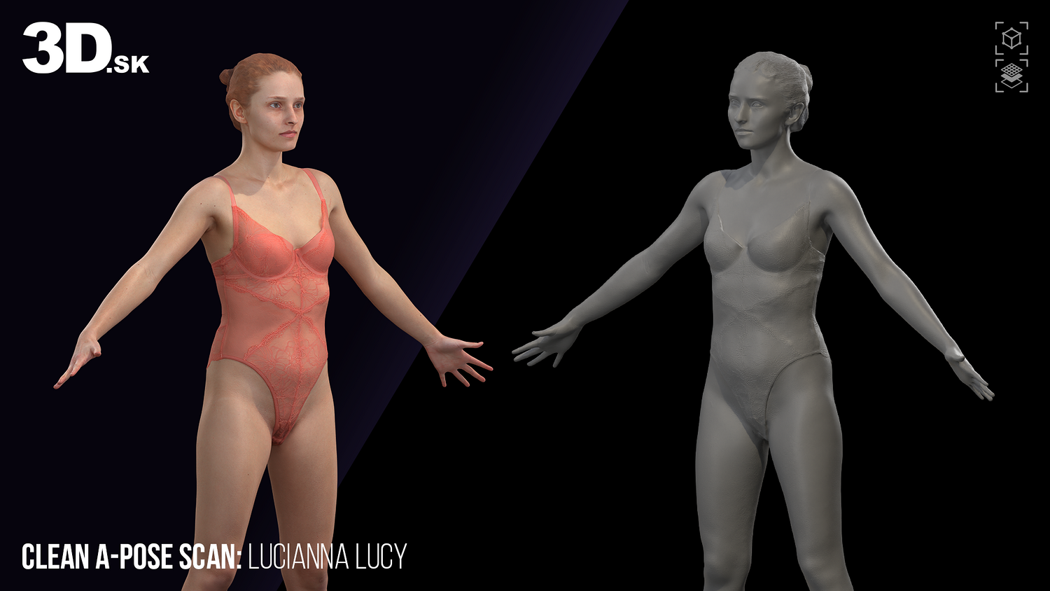 High-resolution raw 3D scan of Lucianna Lucy, captured in a clean A-pose wearing form-fitting underwear to highlight her natural silhouette and surface anatomy. This scan is ideal for character artists, modelers, and creators of digital doubles looking for lifelike proportions and detailed textures.