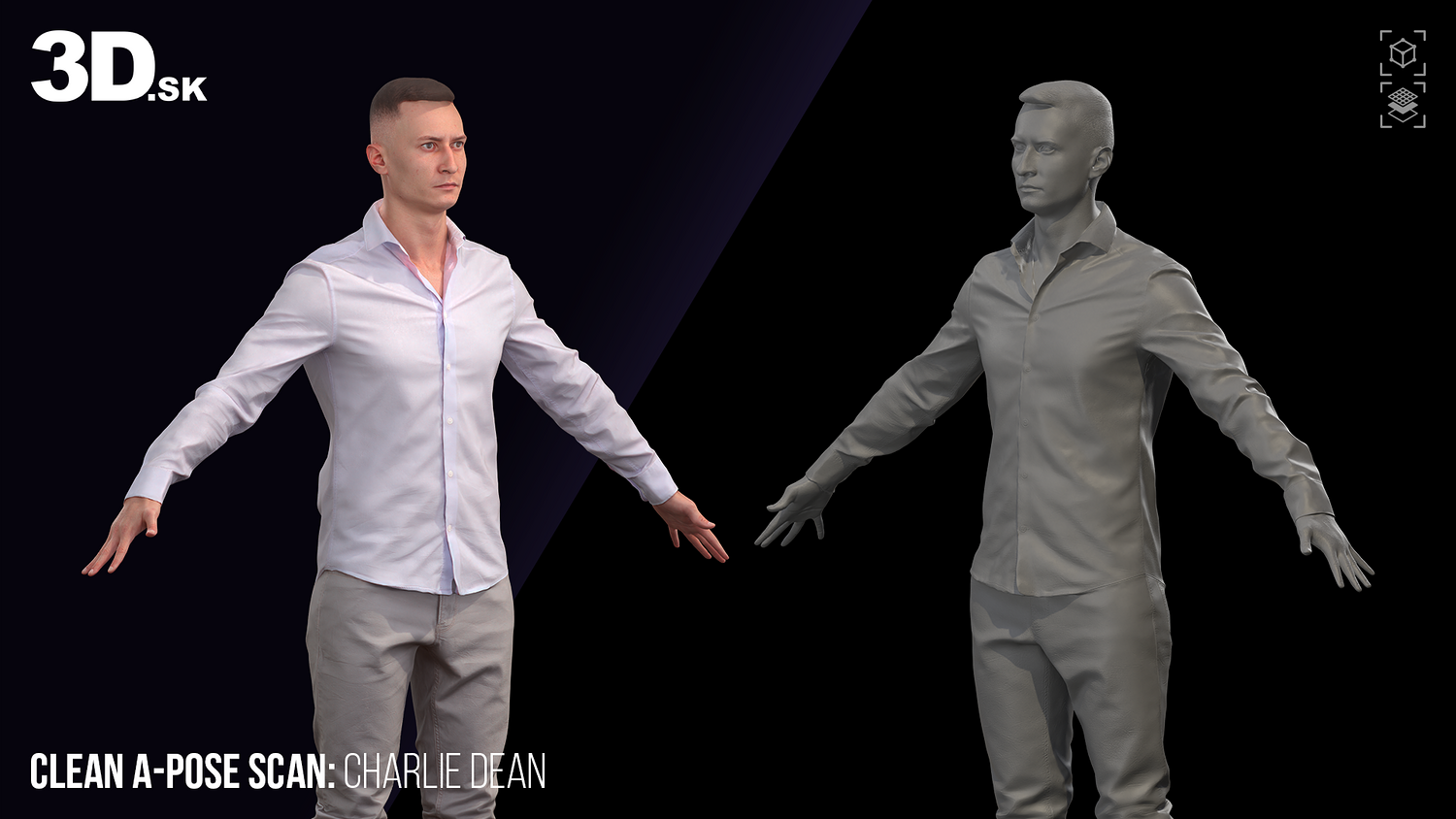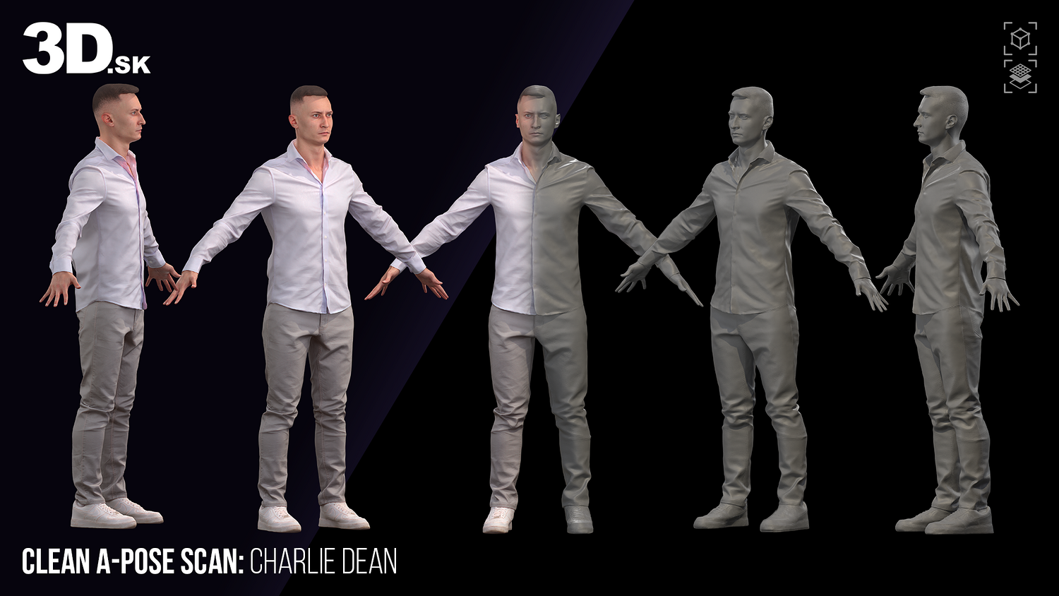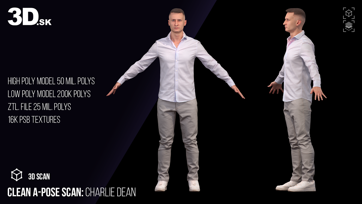 Introducing Charlie Dean – a high-resolution 3D scan of a male character in clean symmetrical A-pose, fully clothed. Captured via high-fidelity photogrammetry and delivered as raw production-grade data, ideal for use in game development, rigging, digital doubles, and character creation workflows.