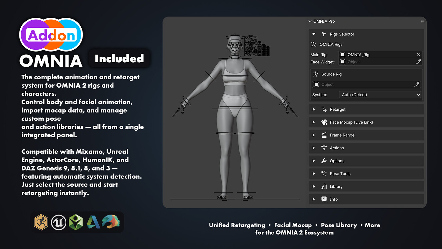 Built with the OMNIA 2 Rig System and enhanced by the OMNIA Pro Add-on, this edition provides fast performance, efficient topology, and seamless retargeting compatibility with major animation platforms.