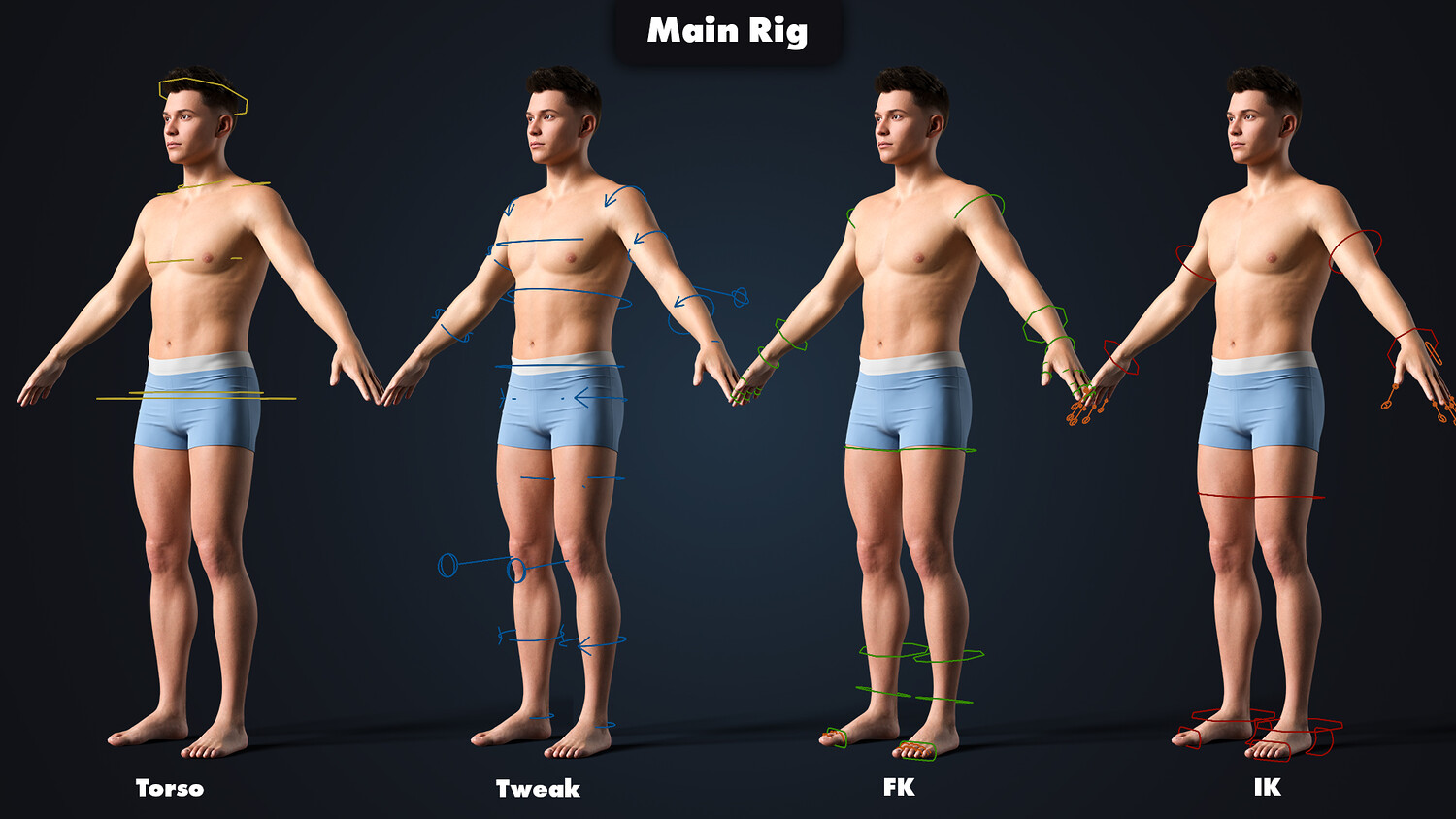 - Advanced Pose Tools for resetting, mirroring, and managing IK/FK transitions directly within the rig.