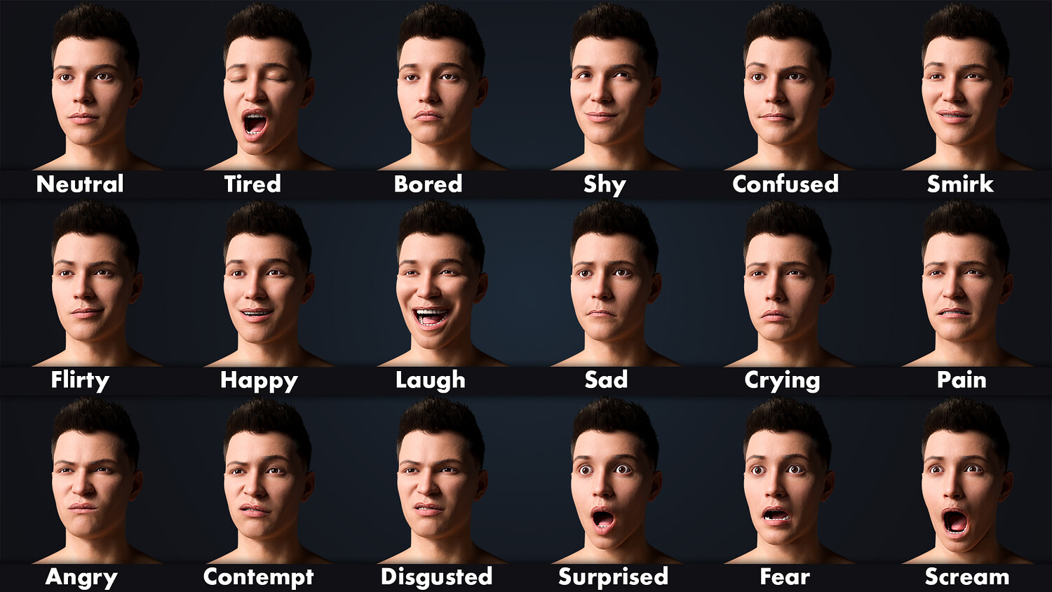 - Material zones for skin, eyes, mouth, brows, hair, clothing, and tears