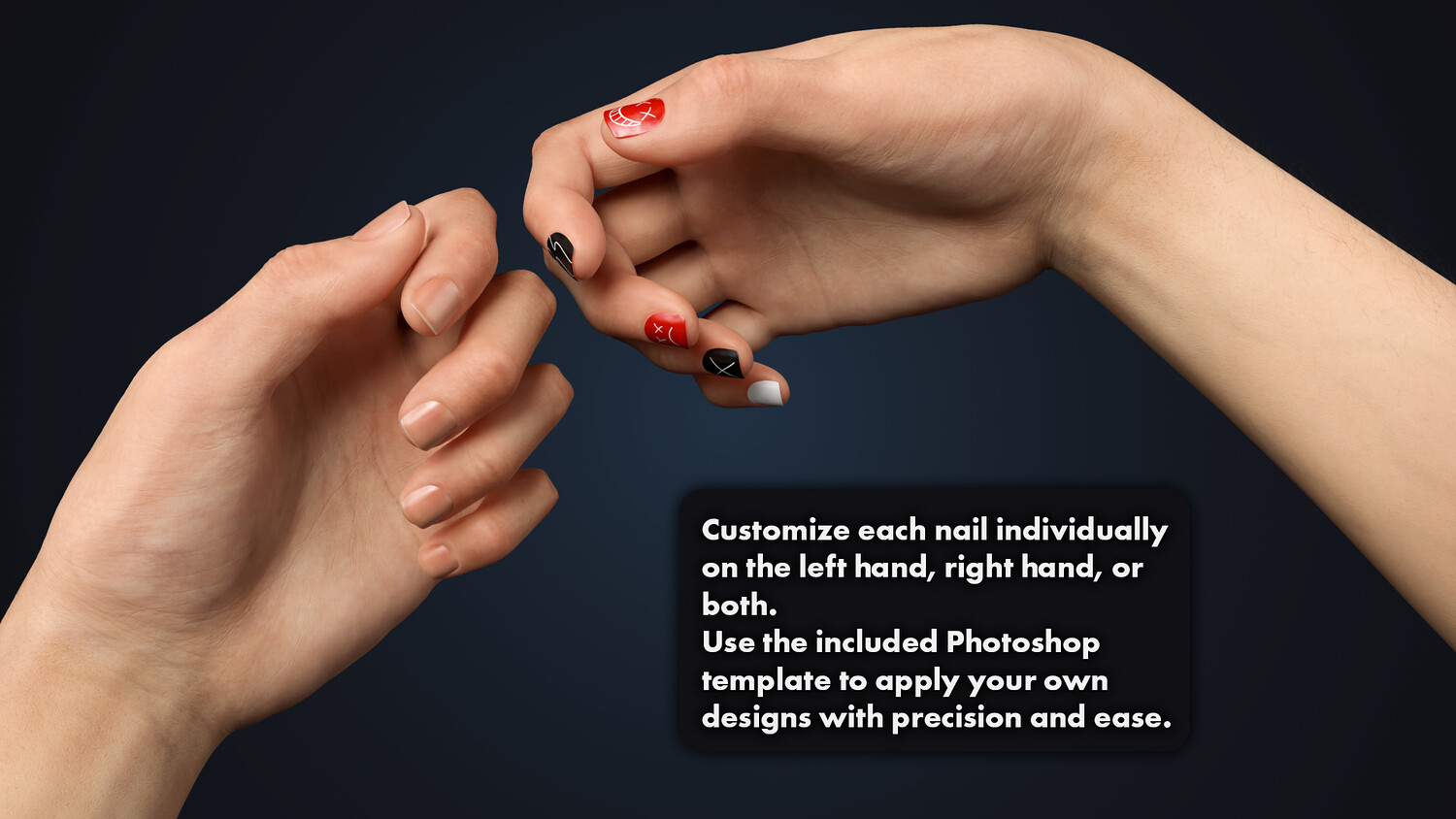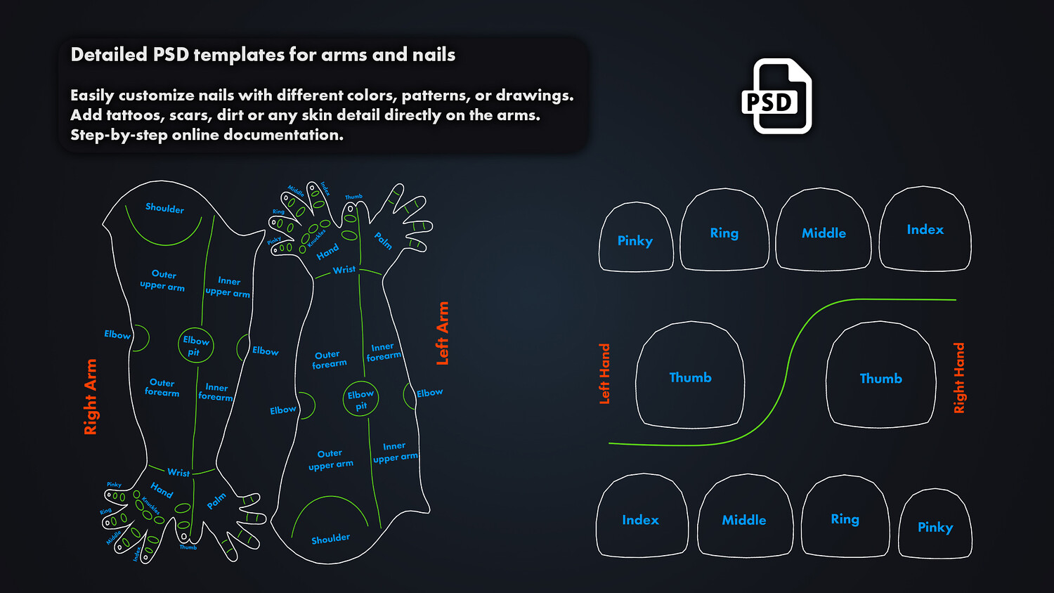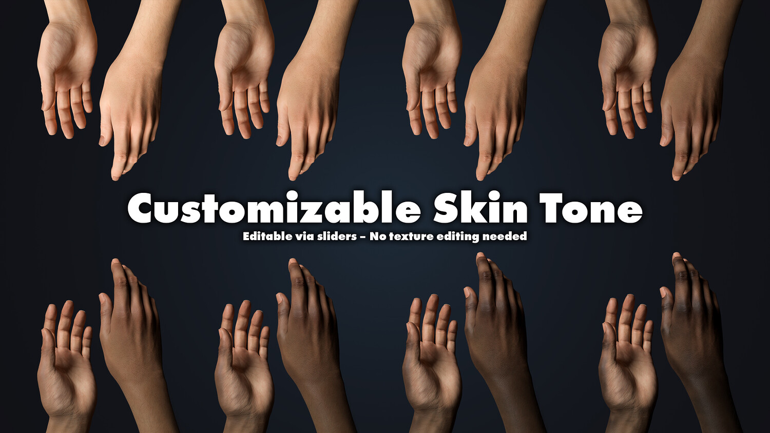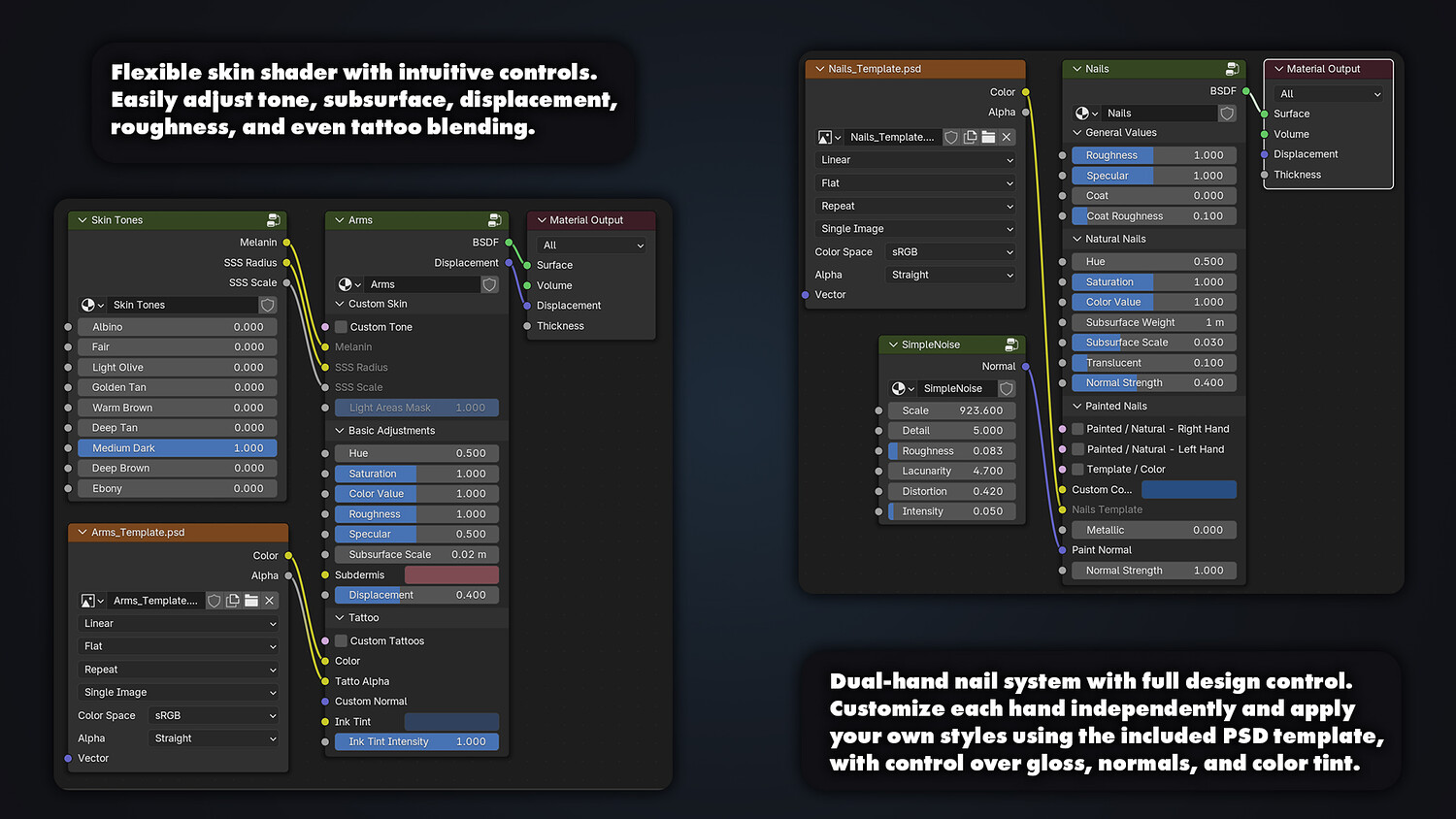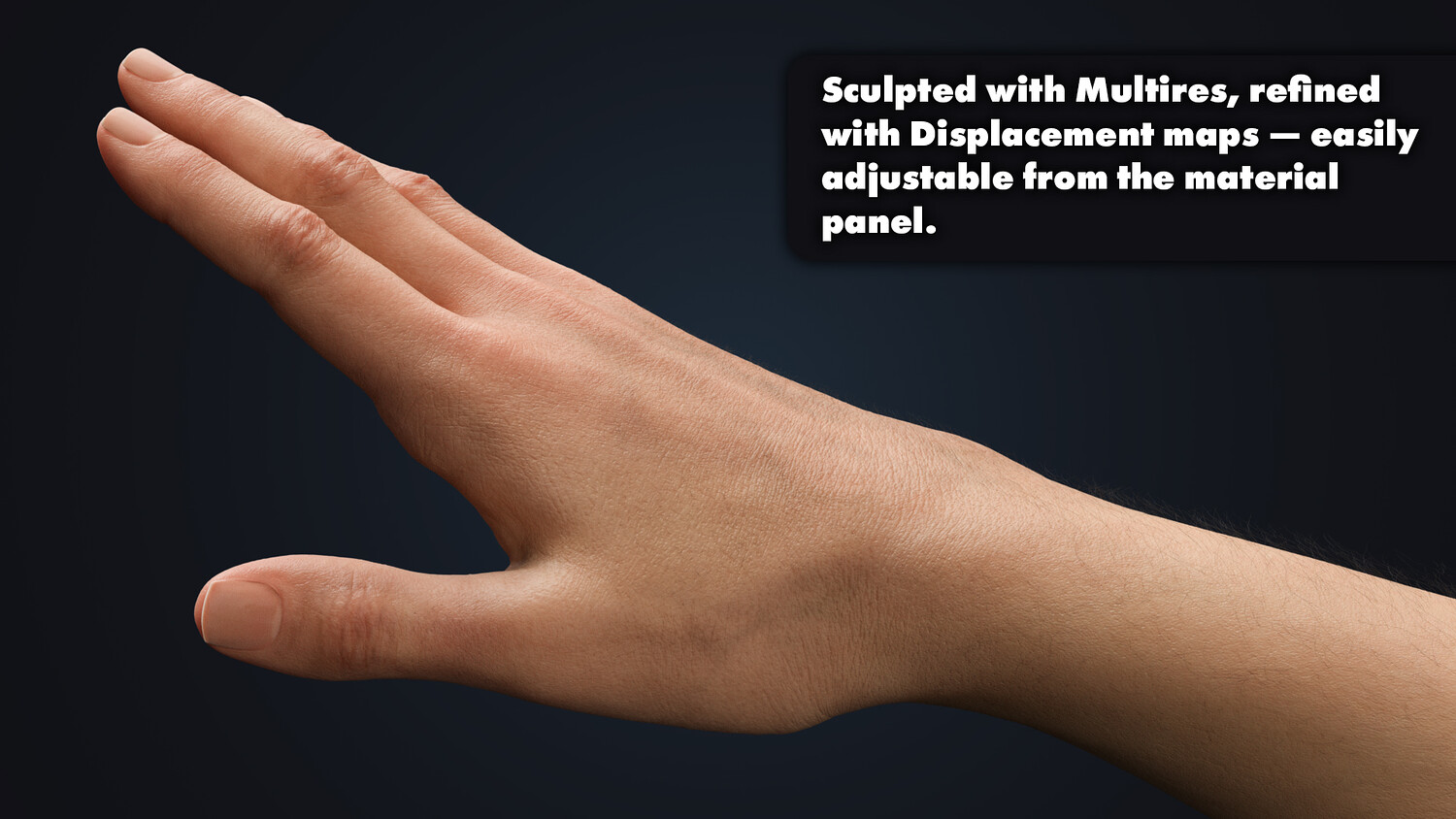 Fully rigged realistic arms crafted for cinematic-quality rendering in Blender’s Cycles, with advanced customization options for skin tones, tattoos, and nail designs.
