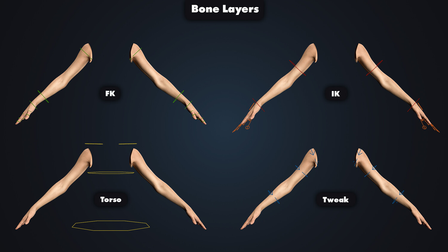 - Advanced Pose Tools for resetting, mirroring, and managing IK/FK transitions directly within the rig.