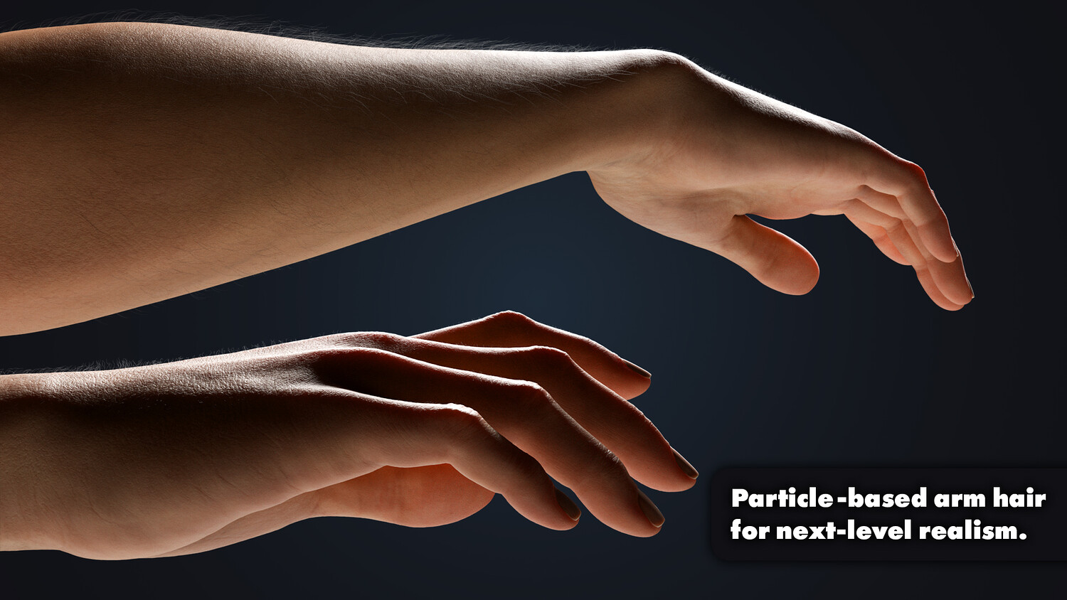 - Full particle setup for realistic arm hair, editable hair materials for Cycles