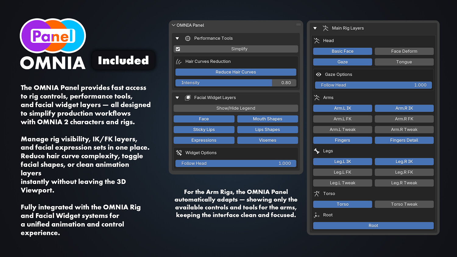 .blendfile with all rigs, materials, and configurationsUNZIP_FIRST.zipcontaining textures and the OMNIA Pro Add-on