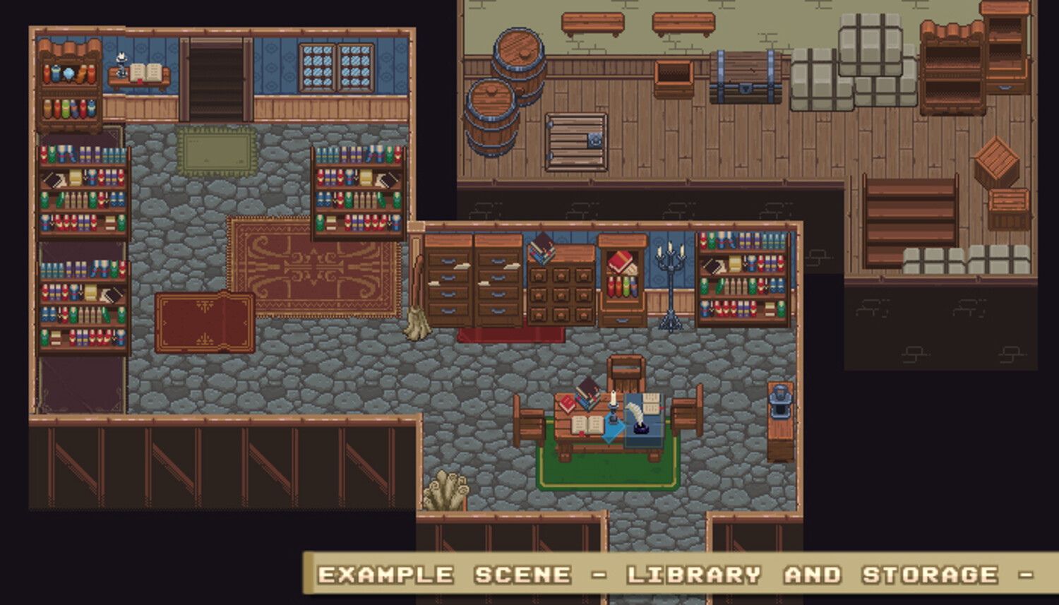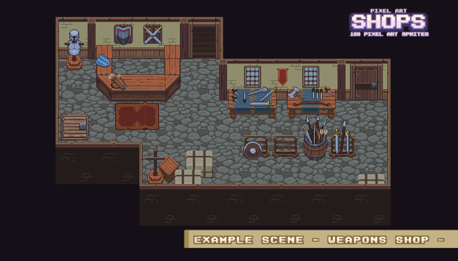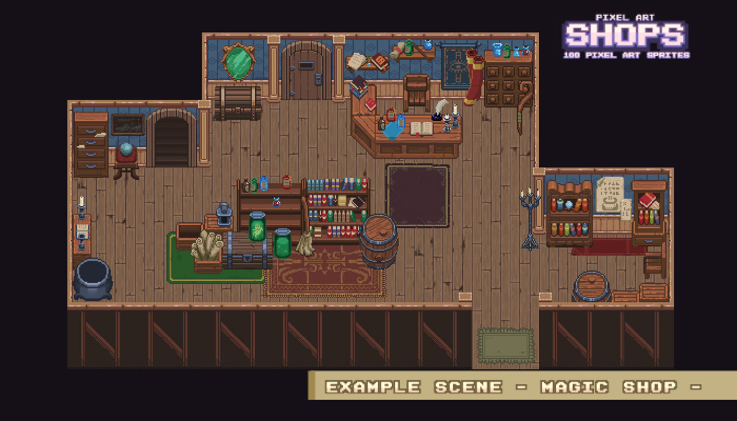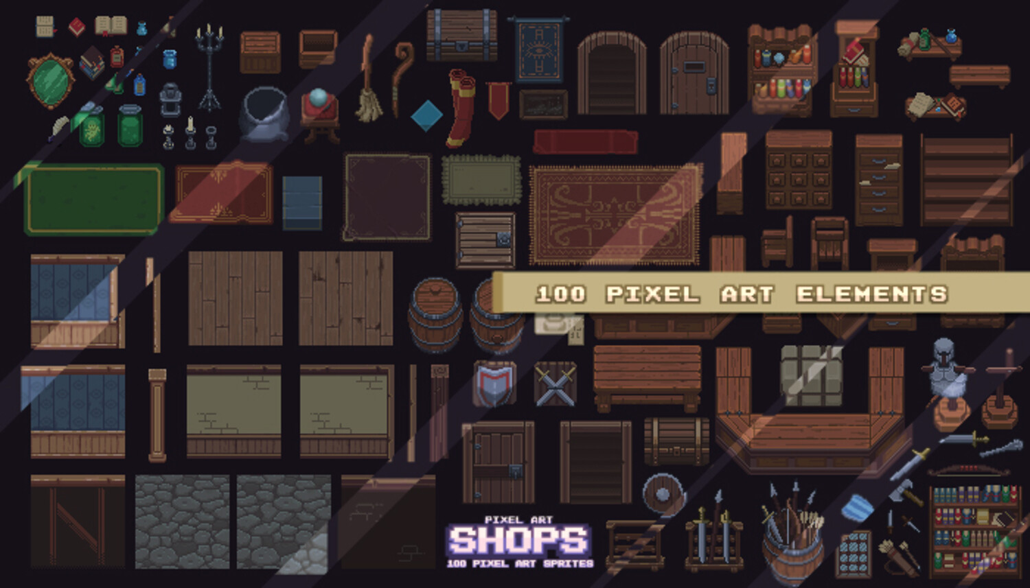 Medieval Shop Interior set Combine and create shops and locations for your game Retro style tile set 100 retro pixel art sprites (Top down perspective) Format PNG and PNG+Alpha Base 64×64 px