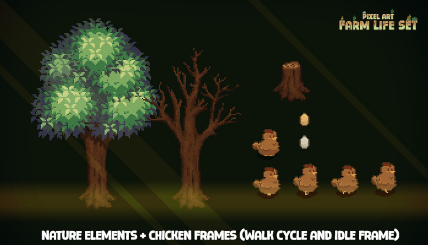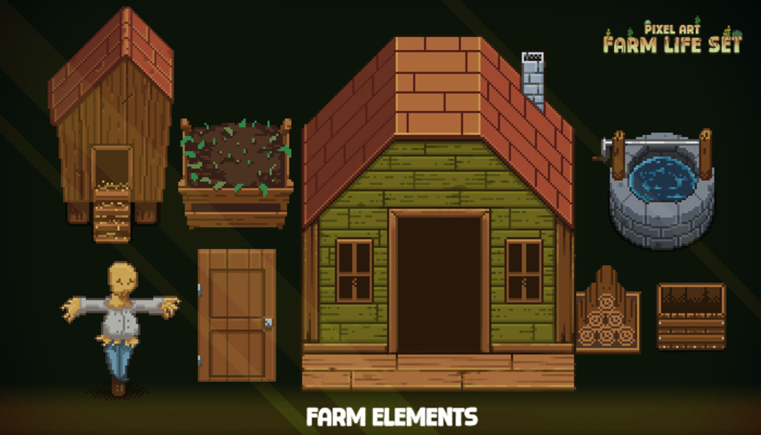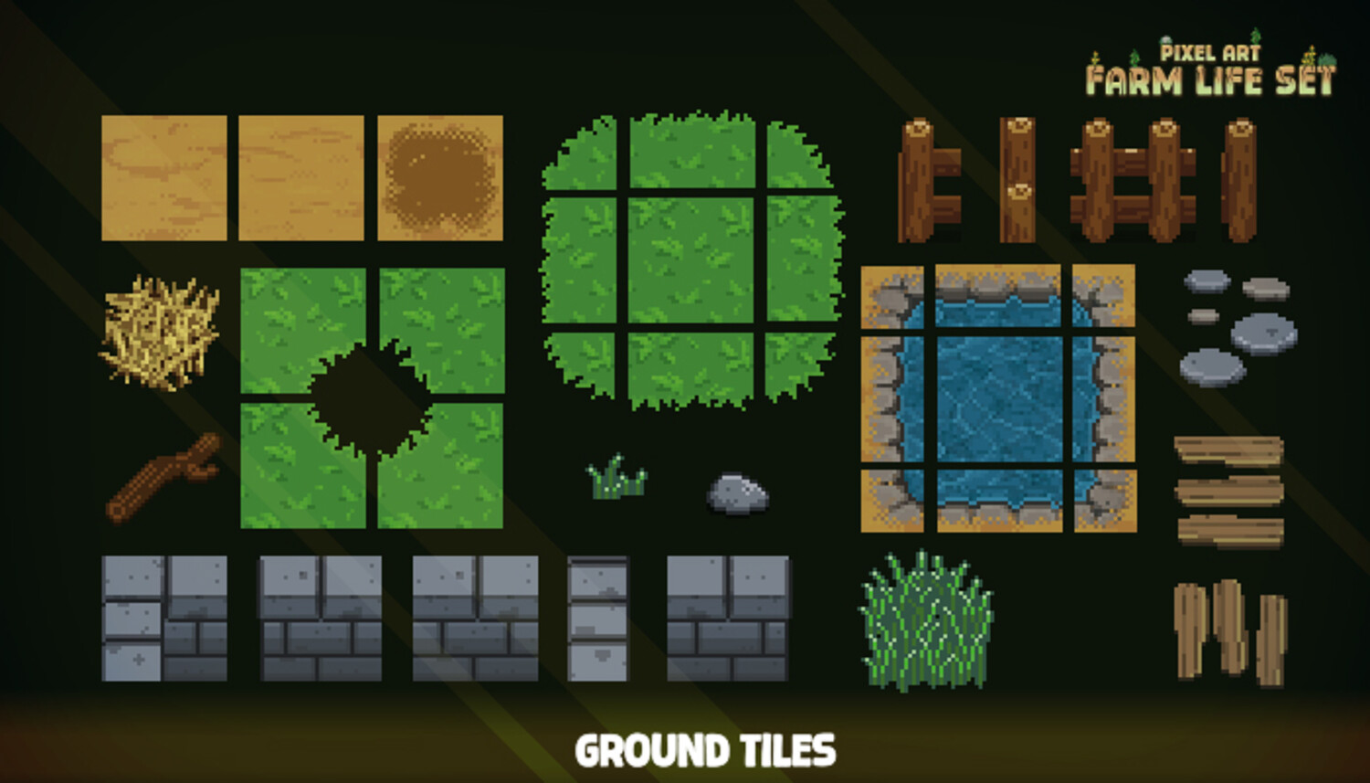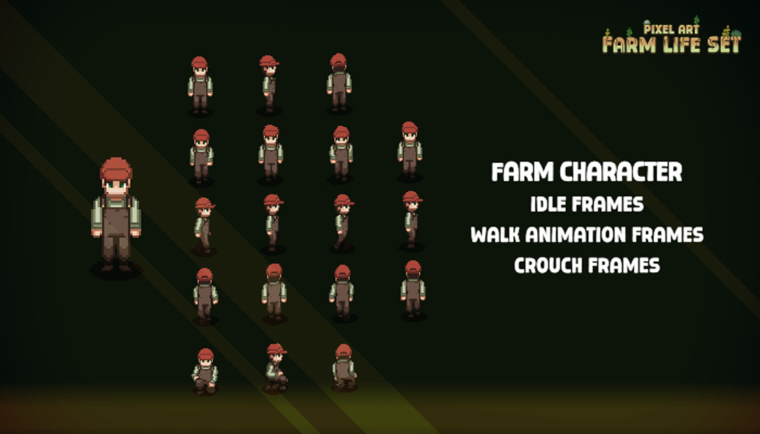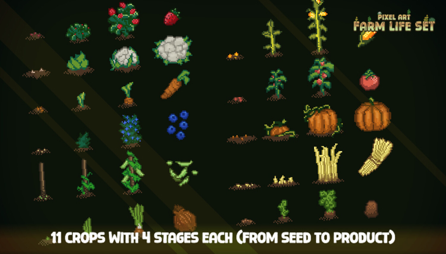 Retro style tile set to create a farm simulation game or rpg Top down perspective. 100 sprites + 2 animated characters (farmer and chicken) format PNG + alpha base on 32x32 resolution Farmer resolution is 64x64 (walk animation for 3 directions + crouch and idle frames) 11 different crops, 4 stages each one. From seed to final product. Ground tiles and trees + farm buildings
