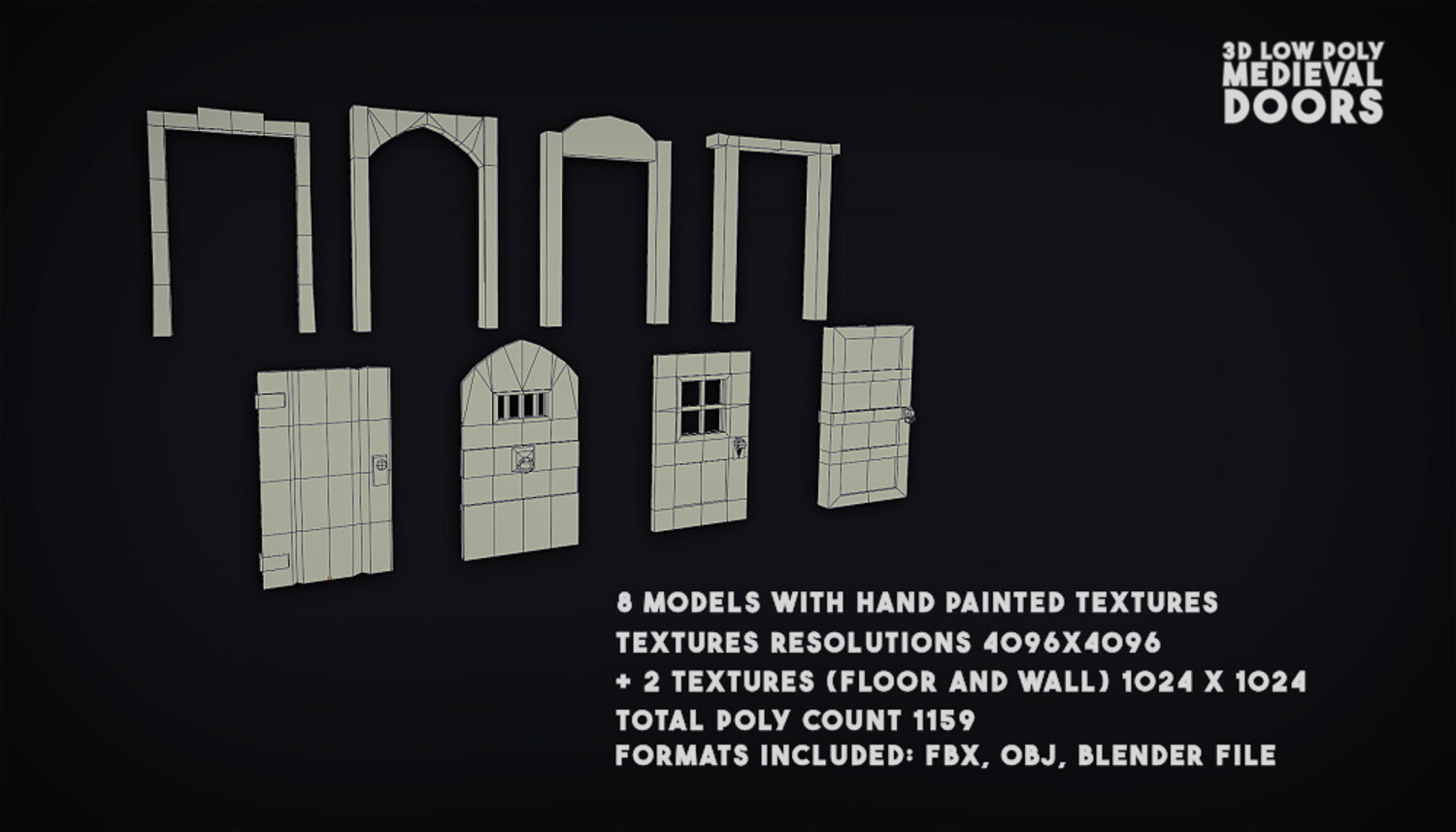8 low poly models with Uvs and Hand Painted Textures Textures Resolutions 4096 x 4096 + 2 Textures (Floor and Wall) Resolution 1024 x 1024 Total Poly Count 1159 Formats: FBX, OBJ, Blender File and PNG for Textures