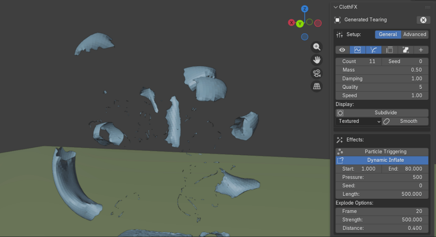 ClothFX simplifies cloth tearing within blender by providing you with a set of tools, which allow for instant, real-time cloth tearing simulations. Below you can see the different types of tears you can generate when using this tool: