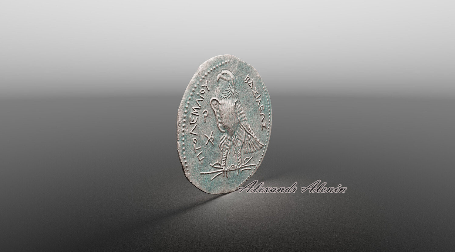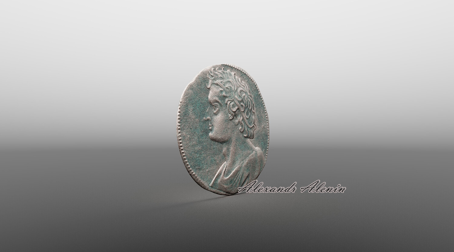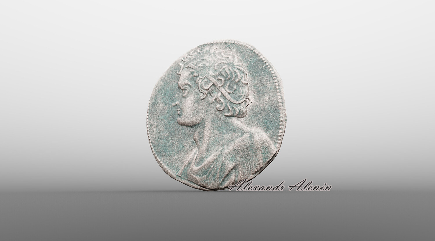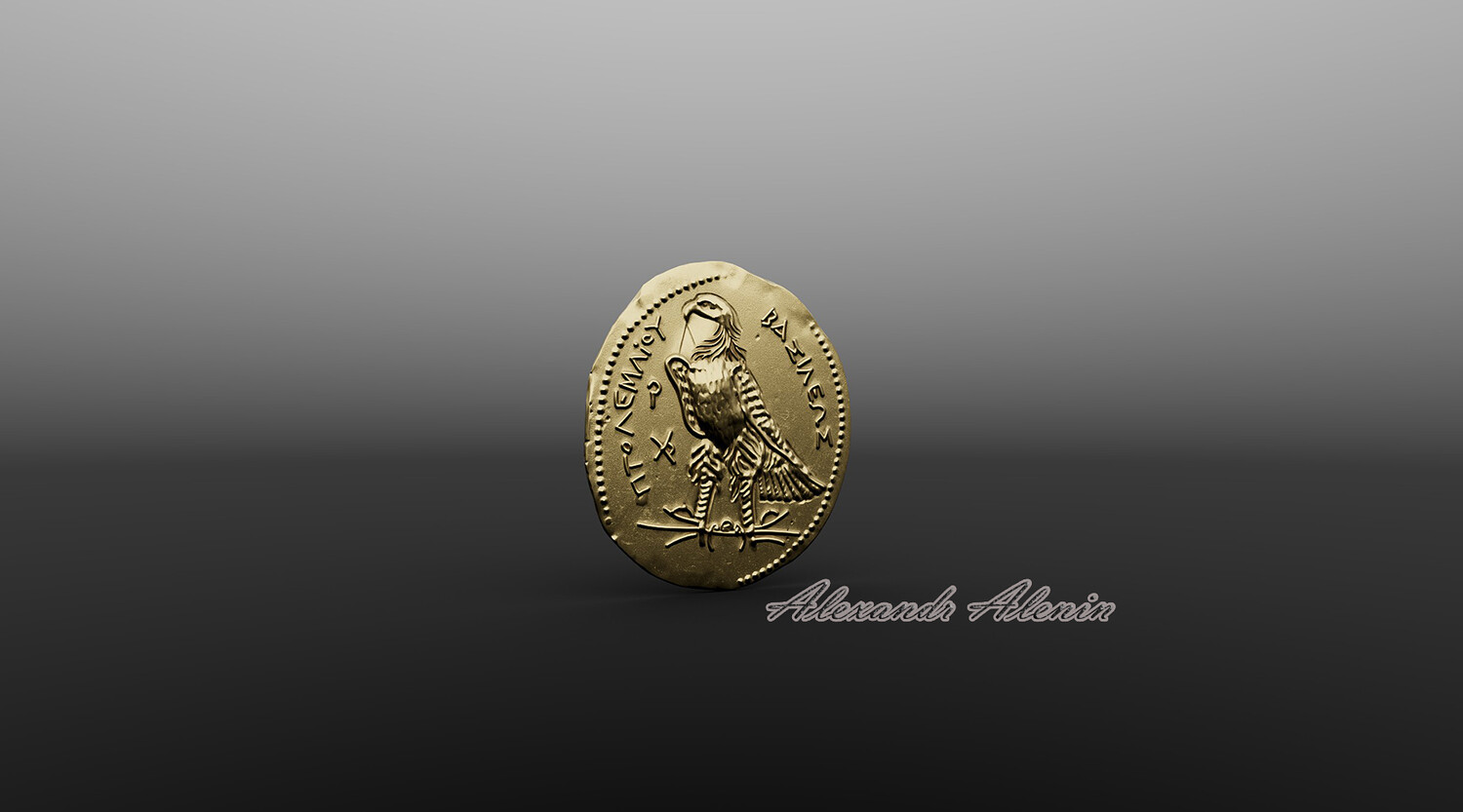 3D model of an antique coin with the image of Old Ptolemy. In the archive you will find High and Low poly models and 2 typs textures (Gold and Bronz). (FBX)