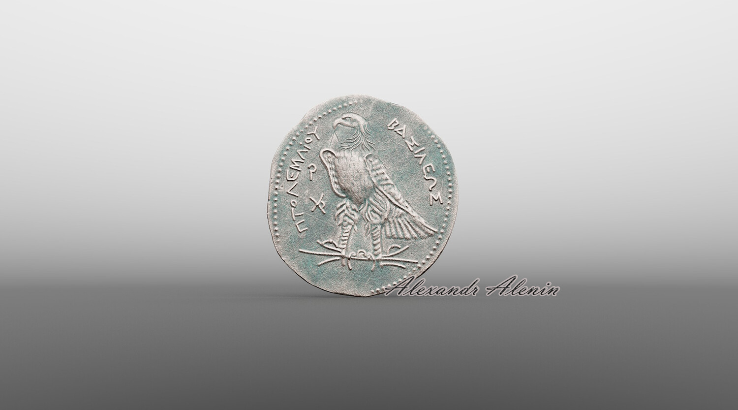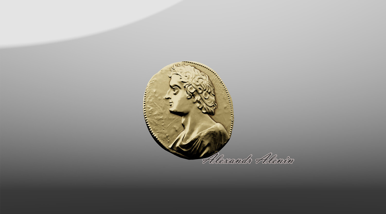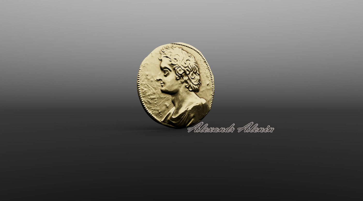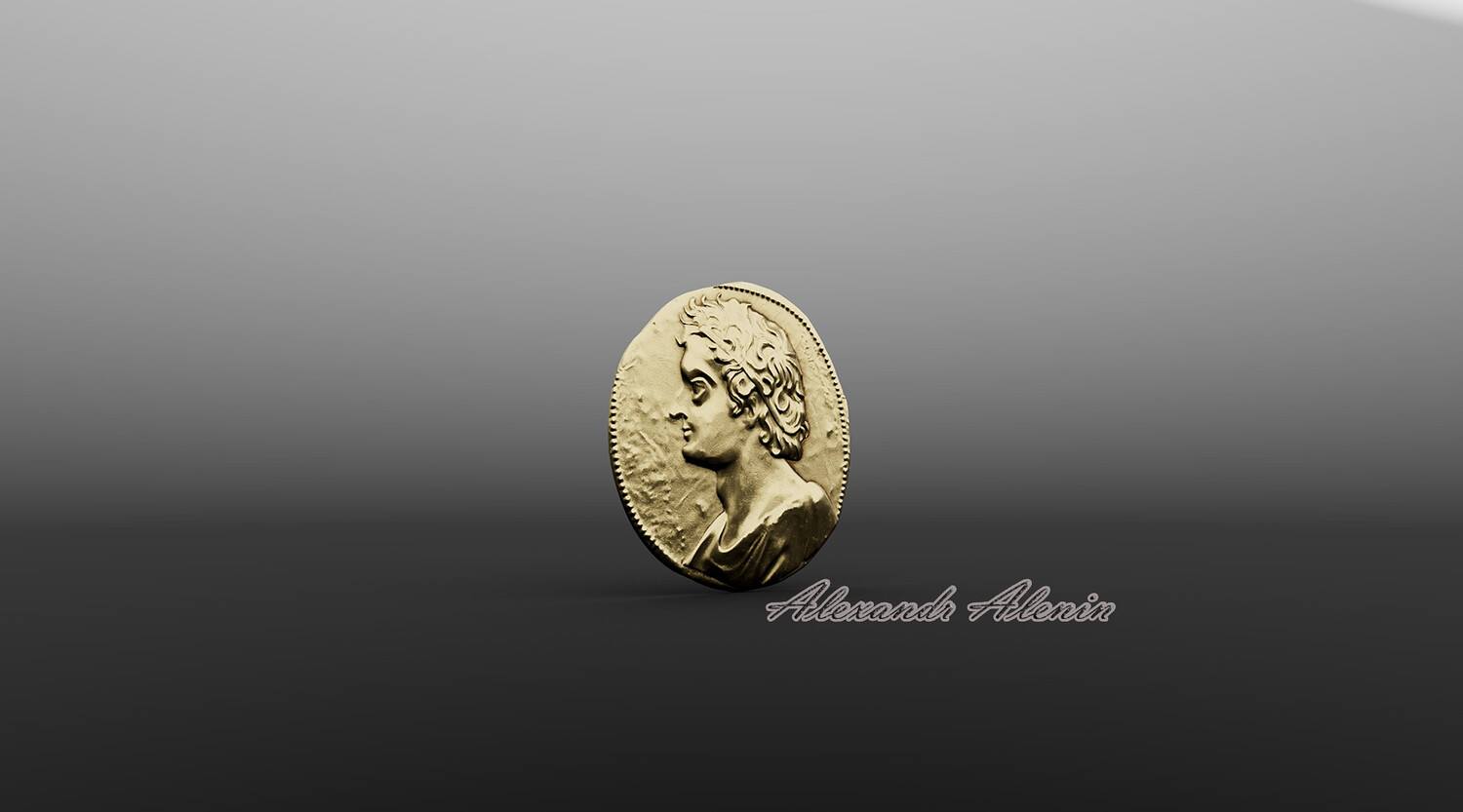 3D model of an antique coin with the image of Old Ptolemy. In the archive you will find High and Low poly models and 2 typs textures (Gold and Bronz). (FBX)