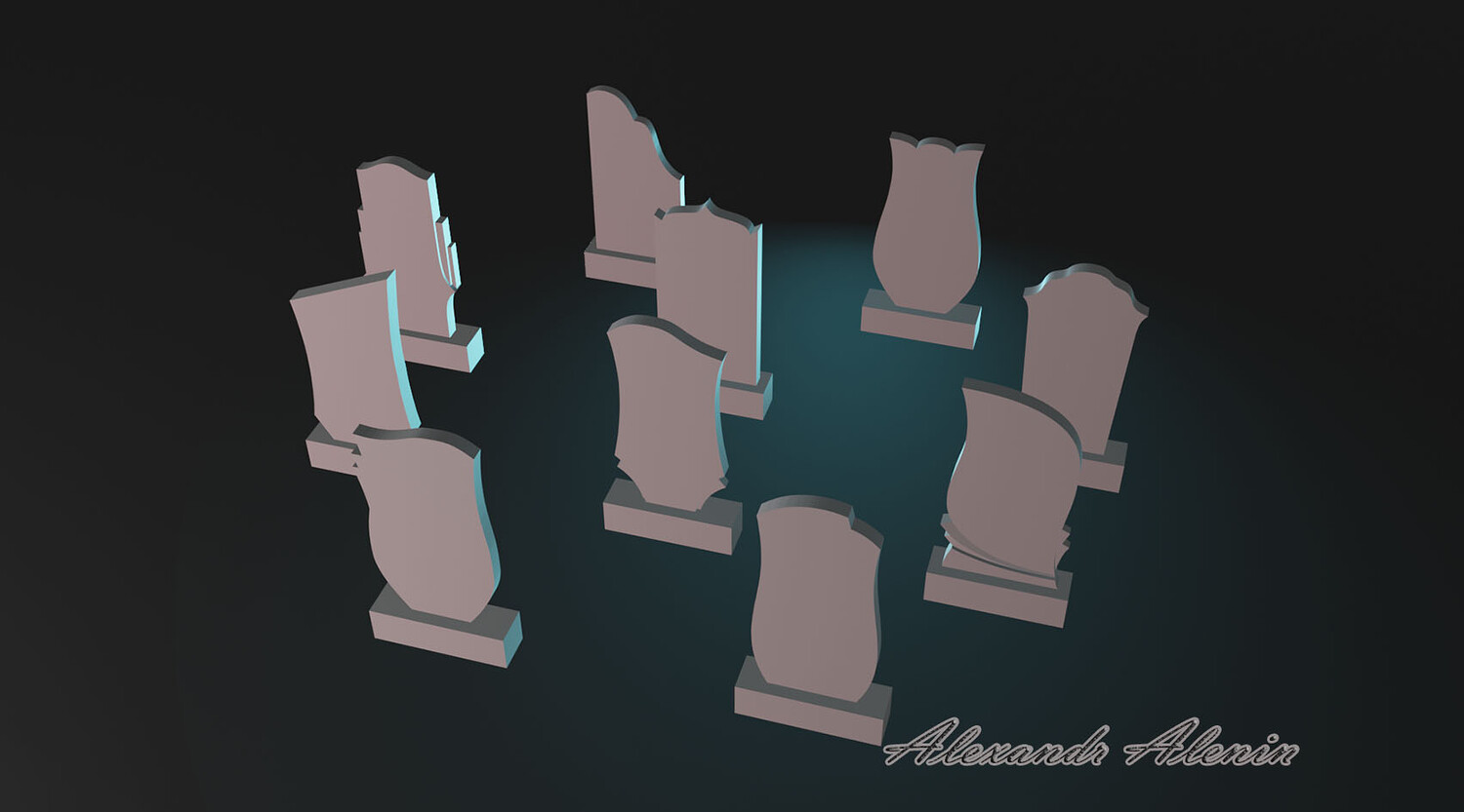 In the archive you will find 3D models of tombstones, 10 pieces of different shapes for your creative projects.