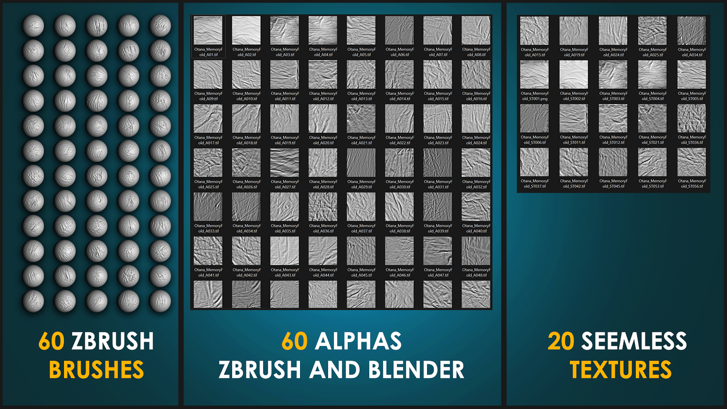 This is a pack of 60 Zbrush Memory Fold brushes + Alphas to use, 20 of them are well prepared as seemless textures to be used as generic memory fold pattern in any software, like Zbrush, Blender, Substance painter or even Substance designer.