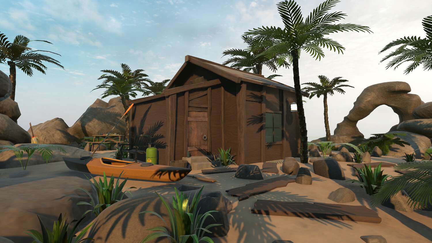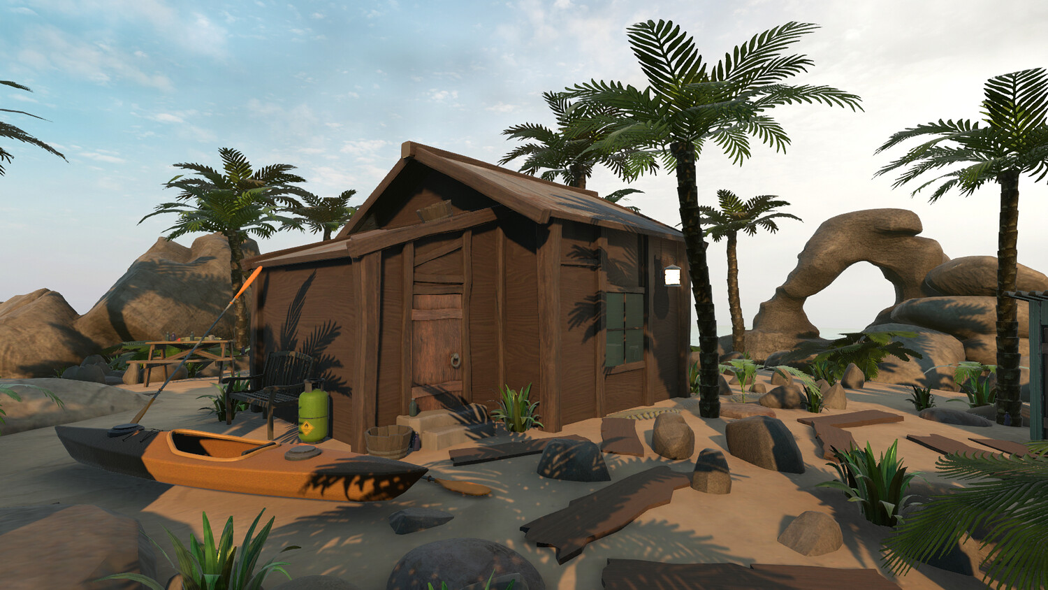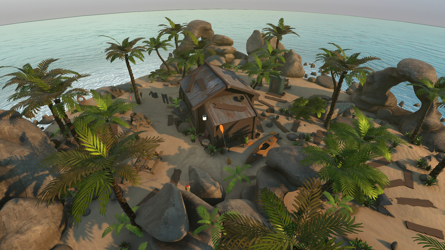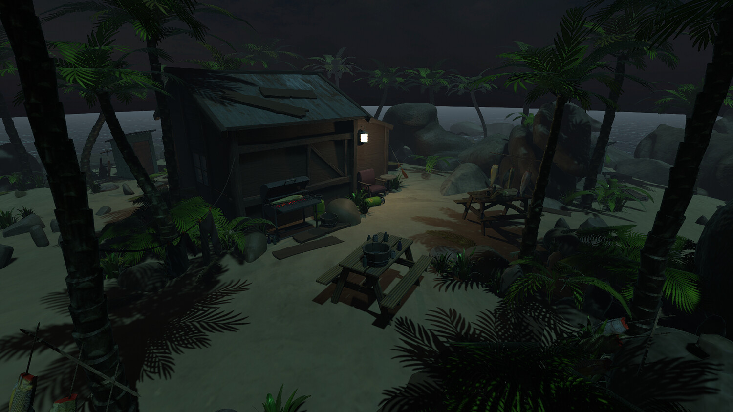 Inside this small cabin beachfront island scene, you'll find a variety of assets, from the wooden cabin, outhouse, rowboats, picnic tables, grills, benches, armchairs, planks, fishing gear, gas canisters, clothesline and plenty of foliage such as palm trees, plants, ferns, grasses, rocks, boulders and cliff formations and much more!