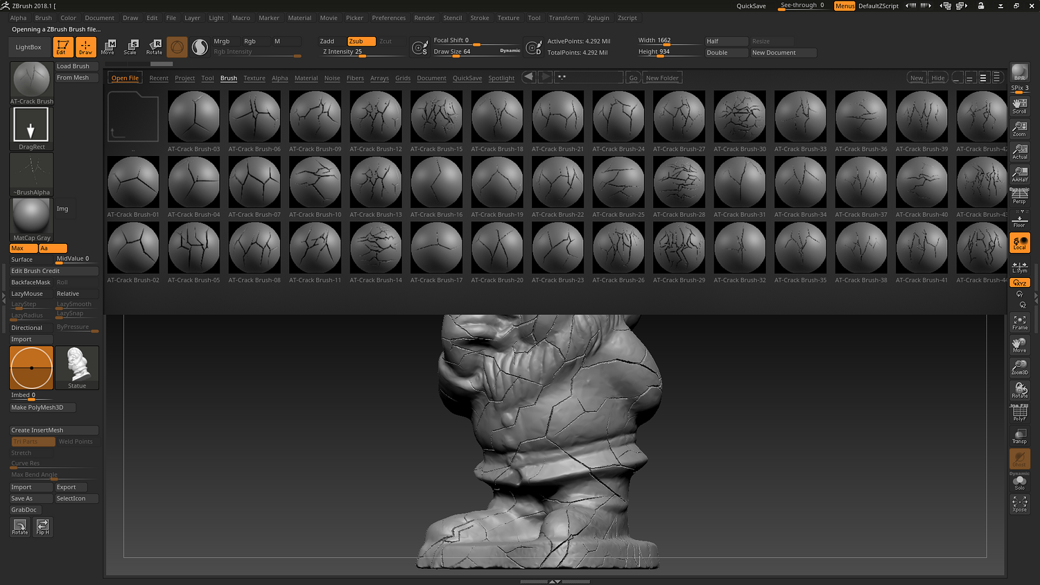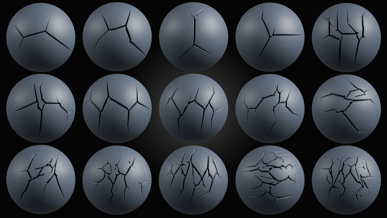 This brush set is designed for creating realistic crack details on a wide range of surfaces. It is suitable for hard surface assets, rocks, concrete, walls, terrain, sculptures, statues, pottery and damaged or aged objects. The brushes provide clean and controlled crack patterns, allowing you to add surface detail quickly without heavy manual sculpting. These brushes work well for both high poly sculpting and detail enhancement during the sculpting stage. They are optimized for efficient workflows and can be used in various projects, including environment assets, props, and realistic surface studies.