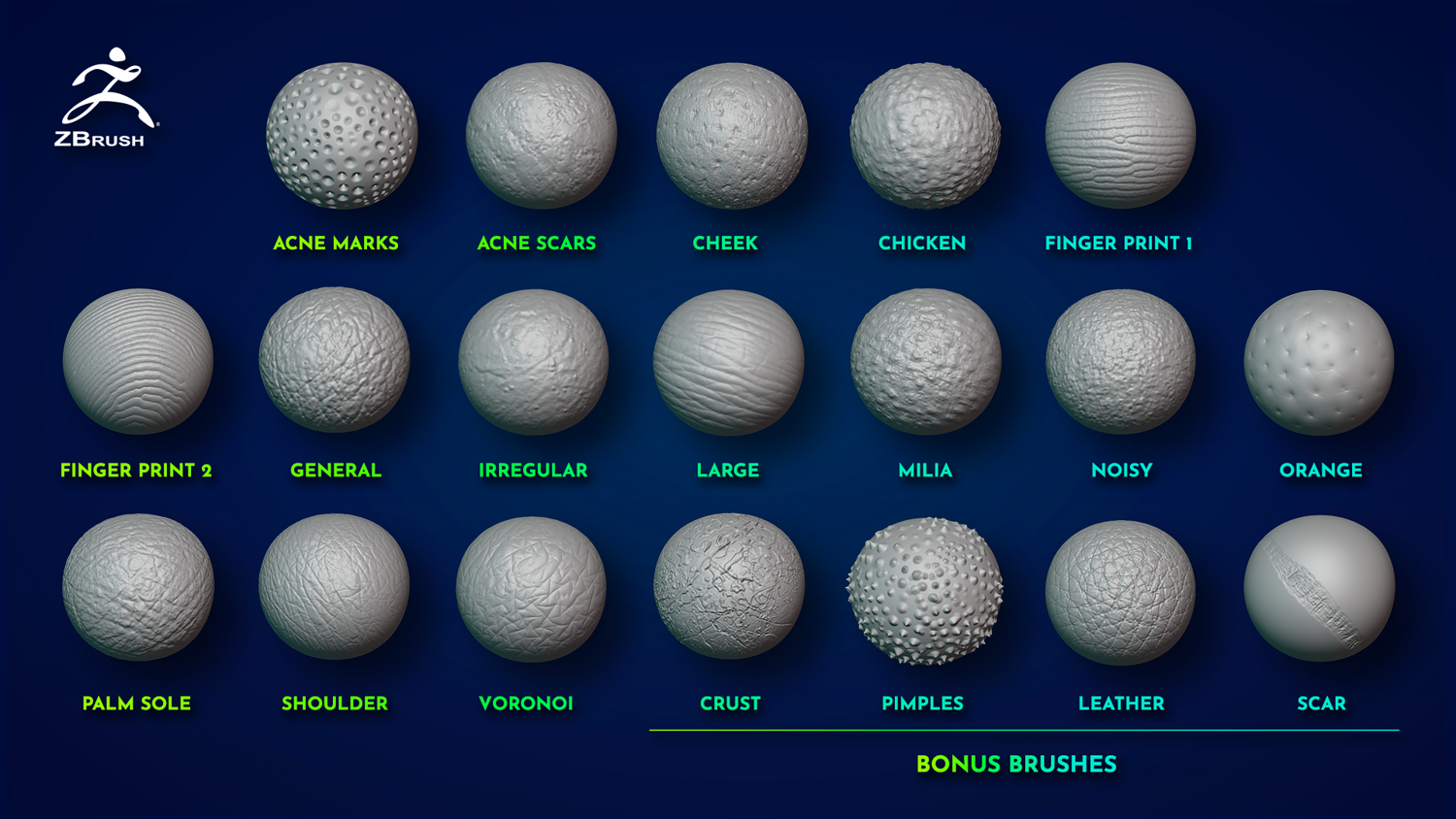 This pack contains 15 Brushes + 4 bonus brushes for Zbrush to add Human Skin microdetails to you characters.