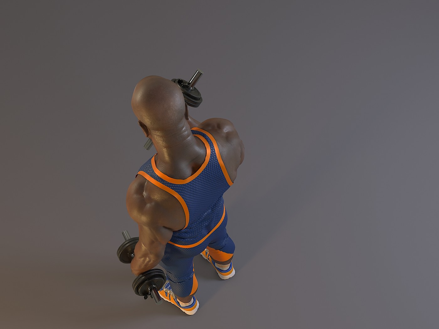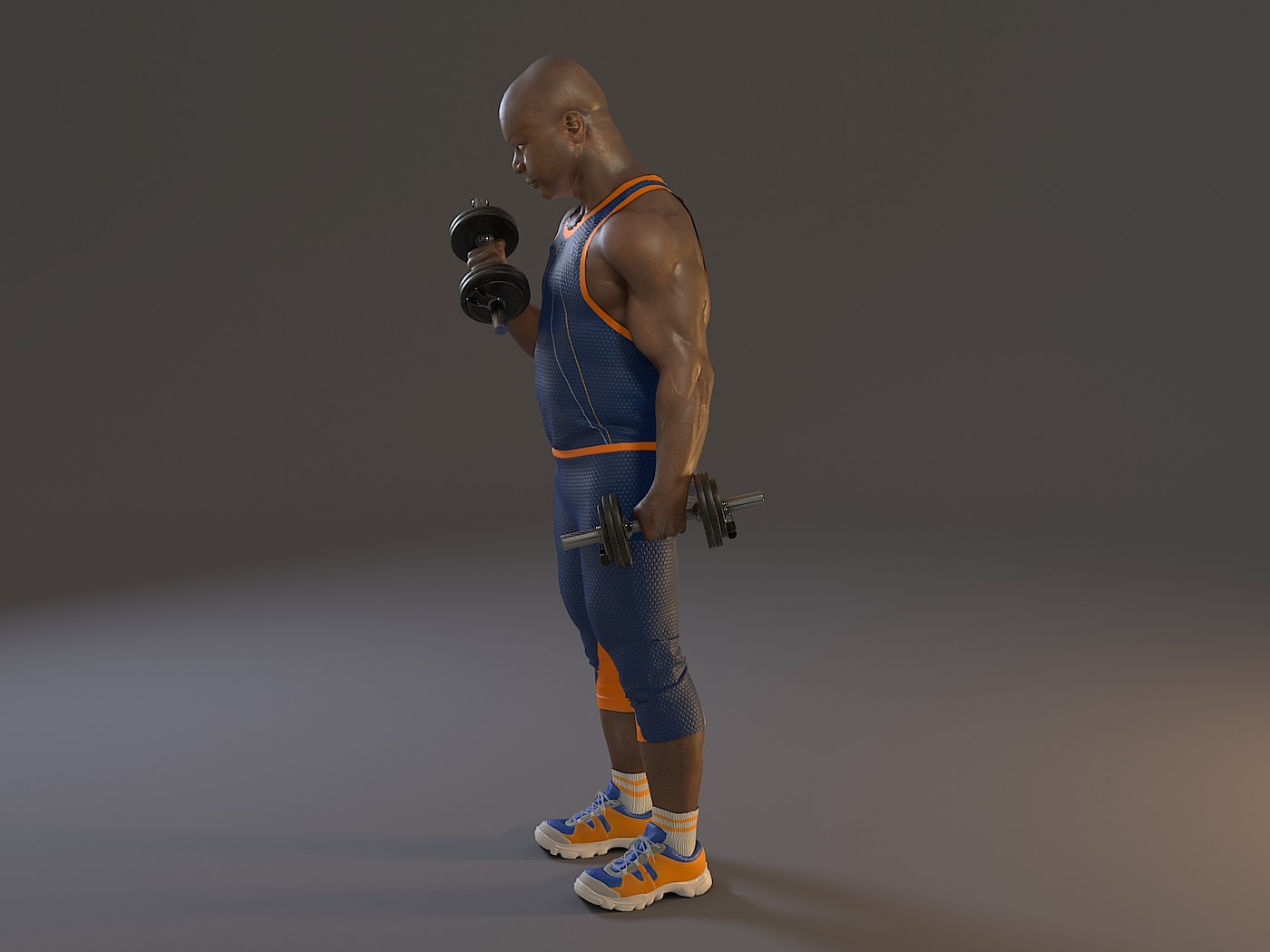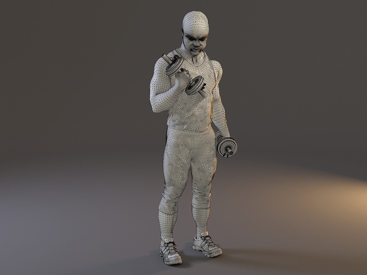 Male model with dumbbells, fitness swit and fitness sneakers.