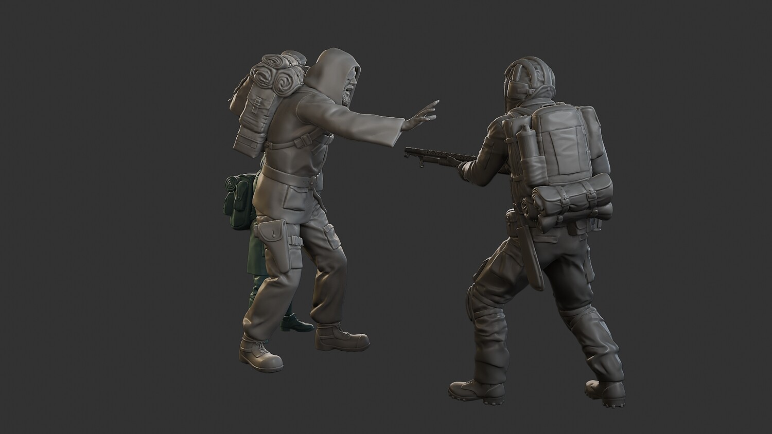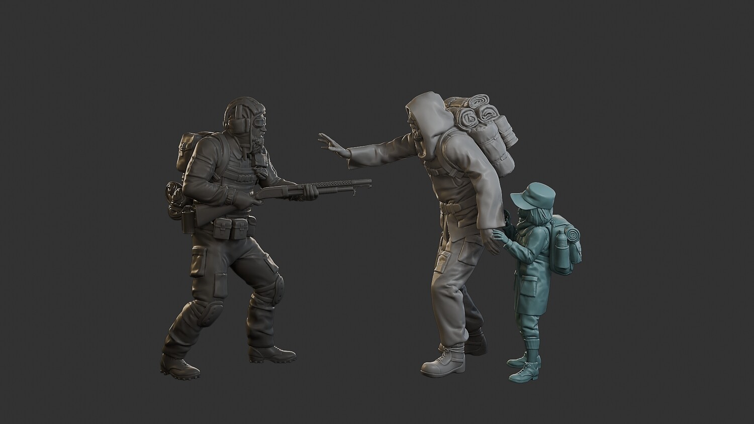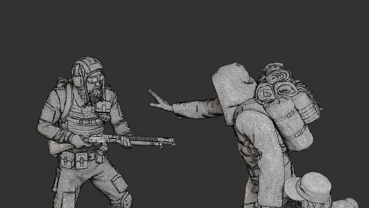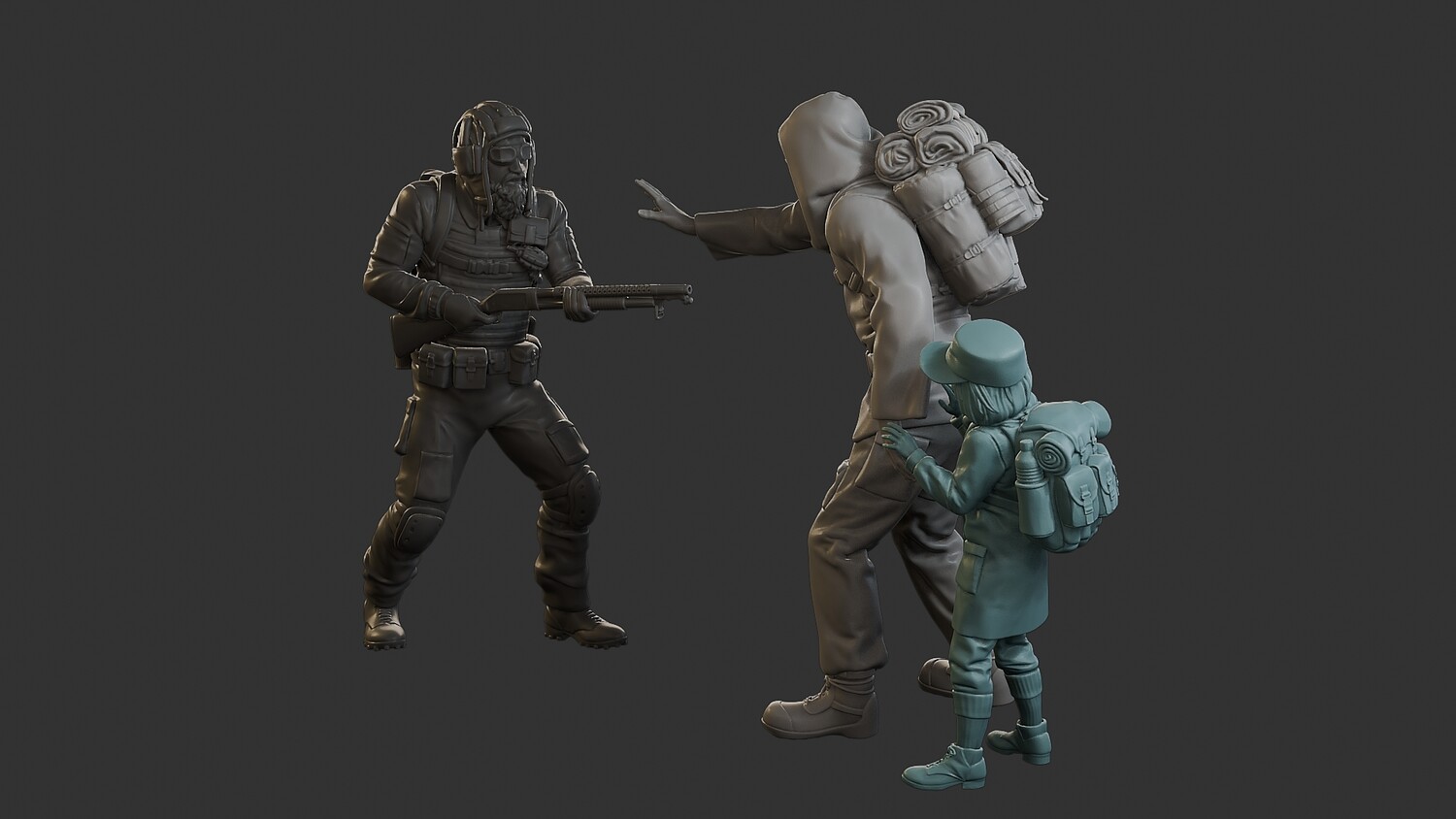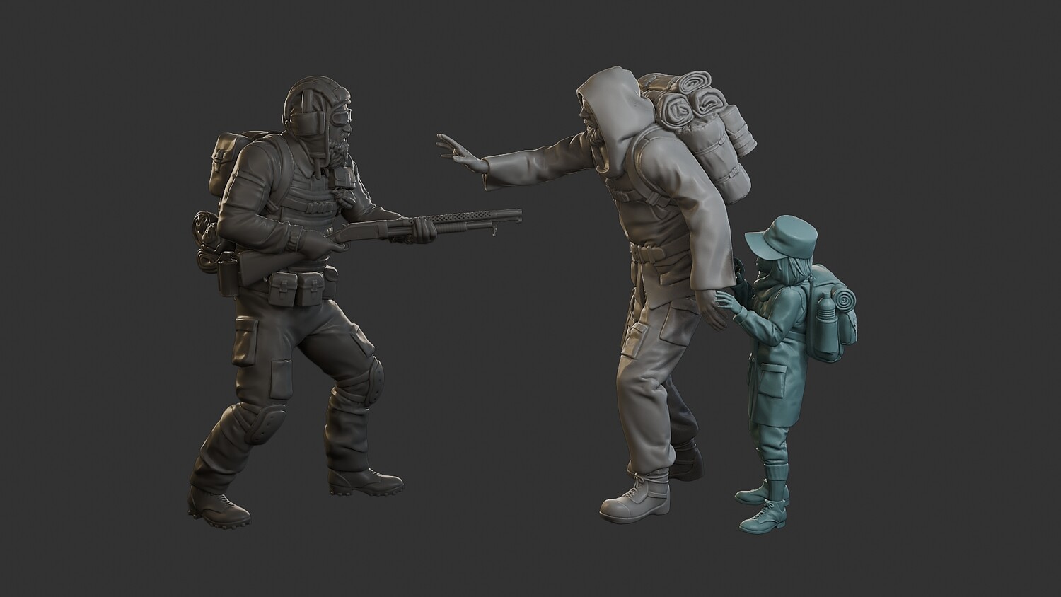 - Post-Apocalyptic Male and female models with we0pons, equipment, and clothing in different poses and actions.