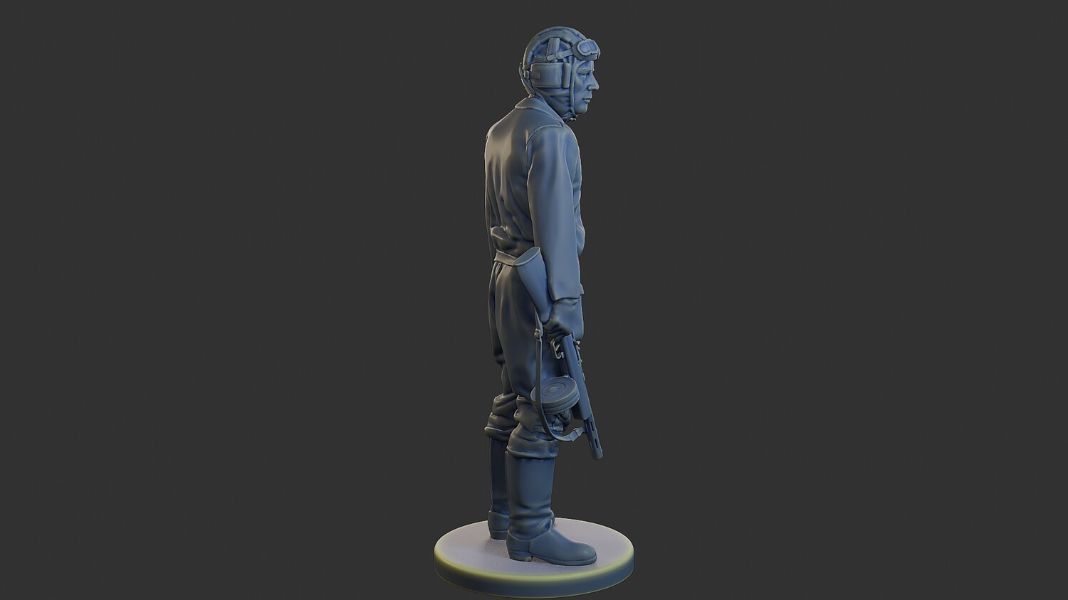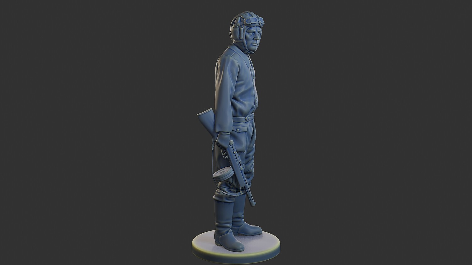 Highly detailed 3D printable model of a Russian Soviet Soldier from World War II, representing a member of the Soviet Tank Crew in action. This 3D model captures and represents an era and moment of action in history with great Fidelity and authentic uniform details, equipment, and realistic proportions. Perfect for collectors, modelers, and 3D printing professionals who seek historical accuracy and artistic quality.