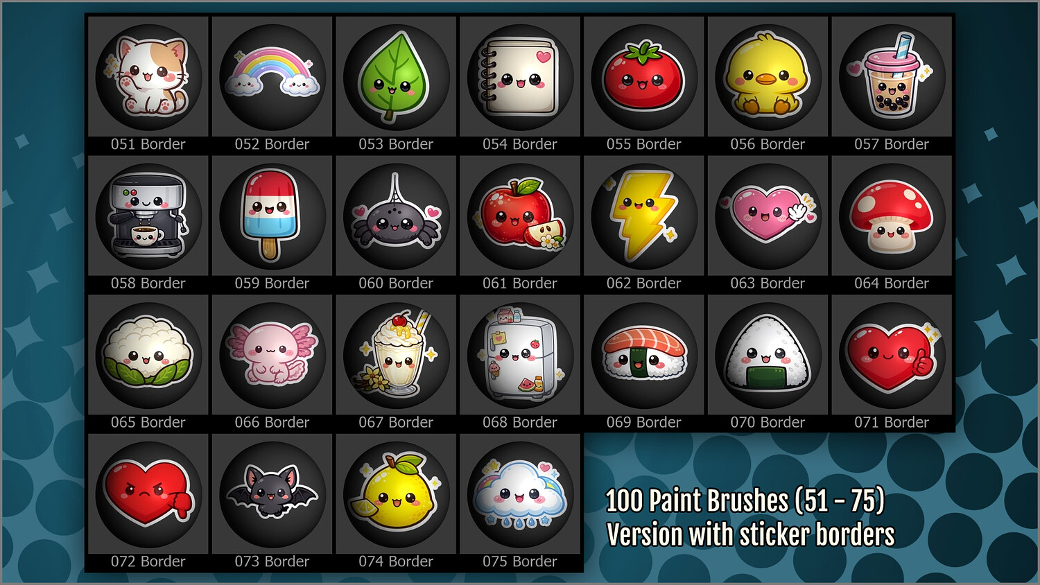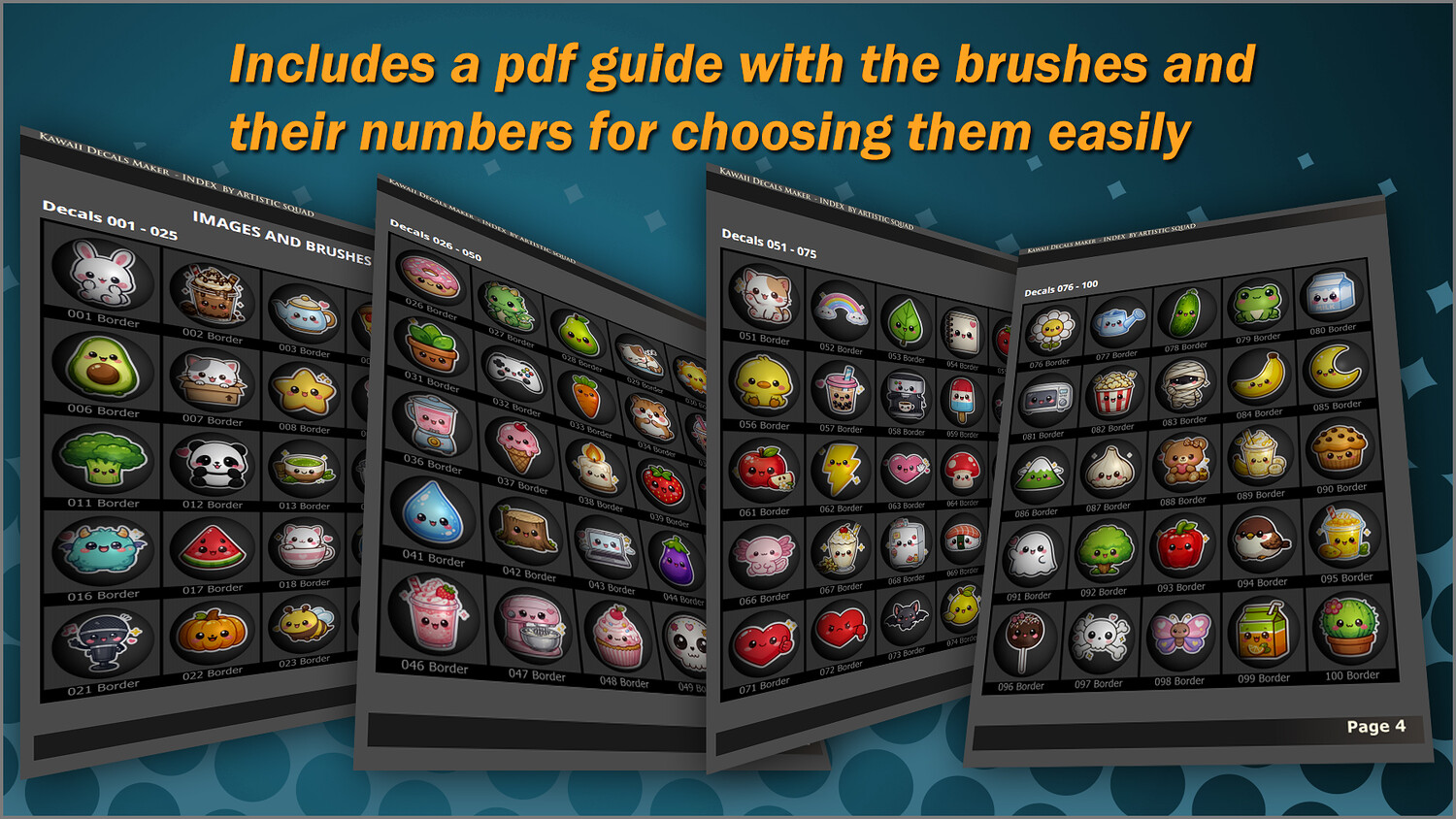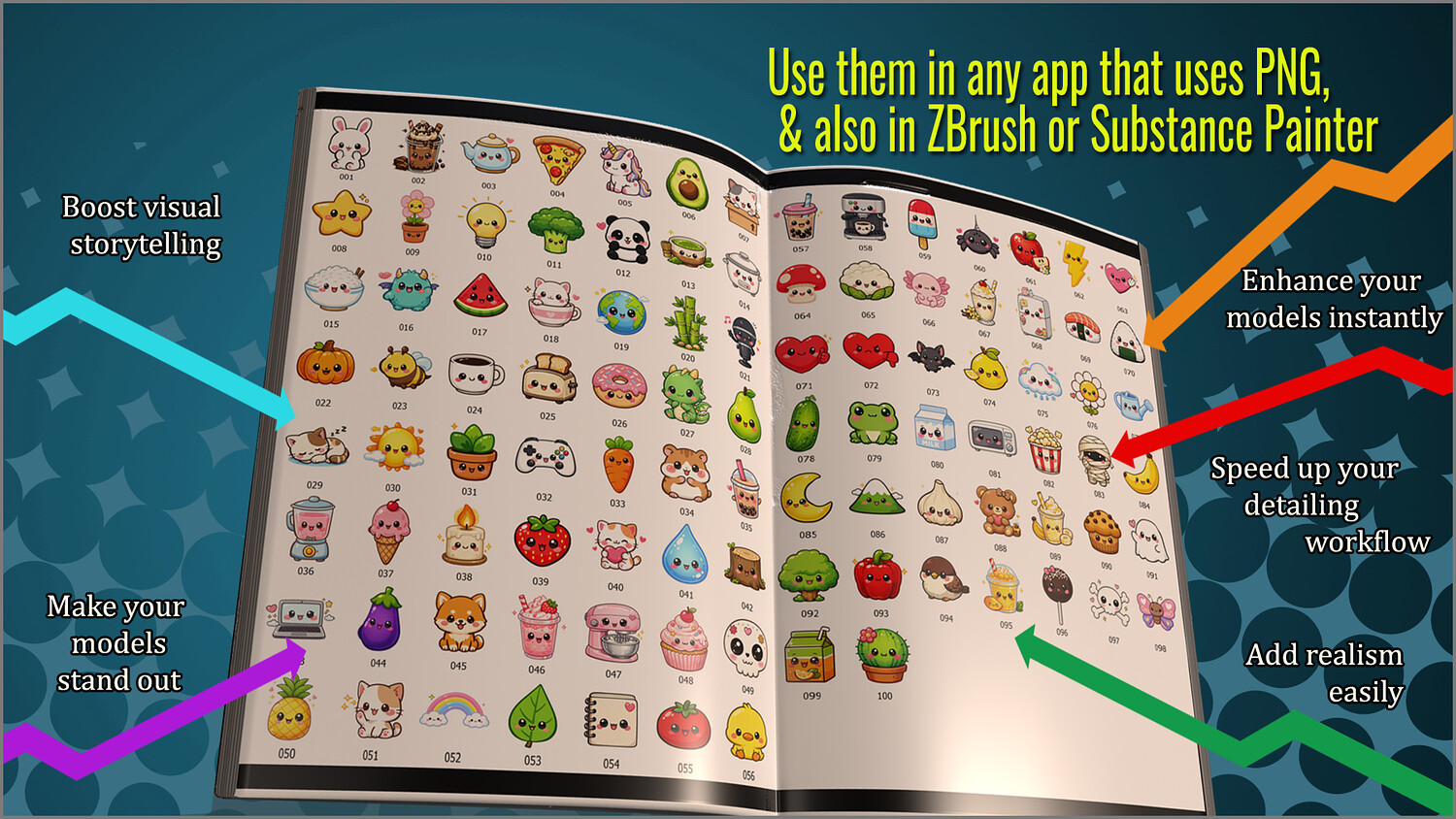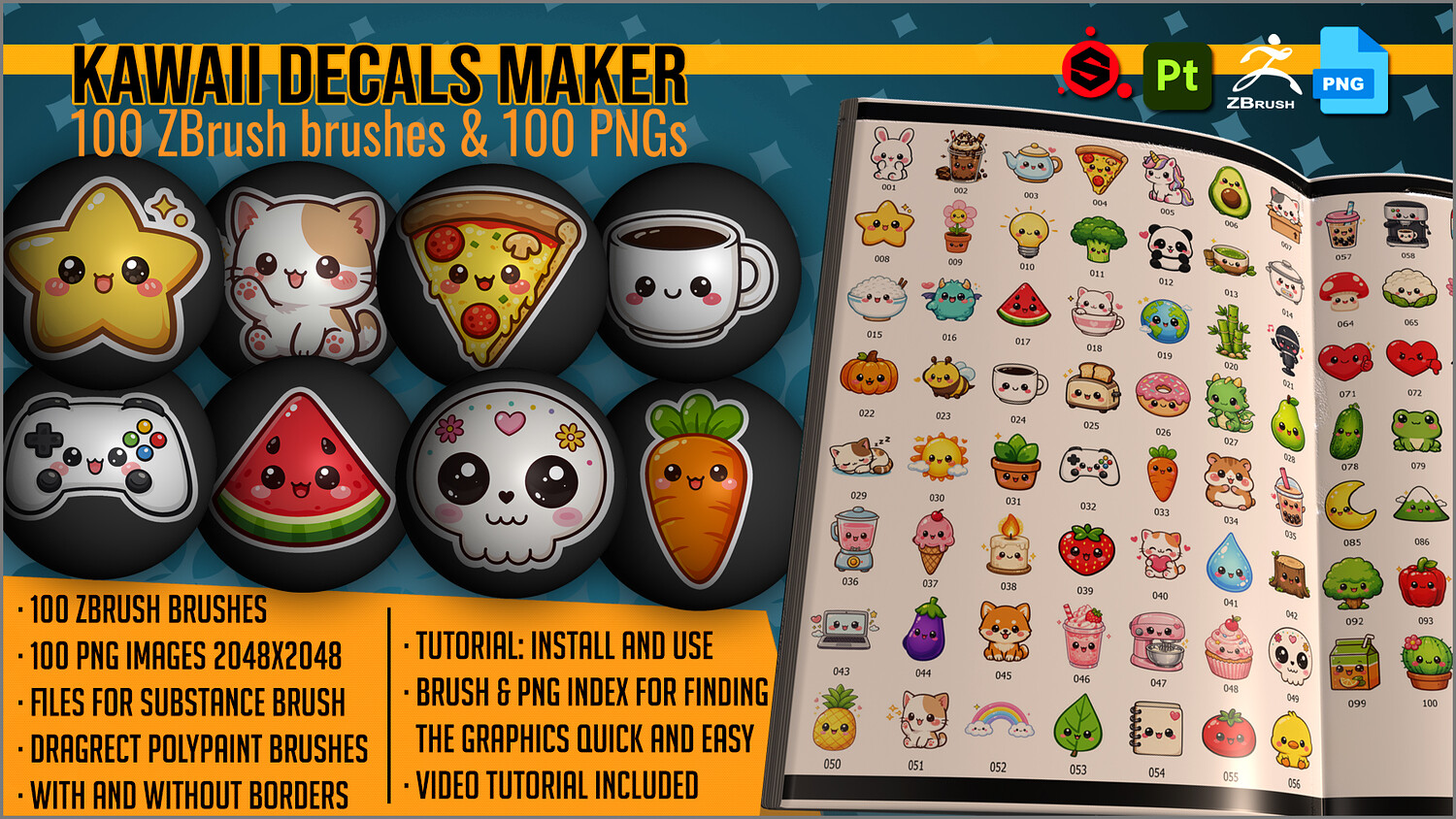 Get this megapack of *100 Kawaii Decals in PNG for any graphics editor, plus brushes for ZBrush and files for Substance Painter or any 3D painting app. * Save time, deliver more detail and depth to your models!