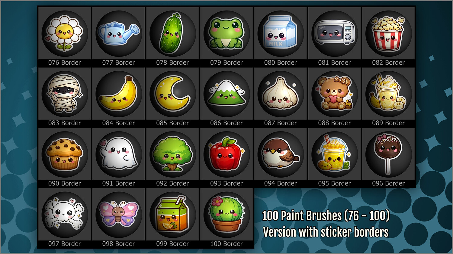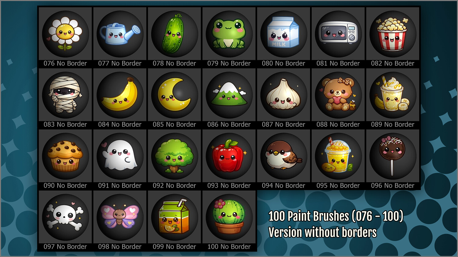 - 100 pre-configured ZBrush polypaint brushes, in two versions (with or without borders). Just load and drag. No setup required.