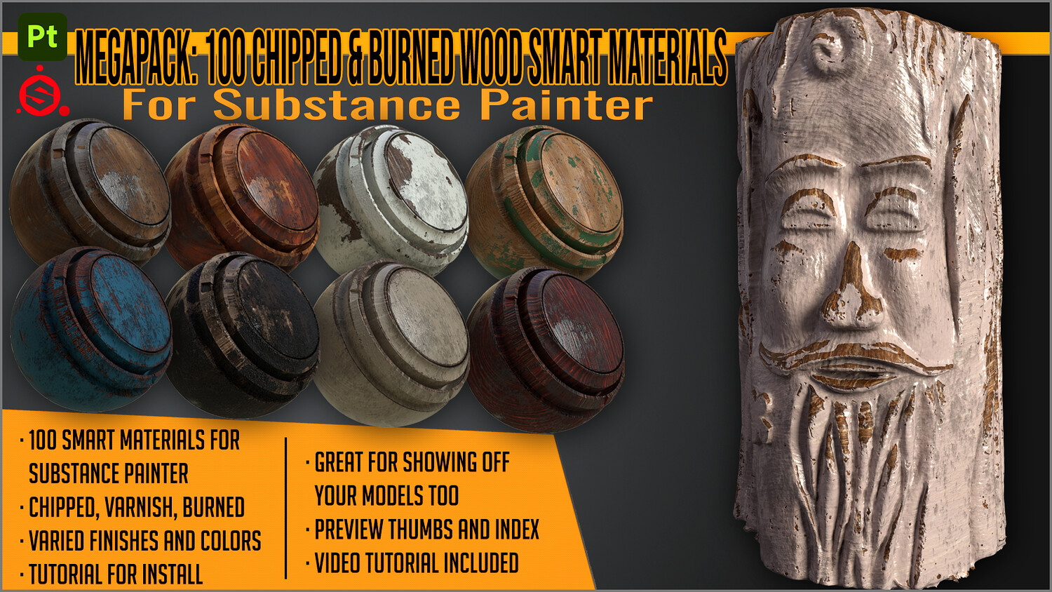 Get this megapack of 100 Chipped & Burned Wood Smart Materials for Substance Painter, in many colors and finishes, is prepared for drag and drop on your model. They are ready to look good on most lights, providing you with the chipped paint, weathered, damaged or burned wood that you need for your works.