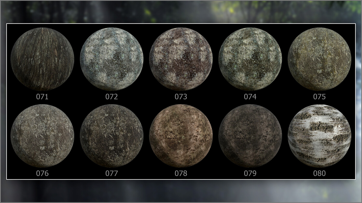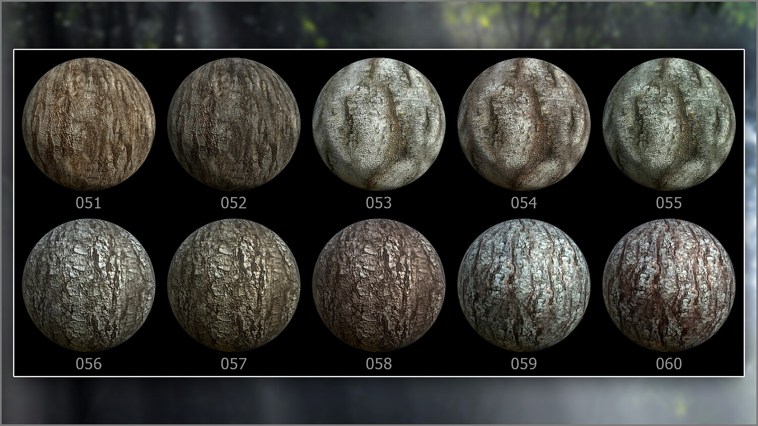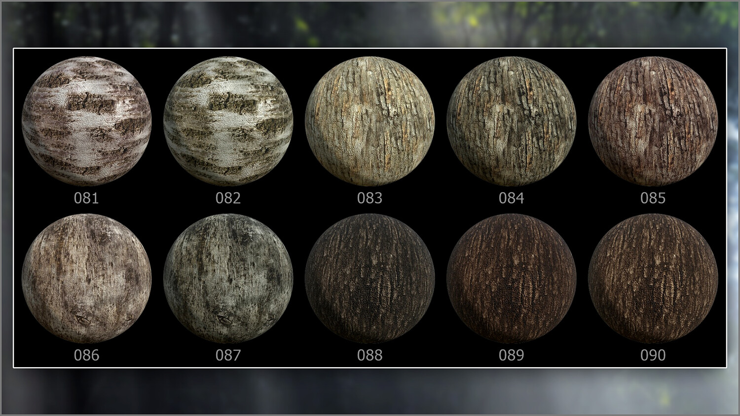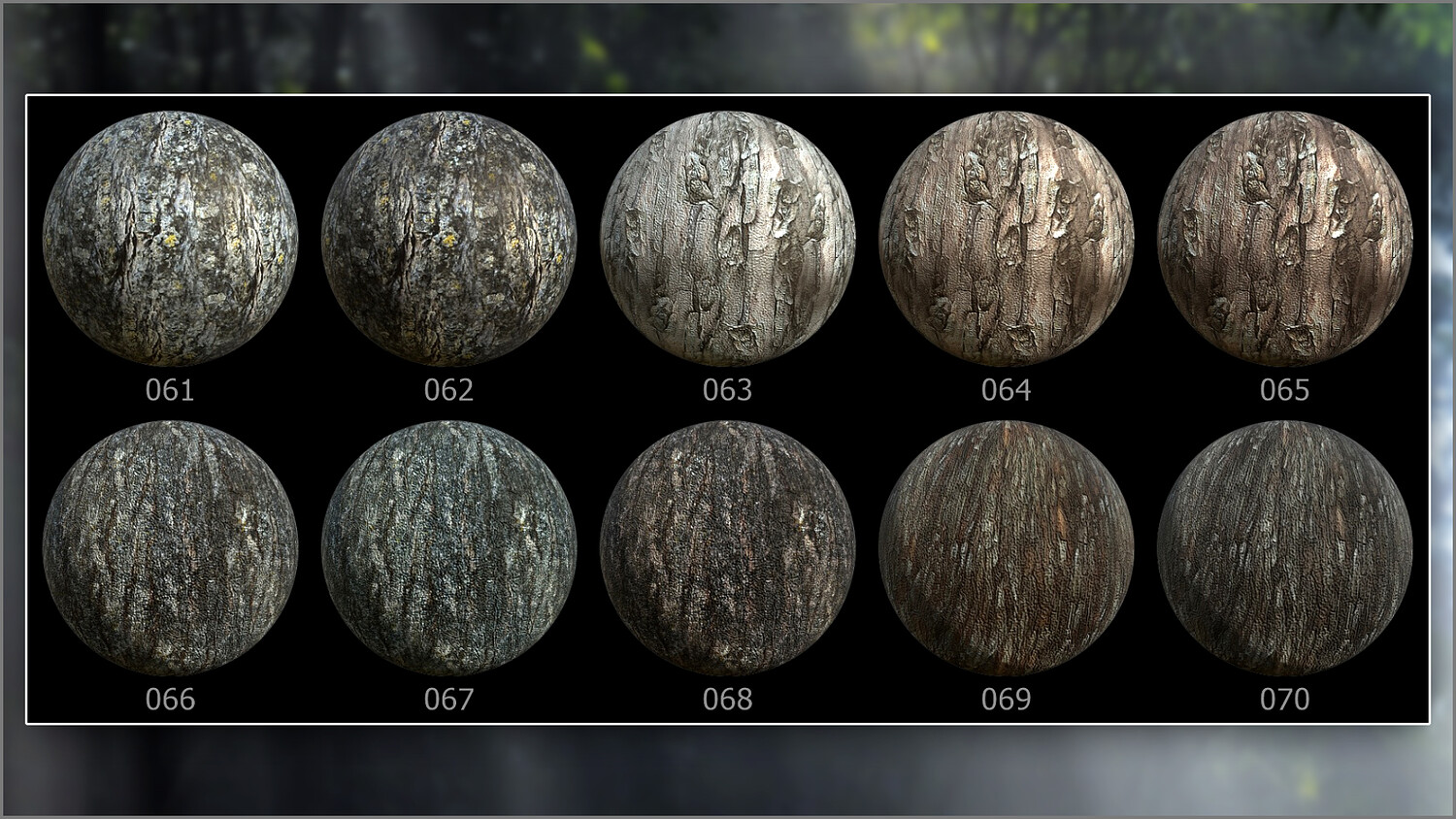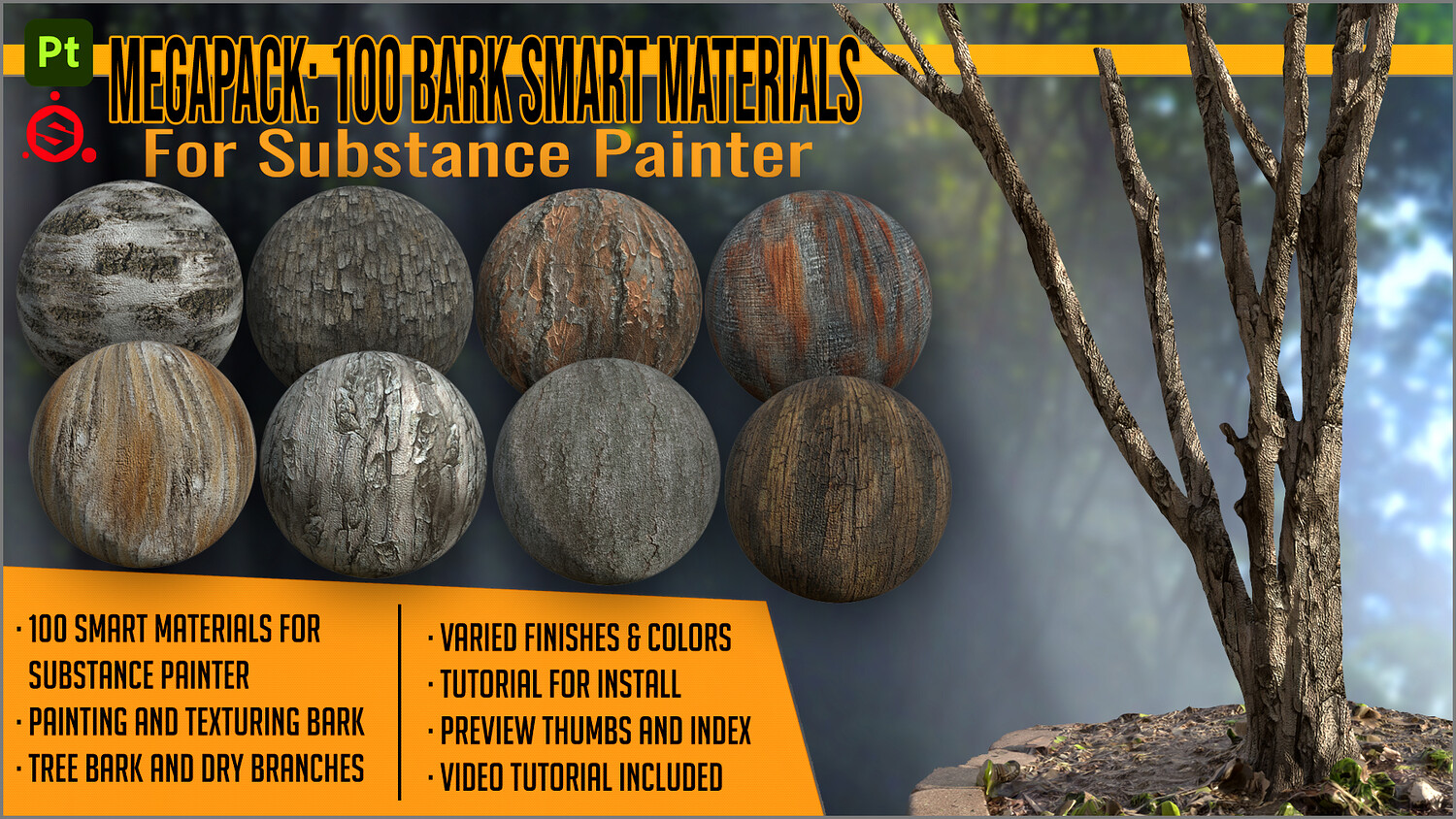 - 100 Smart materials for Substance Painter of different bark textures, finishes and colors.