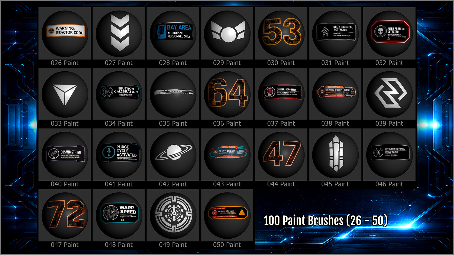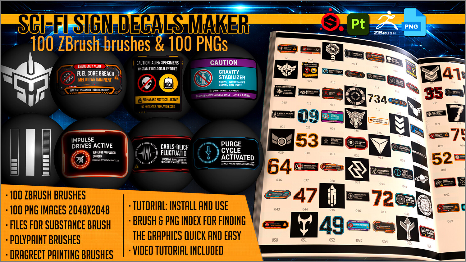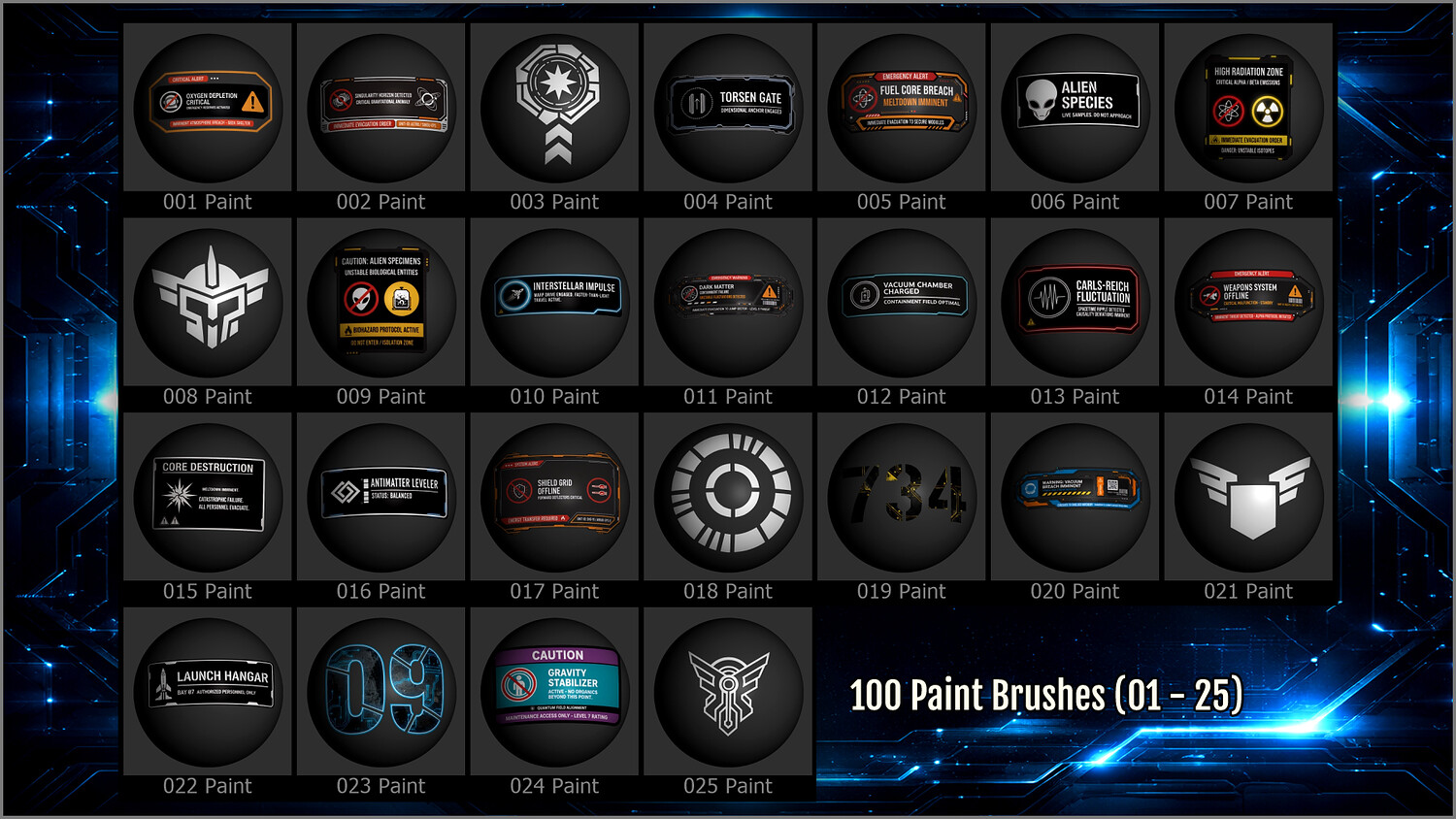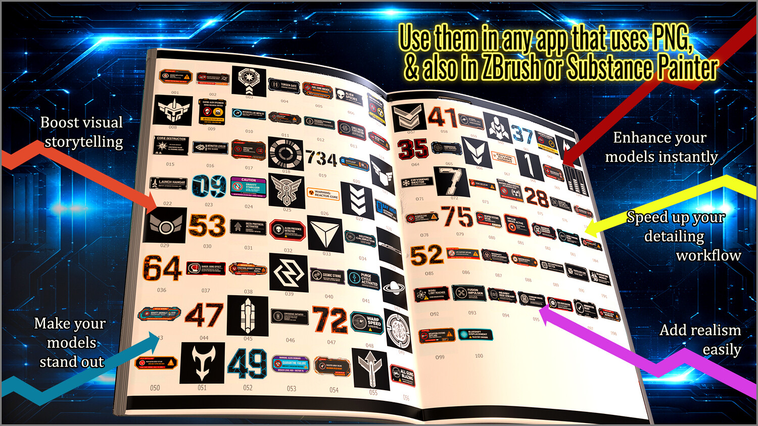 Get this megapack of 100 Sci-Fi Sign Decals in PNG for any graphics editor, plus brushes for ZBrush and files for Substance Painter or any 3D painting app.