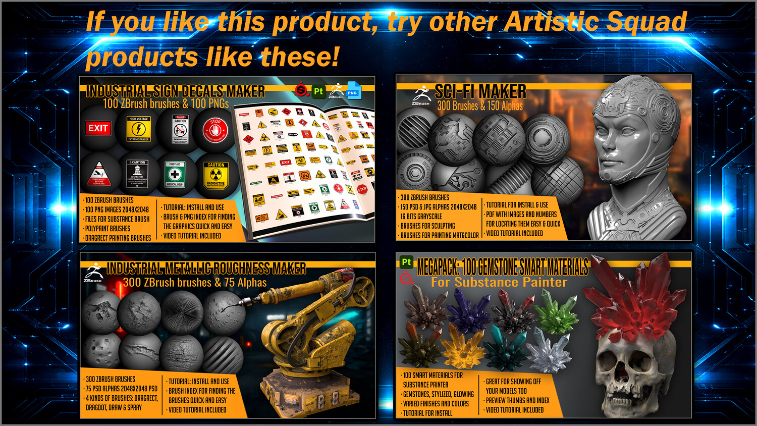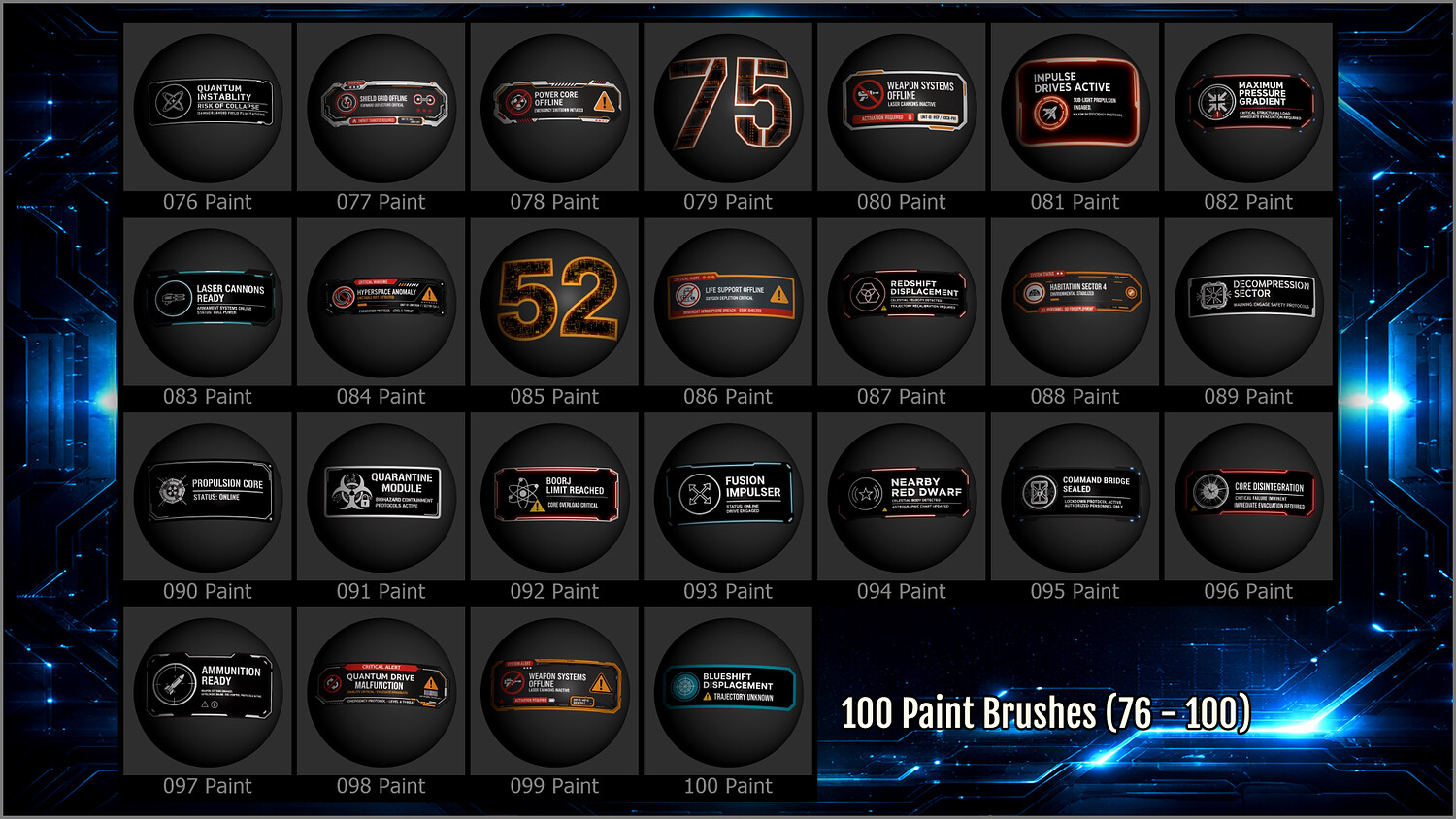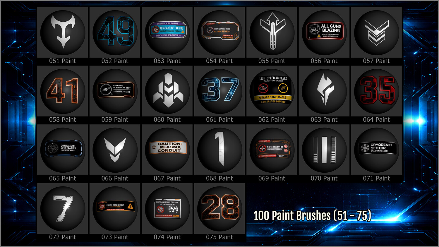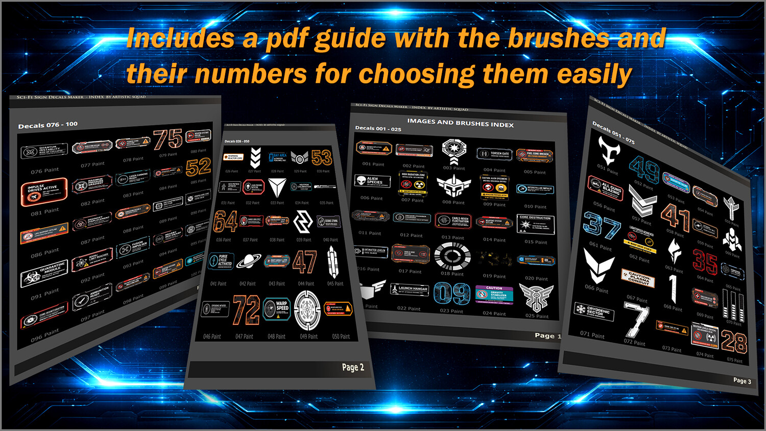 Get this megapack of 100 Sci-Fi Sign Decals in PNG for any graphics editor, plus brushes for ZBrush and files for Substance Painter or any 3D painting app.