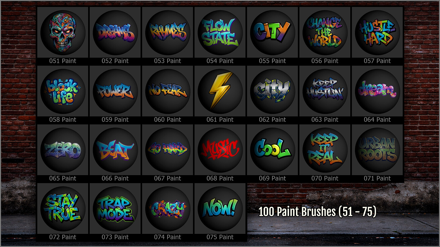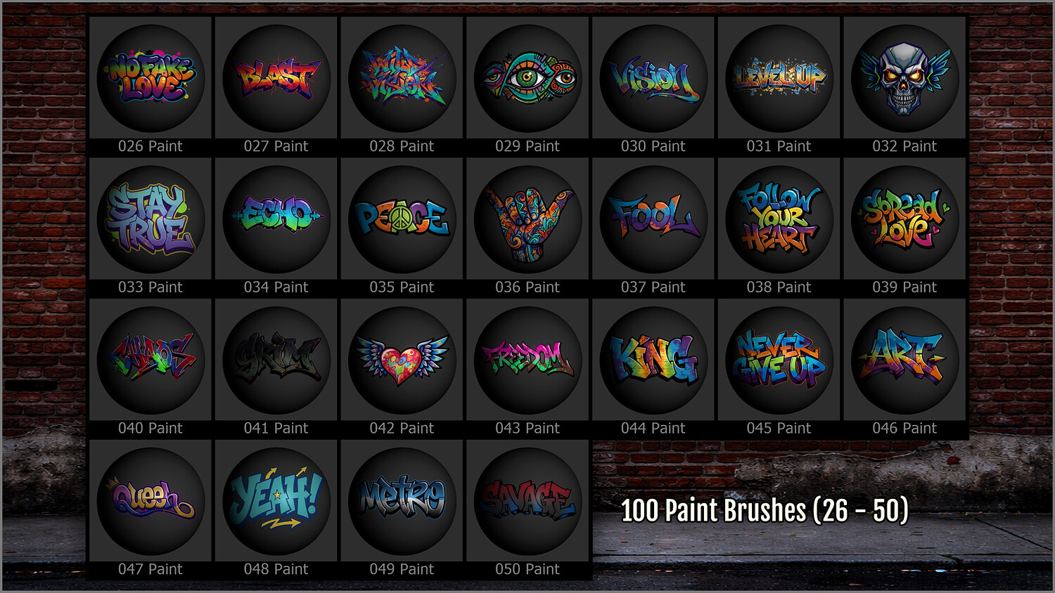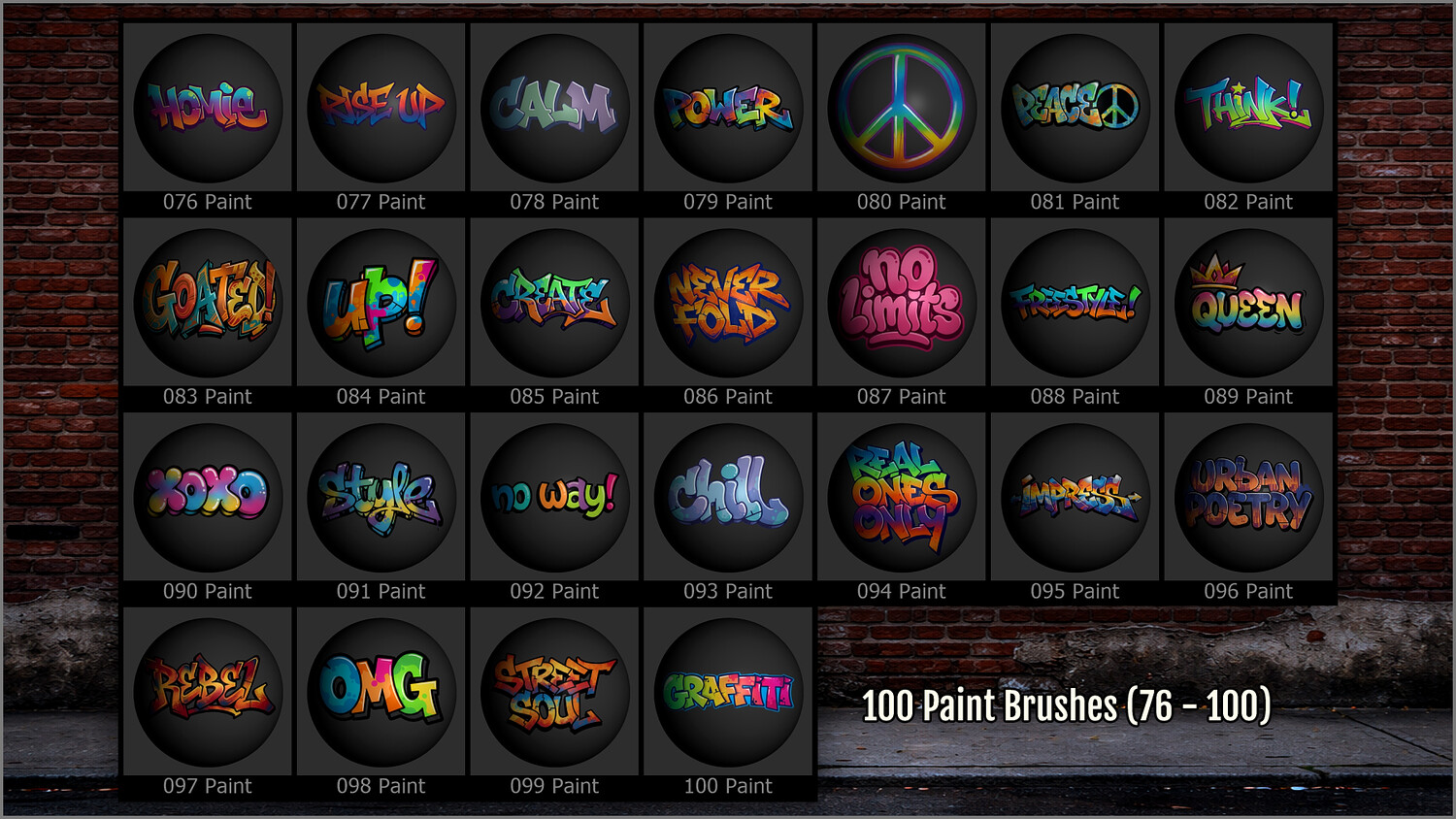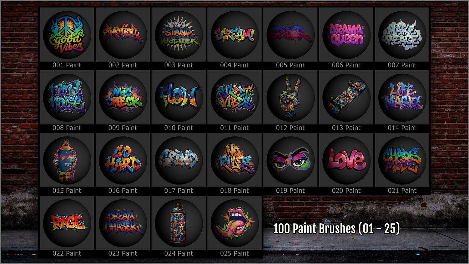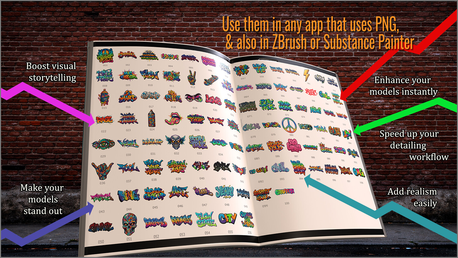 They include a wide range of graffiti tags, throw‑ups, stencils, stickers, expressive lettering, bold phrases, street symbols, and urban graphics, perfect for giving your scenes a gritty, lived‑in, and contemporary look.