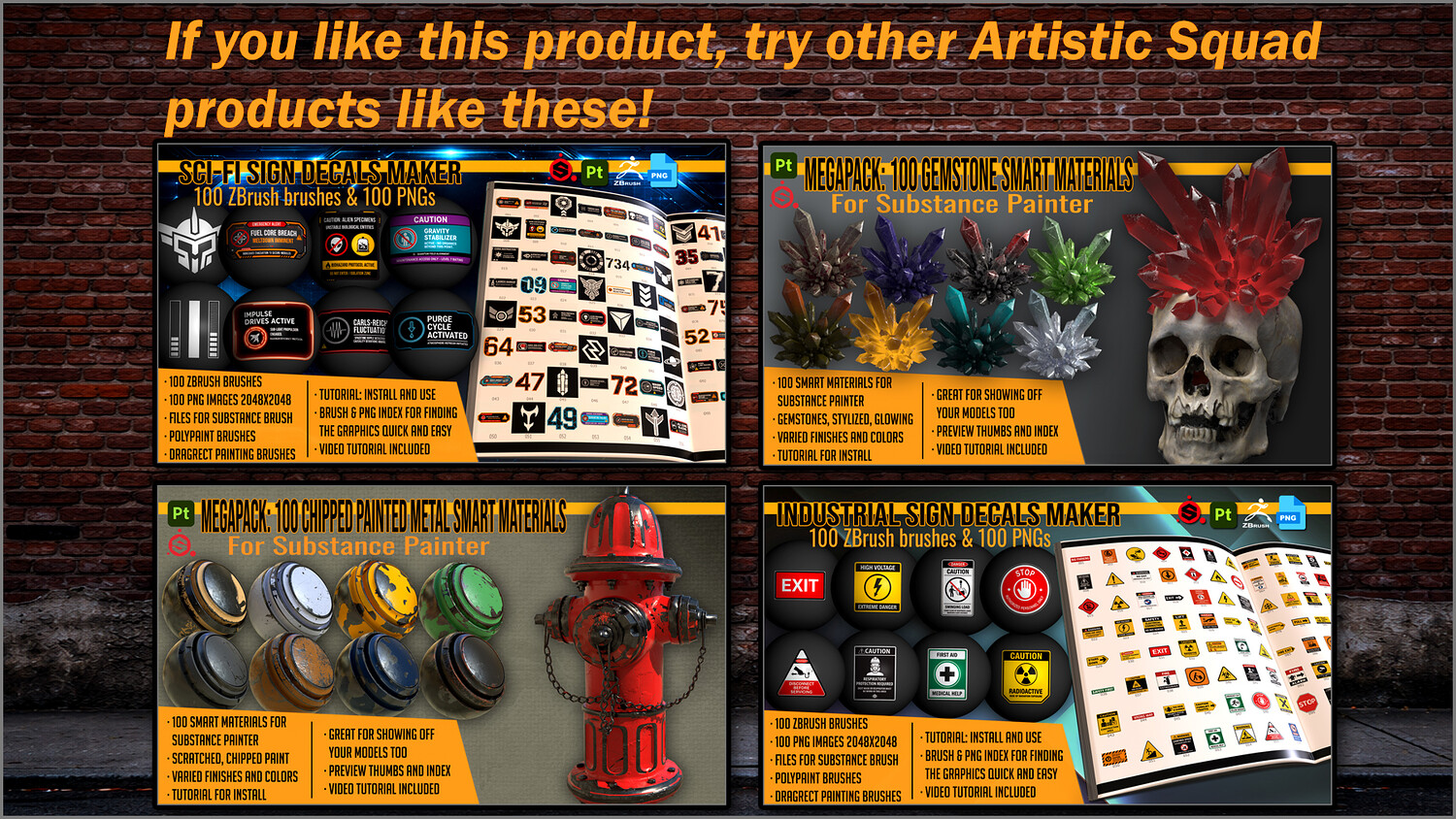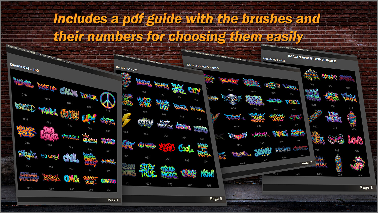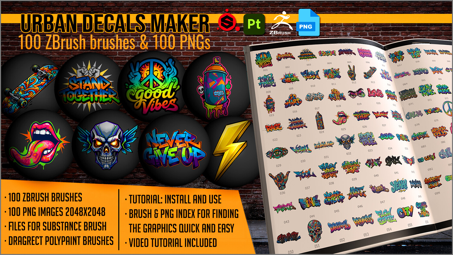 Get this megapack of 100 Urban Decals in PNG for any graphics editor, plus brushes for ZBrush and files for Substance Painter or any 3D painting app.