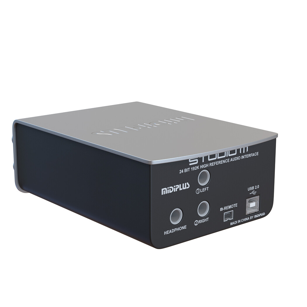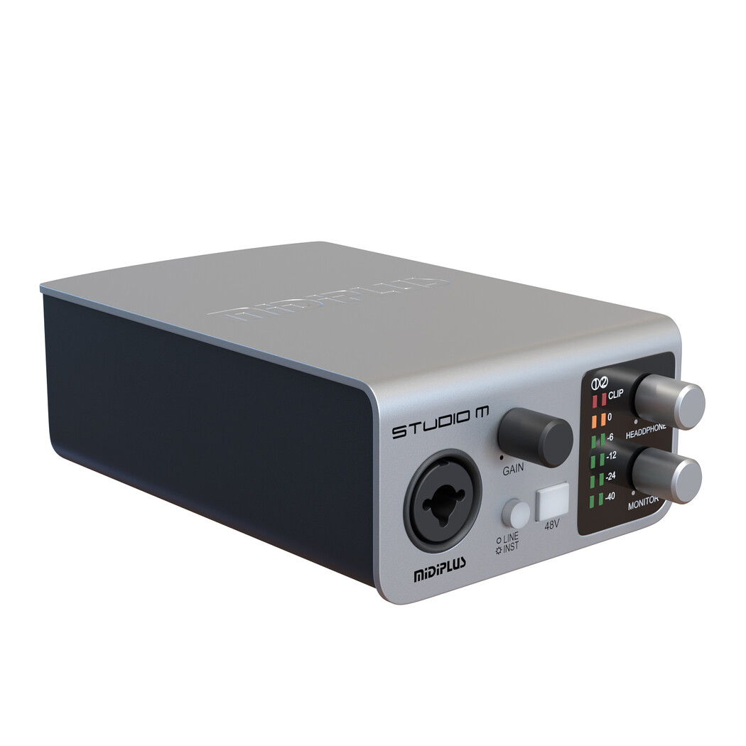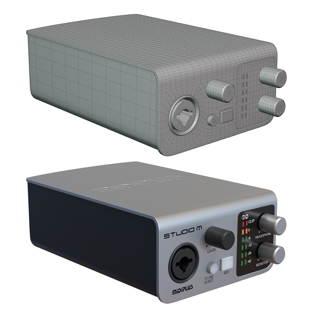 High-quality realistic 3D model of the Midiplus Studio M audio interface designed for professional music production, recording, and sound engineering projects. The model turbosmooth ready, represents the original hardware design, including detailed input/output ports, knobs, buttons, and front panel layout.