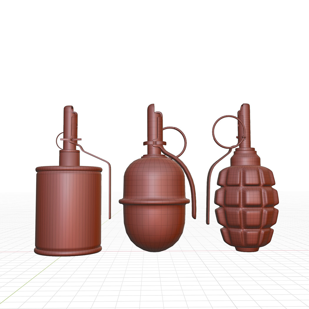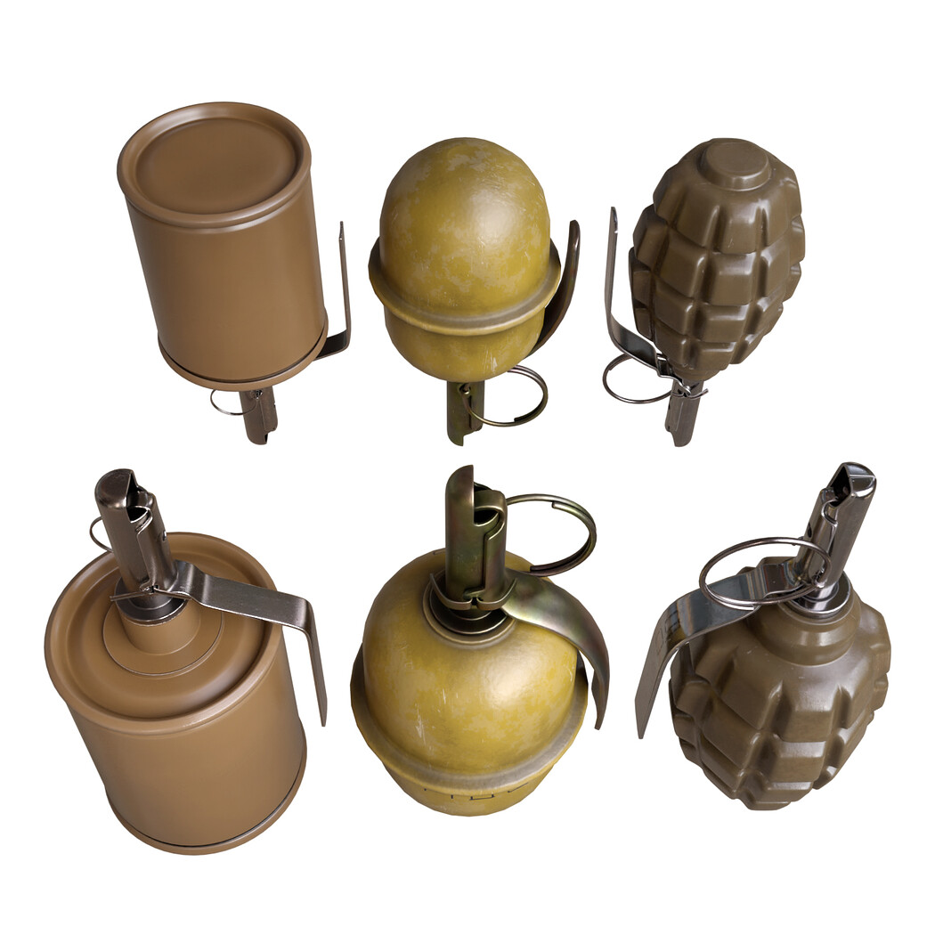 Grenade set model F1 model RGD5 model RG42 Collection of three hand grenade. Models: rgd5, rg42, f1 Low poly models ready for subdivision smoothing. PBR standard textures and material. Each grenade has its own UV. Each grenade has its own material PBR