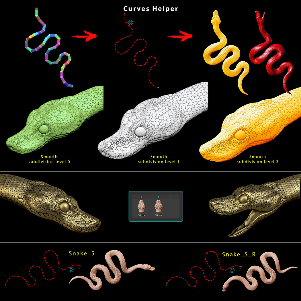 There is one peculiarity: you can add actual levels of subdivision (Tool>Geometry>Divide) only after separating the snake into a separate subtool, if this is not done the partitioning will not be smoothed! I highly recommend using CurvesHelper with this brush.