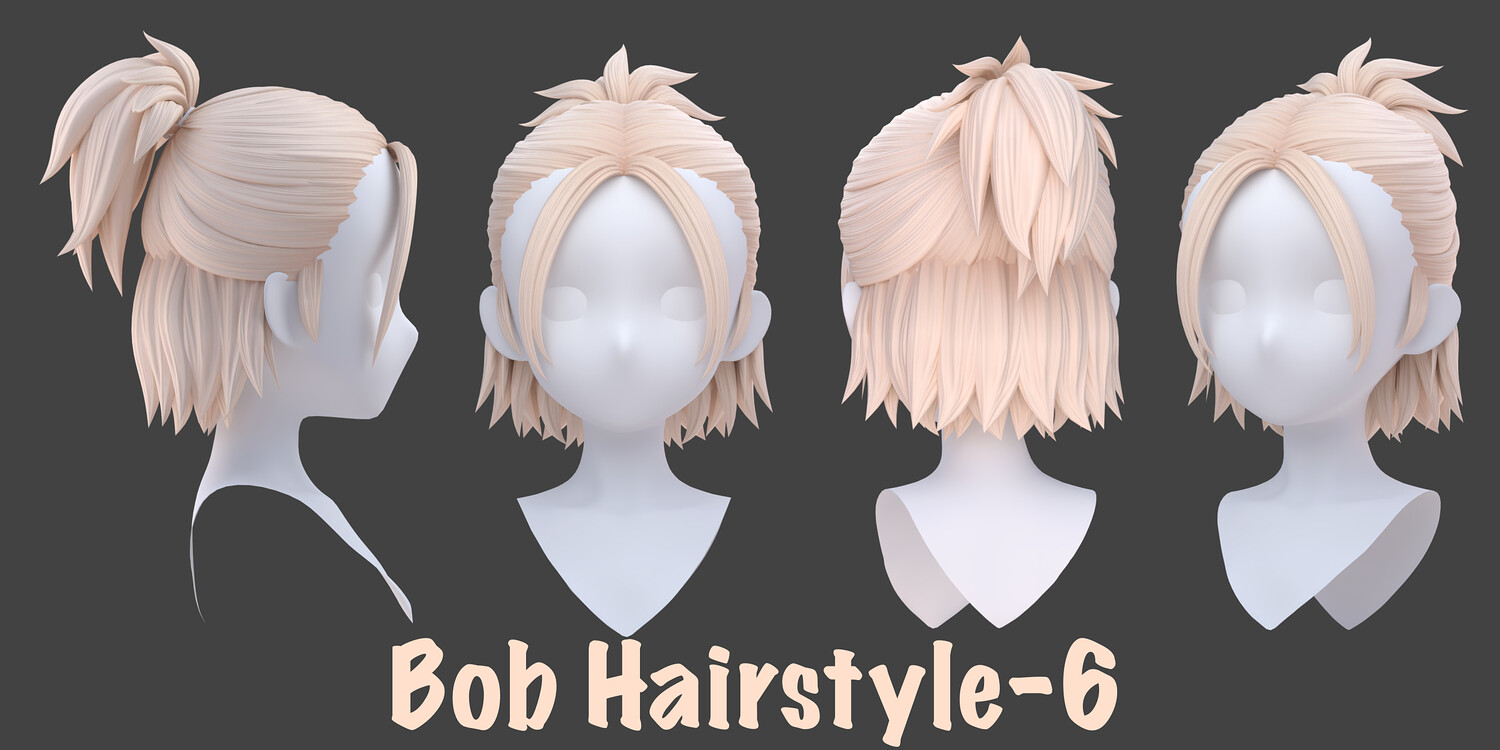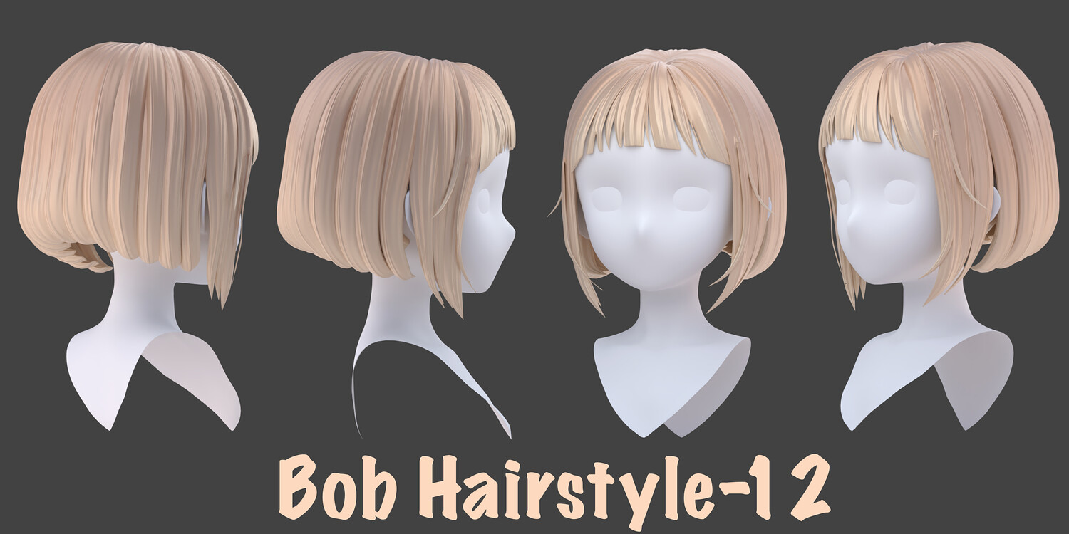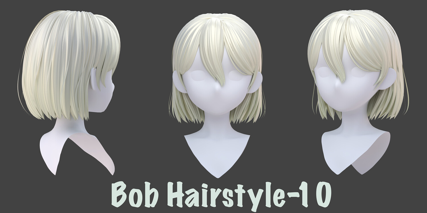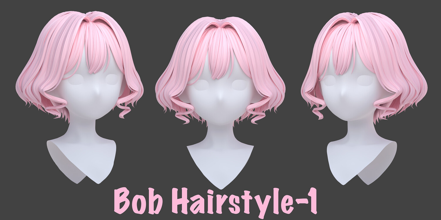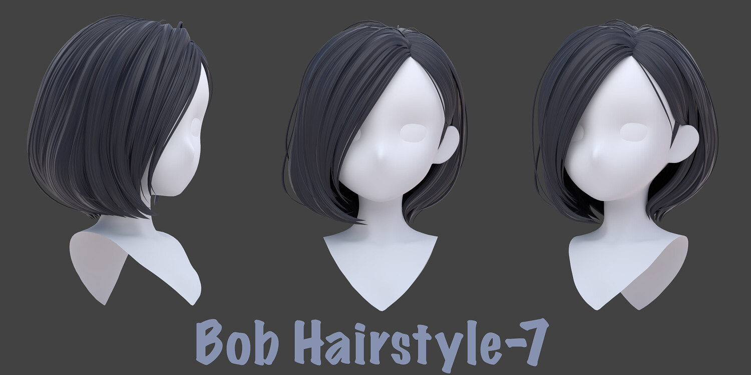The pack includes: - 12 types of bob Hairstyles - Blender files (curve +mesh)- built as a fully modular hair system.Each hairstyle is separated into parts, allowing you to mix, match, and customize freely to create multiple variations from a single base.The hair is provided in both curve-based and mesh-based versions, giving you full control over shape, structure, and export workflow. -Different types of bangs for creating more variations (interchange the bangs to get a different hairstyle) - Head Mesh and other accessories
