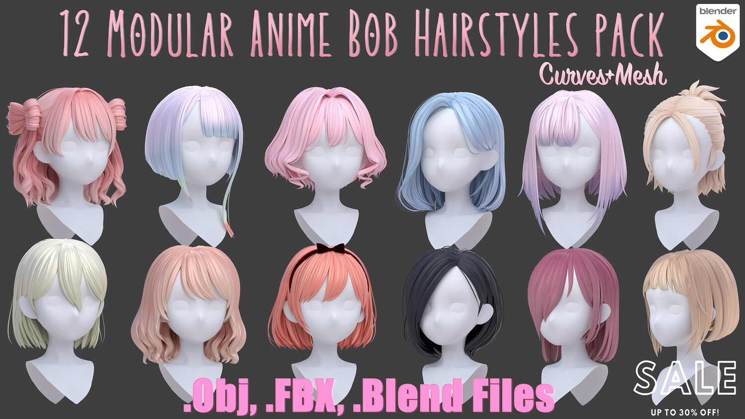 12 modular bob hairstyle pack / collection- curves+Mesh - Anime stylized- blend, obj and fbx files