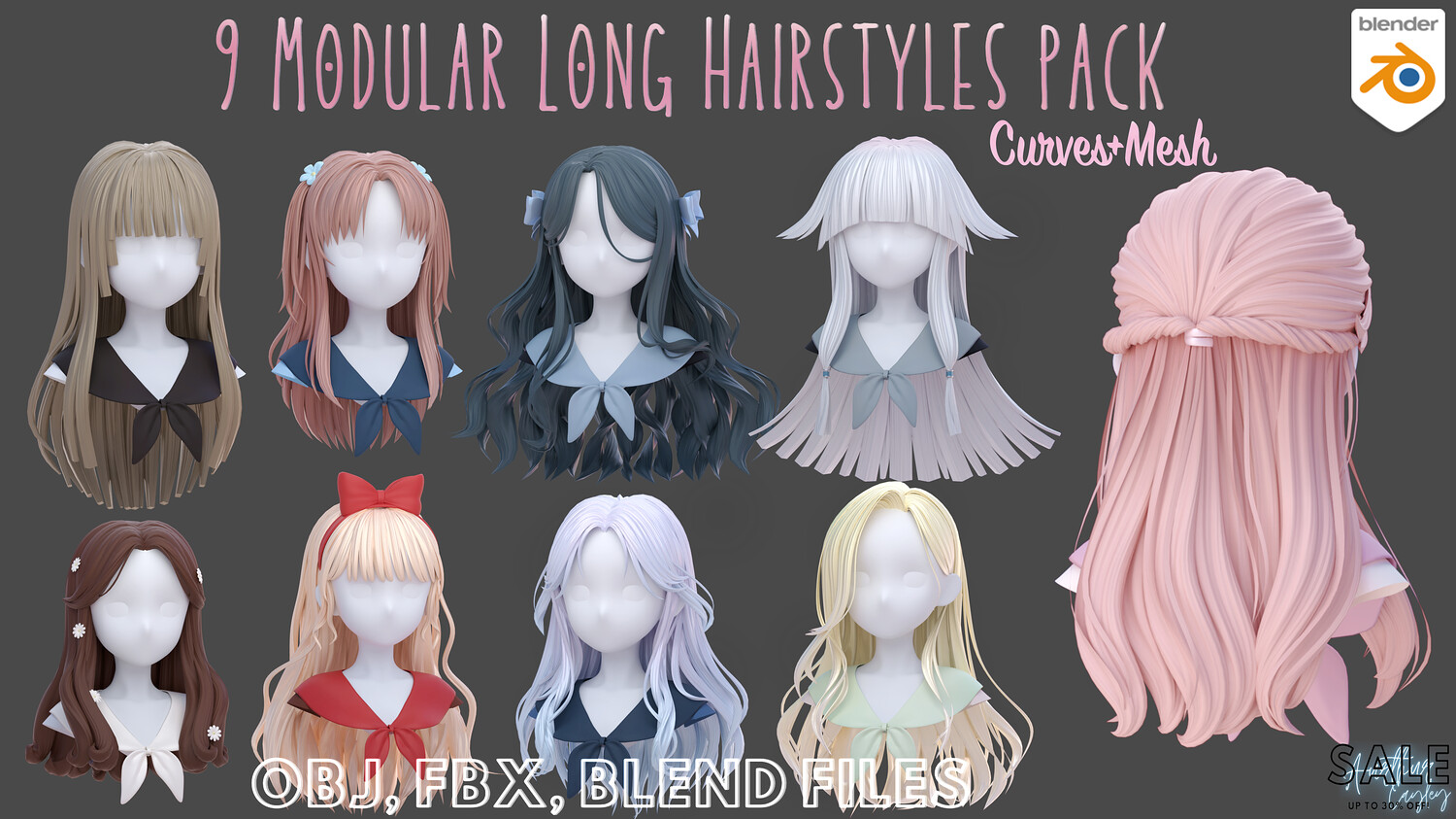 9 modular long hairstyle pack / collection- curves+Mesh - blend, obj and fbx files