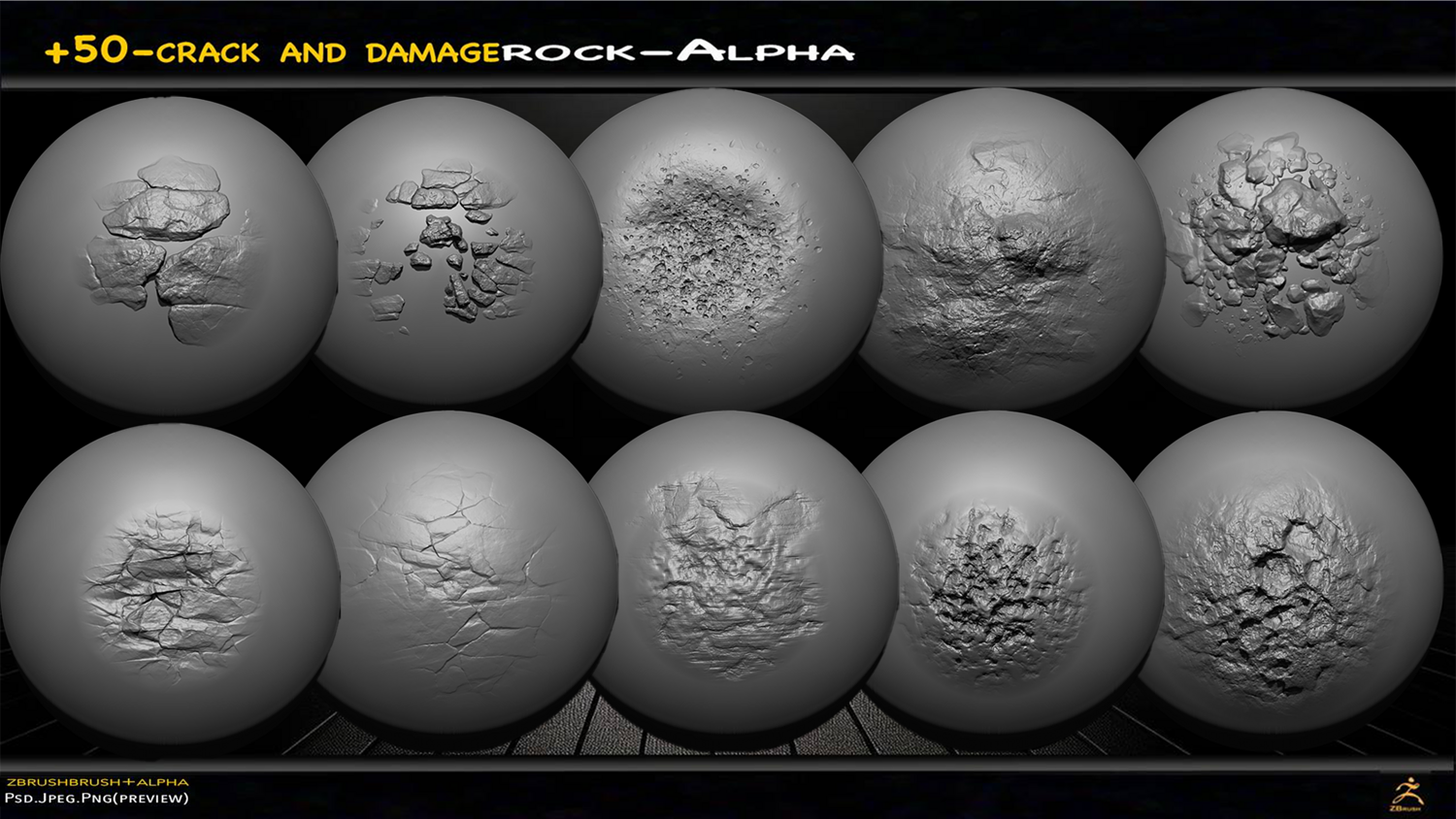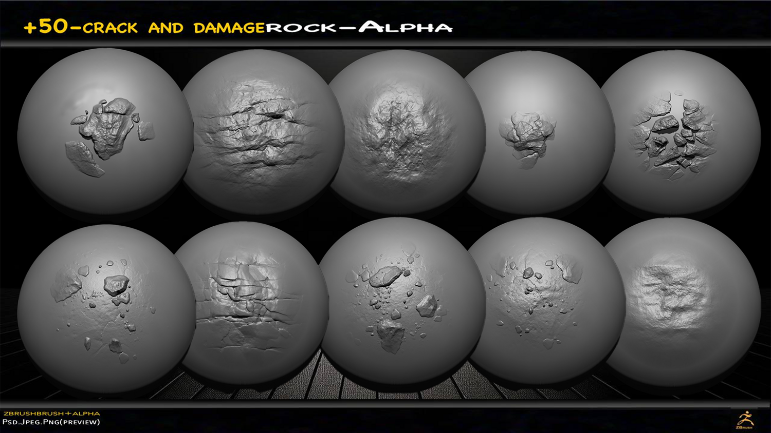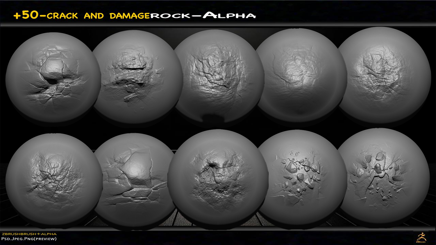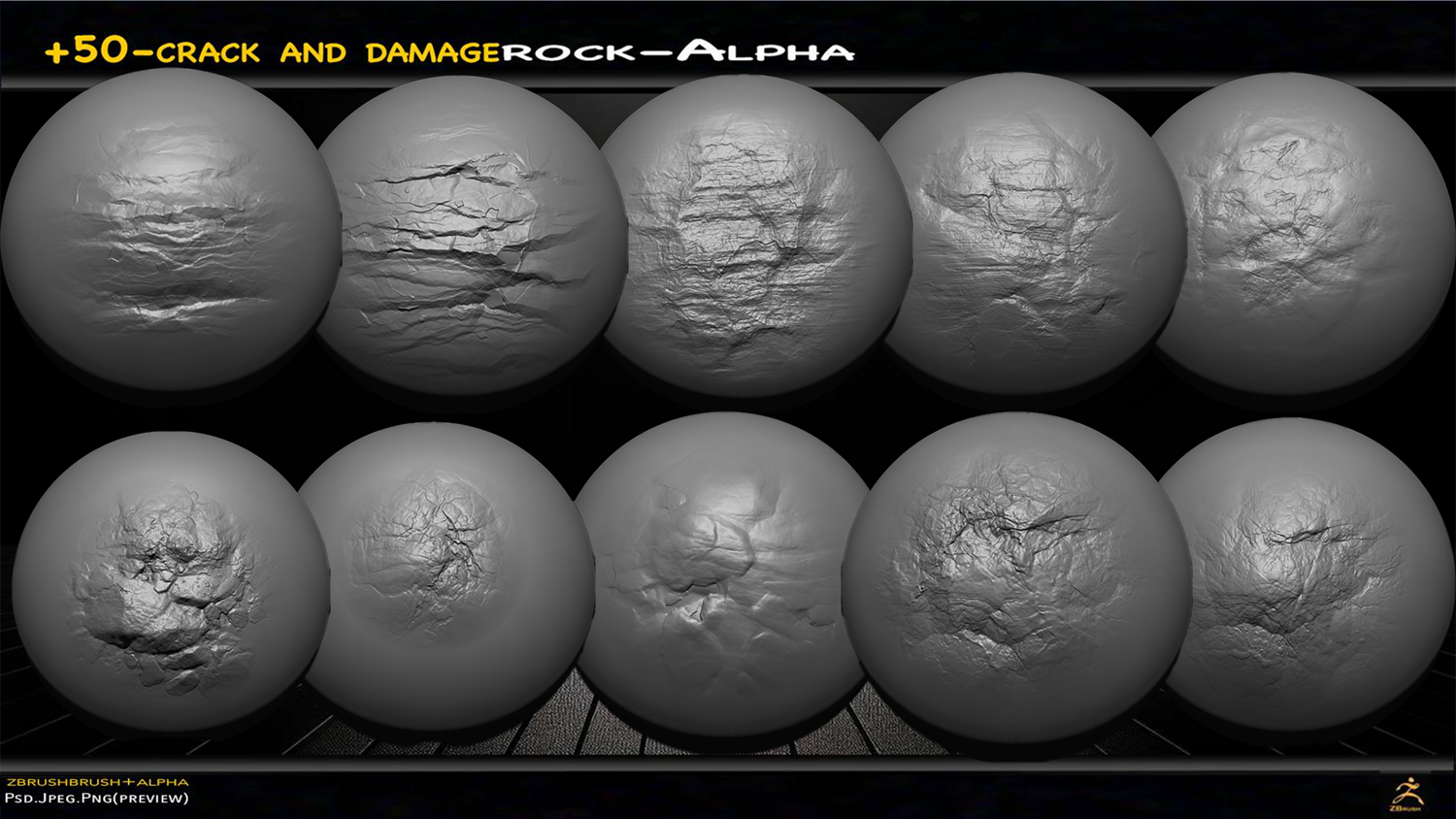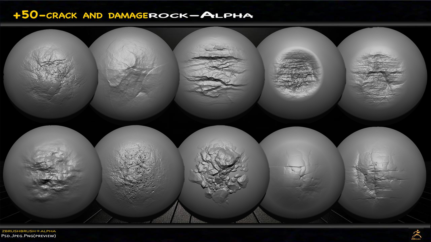 Includes: • 50+ Handcrafted Rock & Damage Alphas • Formats: PSD, JPEG, PNG (Preview) • Seamless & High-Resolution Textures • Ready for ZBrush, Blender, Substance Painter, 3D Coat, and other sculpting or texturing software