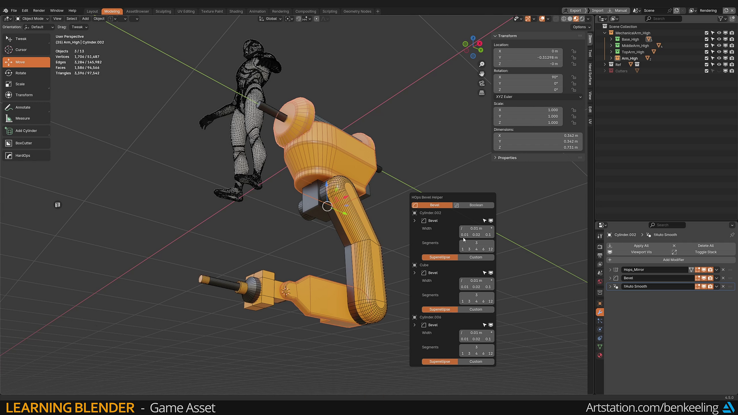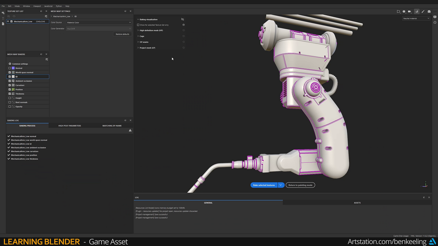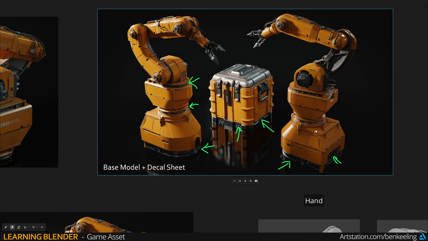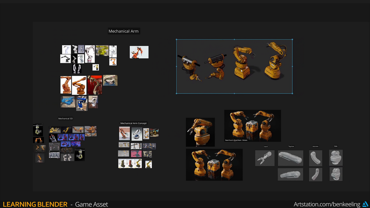 Chapter 1 - Introduction, Ref Gather, Collection Instances, Blockout - 57m Chapter 2 - Modelling - Base, Bottom Arm, Middle Arm, Hand, Creating Game-ready mesh - 3h 17m Chapter 3 - UV Fundamentals, Uvs, Packing - 37m Chapter 4 - Baking, Texturing, Adding Decals - 1h 23m Chapter 5 - Render, Import into Unreal - 30m