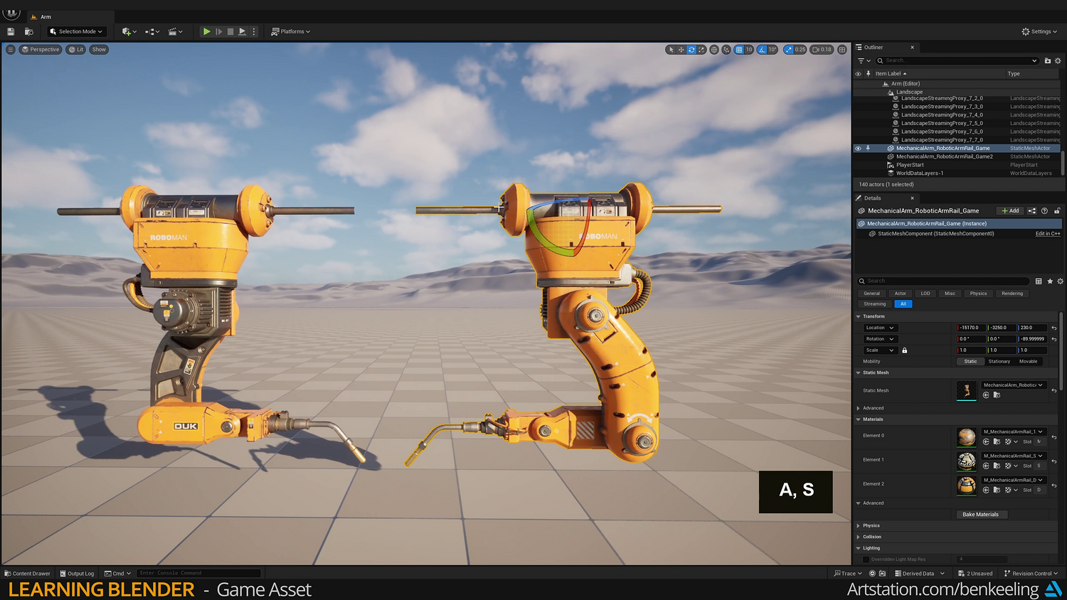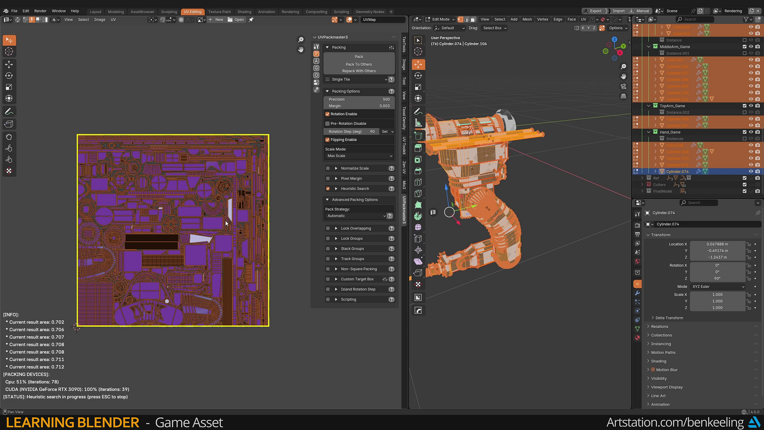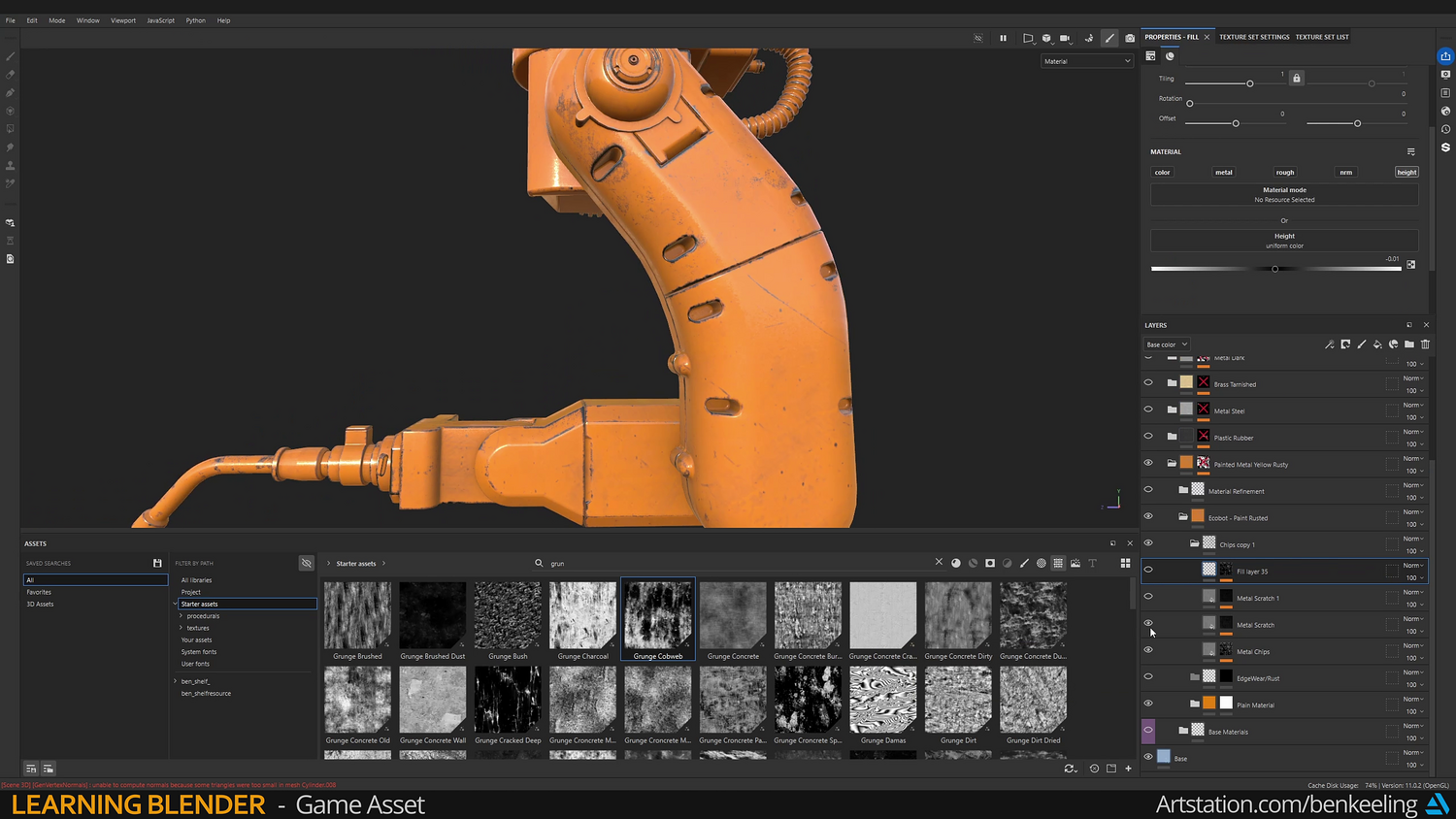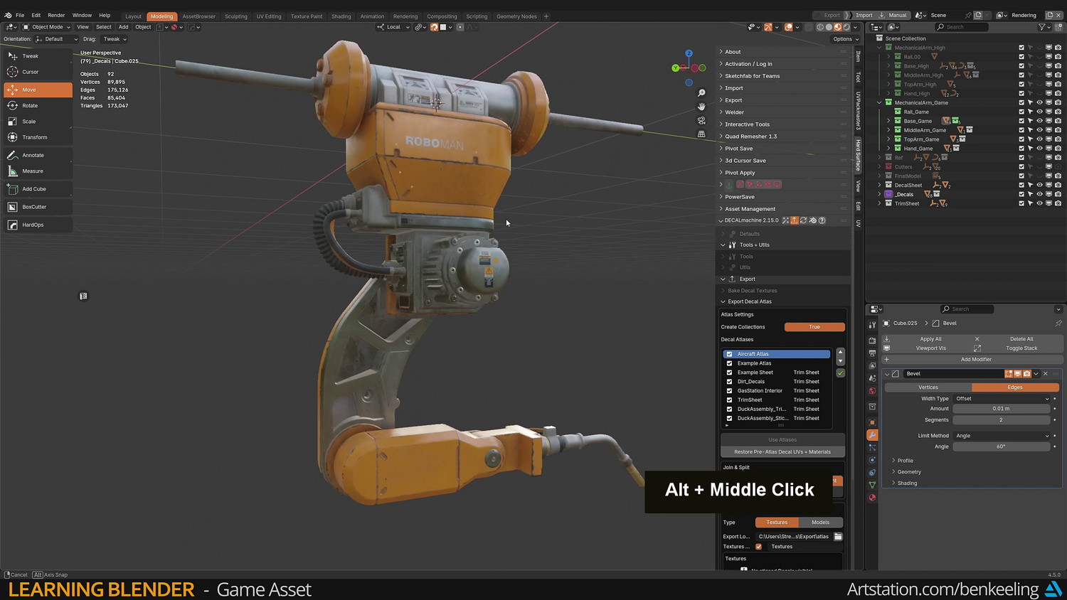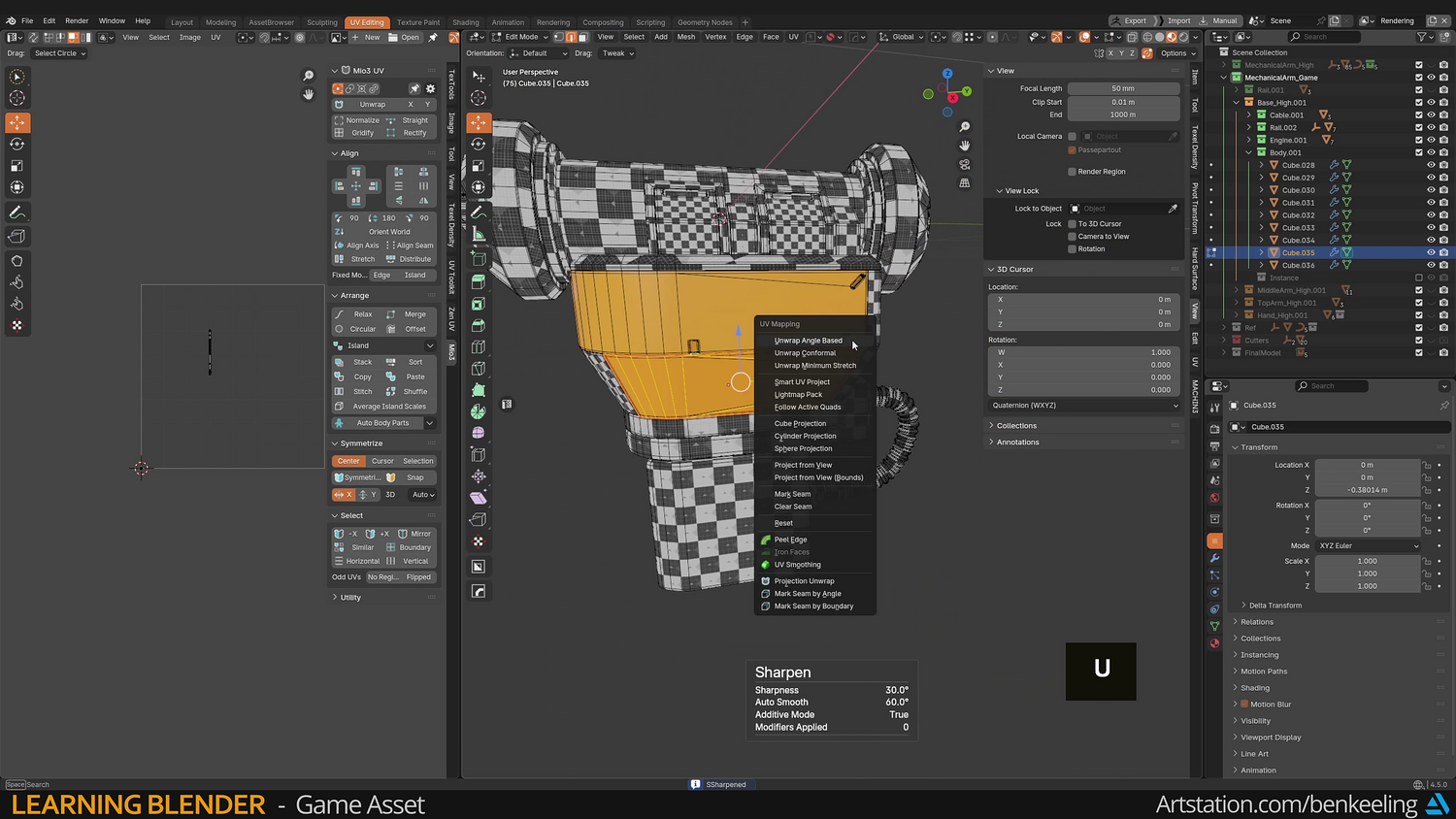 Chapter 1 - Introduction, Ref Gather, Collection Instances, Blockout - 57m Chapter 2 - Modelling - Base, Bottom Arm, Middle Arm, Hand, Creating Game-ready mesh - 3h 17m Chapter 3 - UV Fundamentals, Uvs, Packing - 37m Chapter 4 - Baking, Texturing, Adding Decals - 1h 23m Chapter 5 - Render, Import into Unreal - 30m
