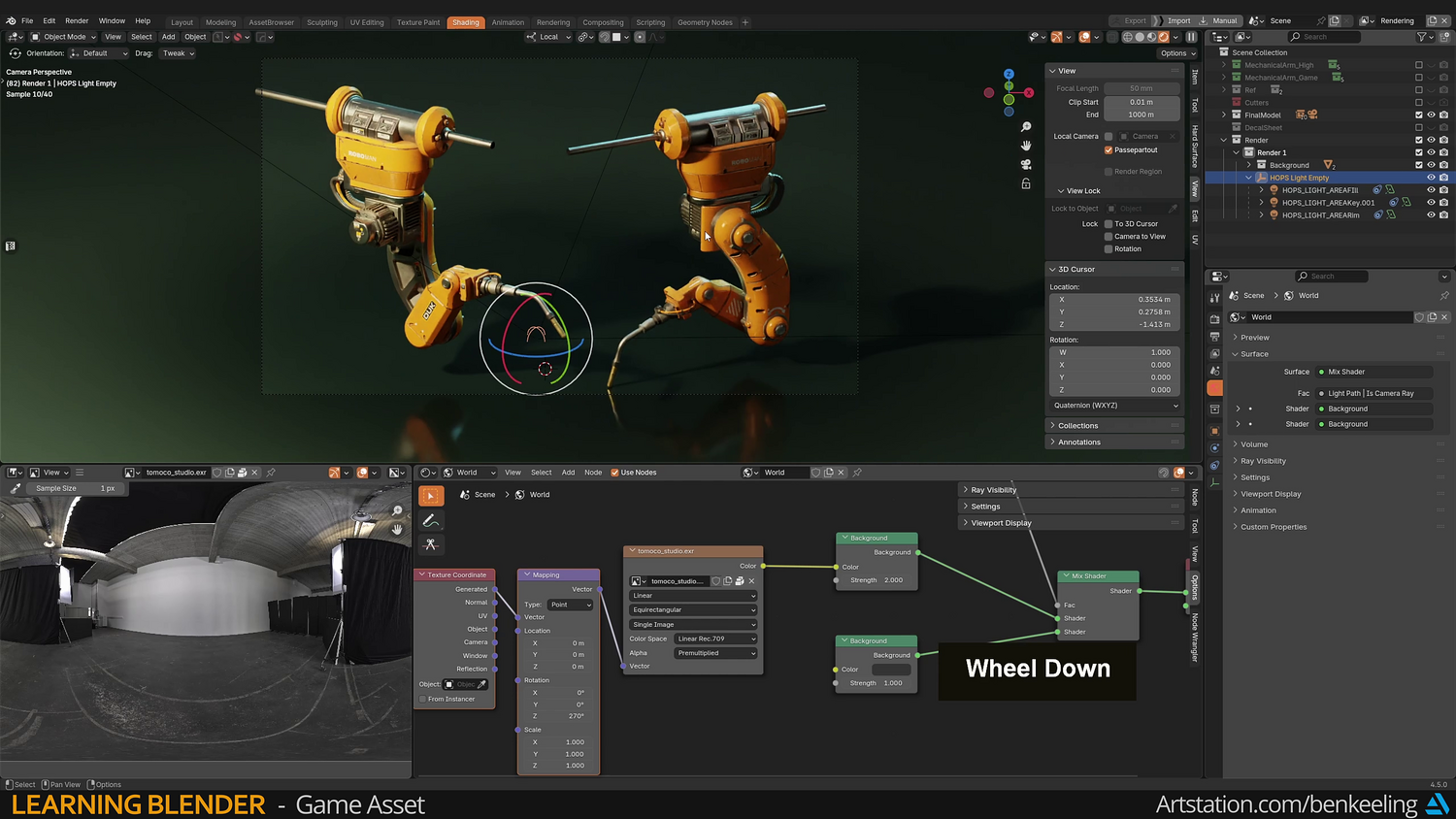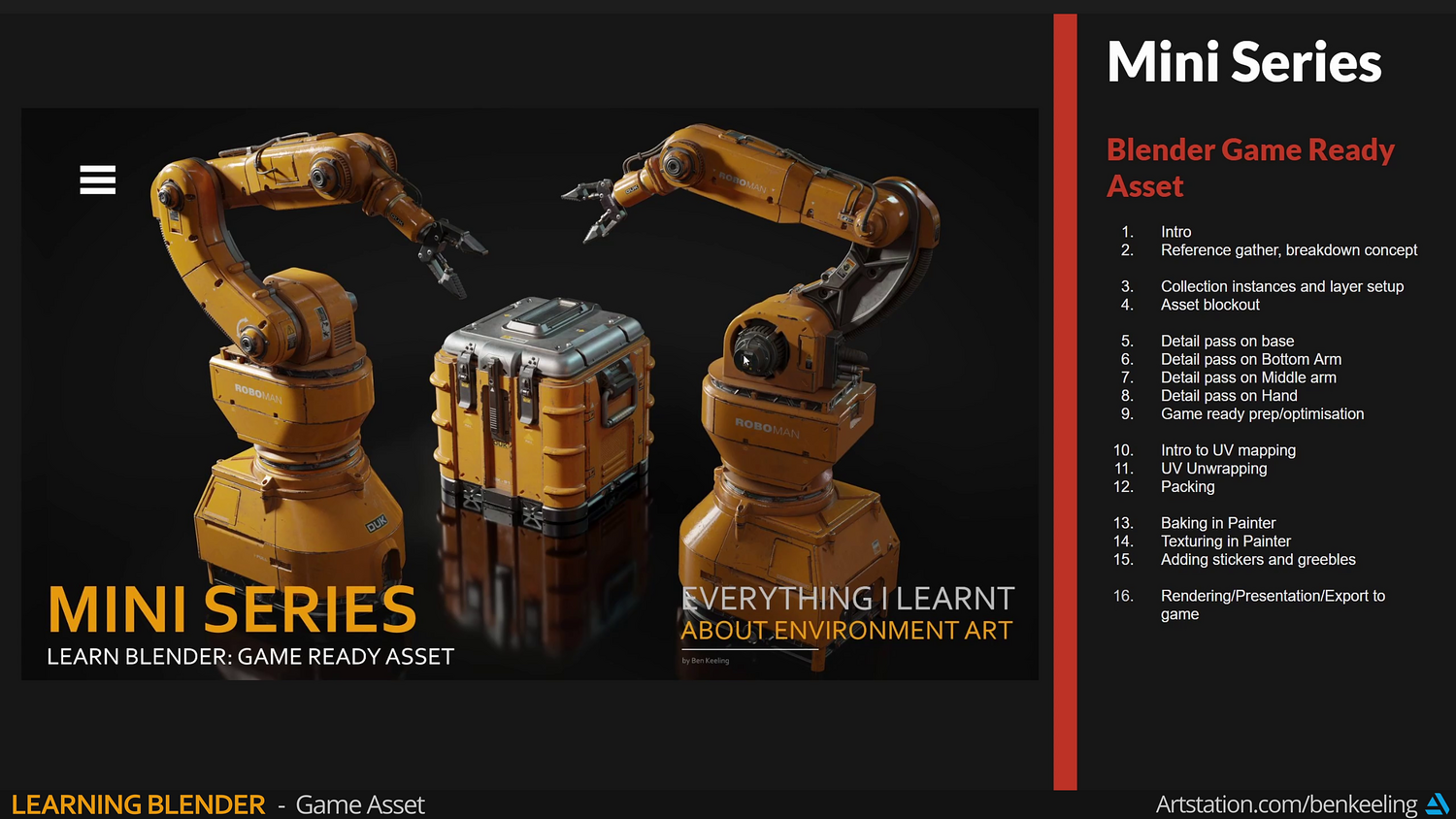 The tutorial is focused on creating hard surface models in Blender. For this tutorial specifically, it's about understanding the game asset pipeline, starting with gathering reference and blocking out our model, modelling the mechanical arm, creating a game mesh with UVs, textures and exporting to Unreal.