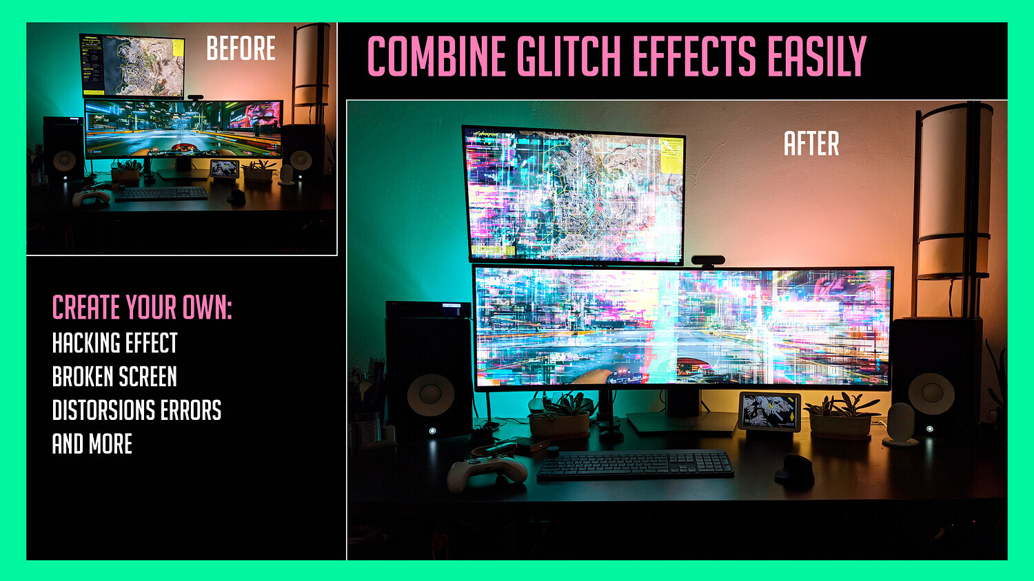 🔷 Full pack includes different Overlay Effects like: Screen glitch Effects, Abstract glitch effect, Broken screen glitch effect, Colorful noise effect, Damaged Glitch lines and much more.