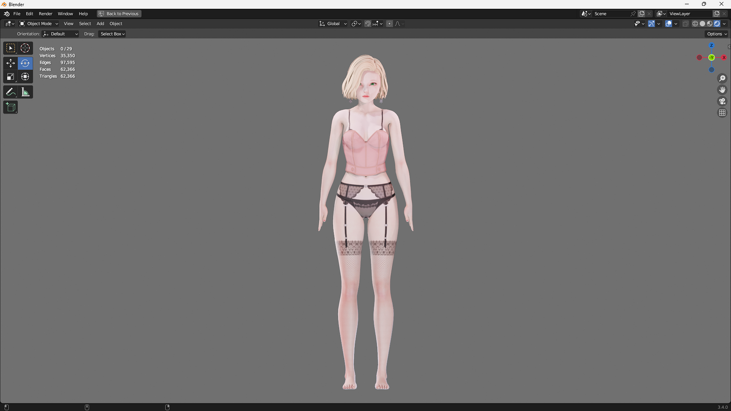 Polycount: Vertices: 35.350 Edges: 97.595 Faces: 62.366 Triangles: 62.366