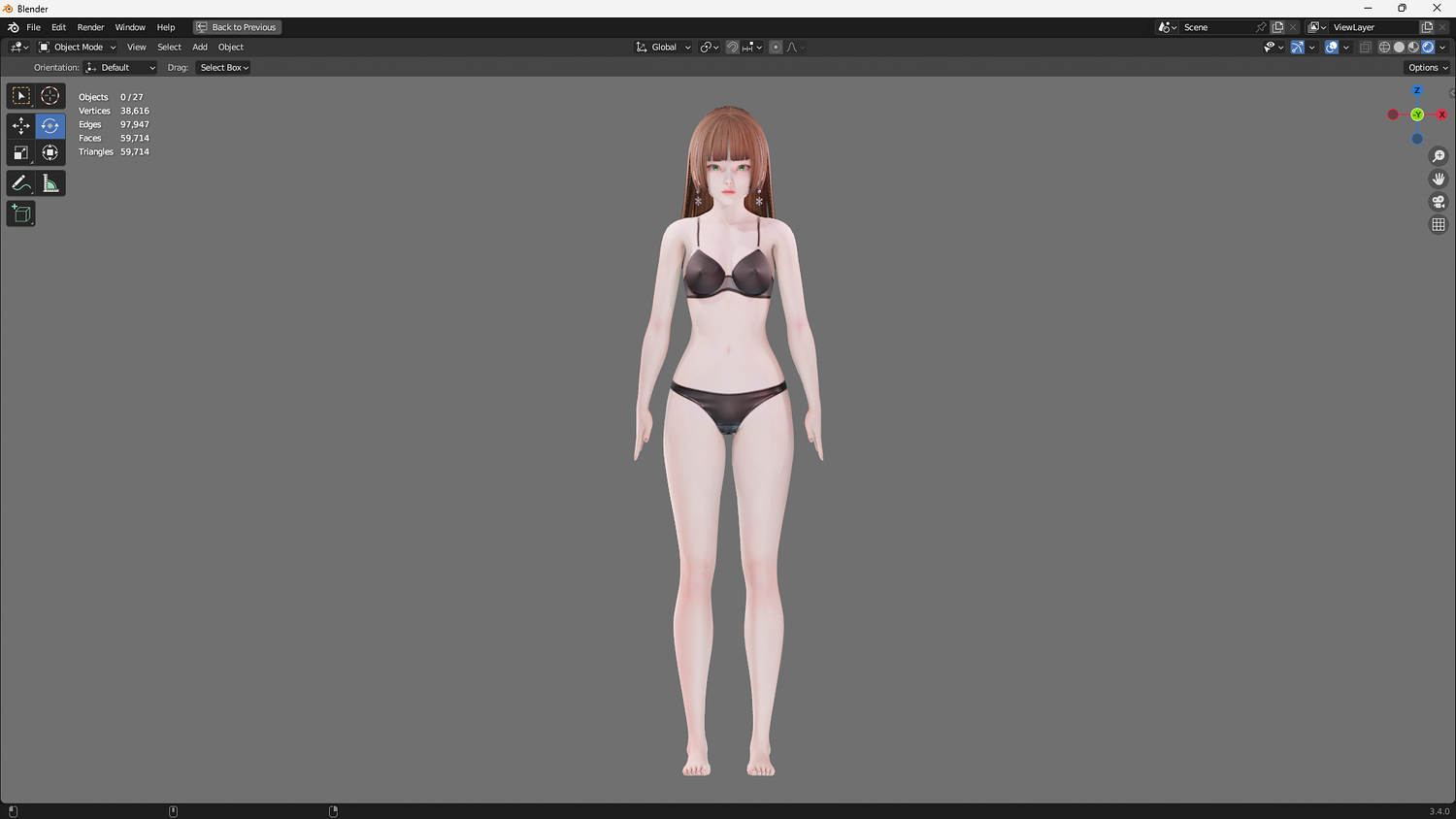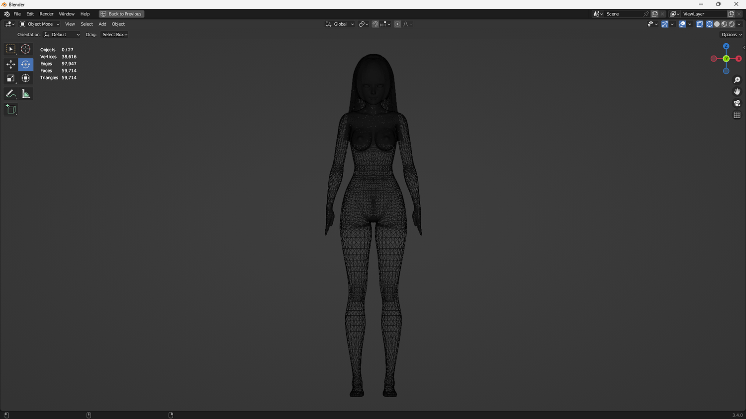 Polycount: Vertices: 38.616 Edges: 97.947 Faces: 59.714 Triangles: 59.714