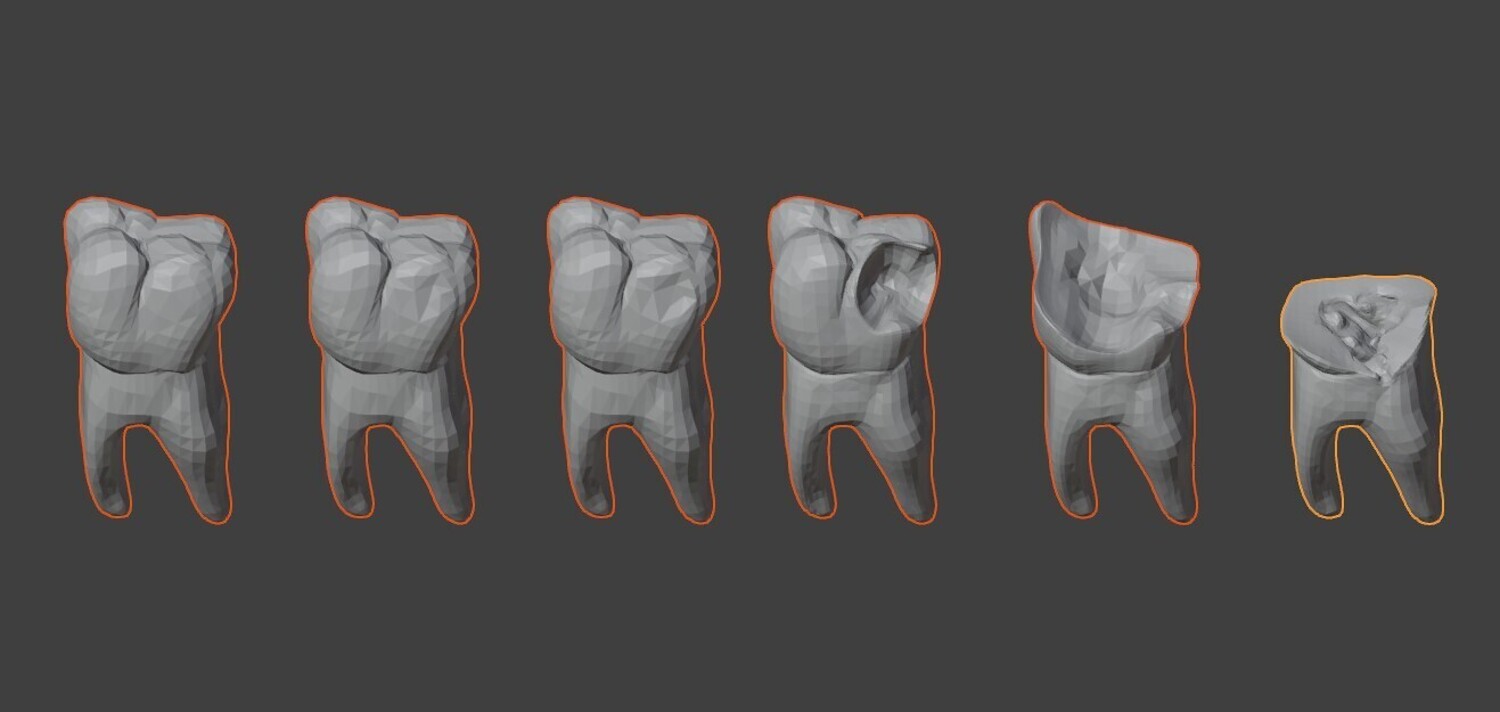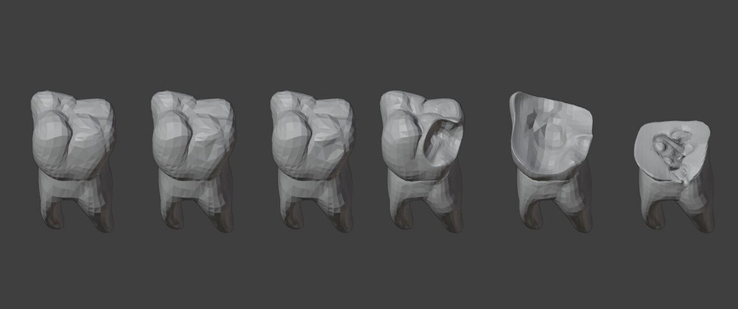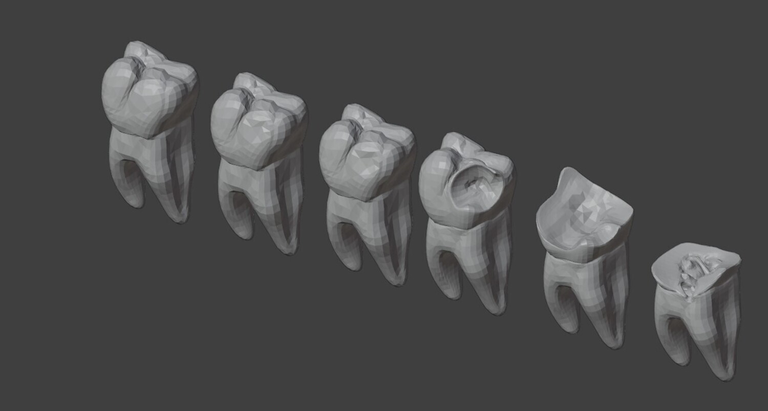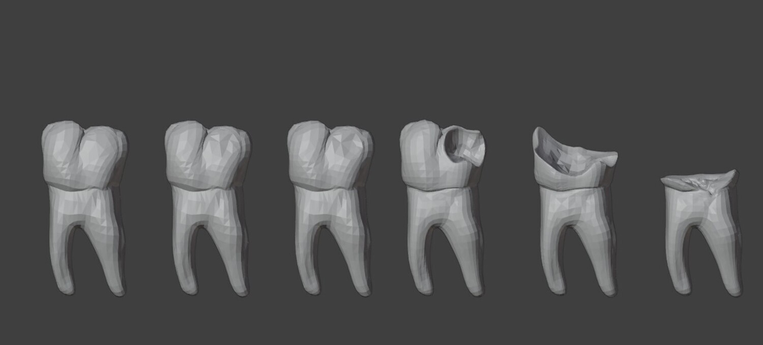 This 3D model of tooth decay progression provides a highly detailed and anatomically accurate representation of the stages of dental caries development.