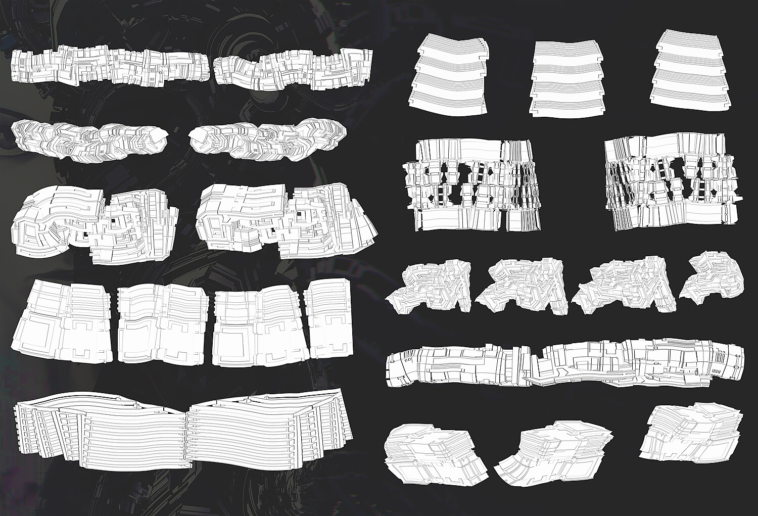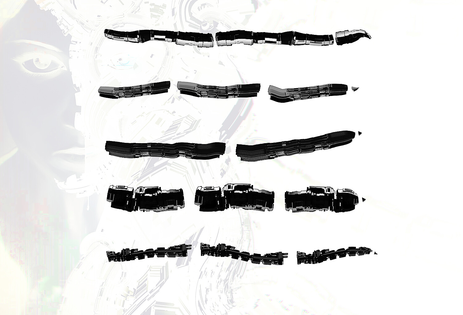 30 Countour shape mech and robot surface brushes; 35 Main black colored shape mech and robot surface brushes; 20 Silhouette shape mech and robot surface brushes; 85 PNG files on materials.