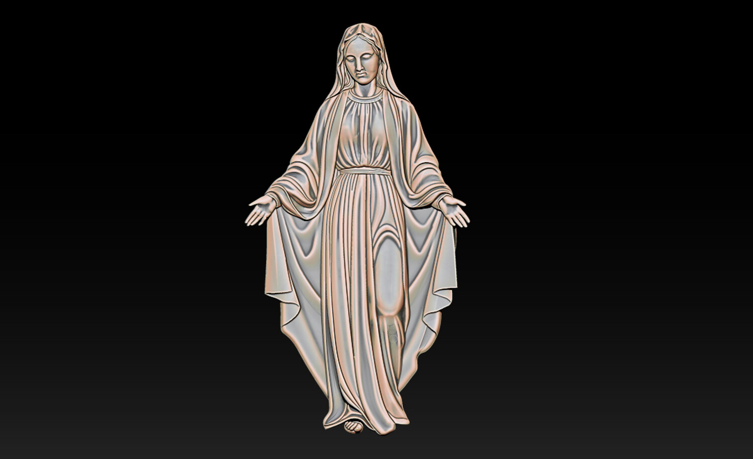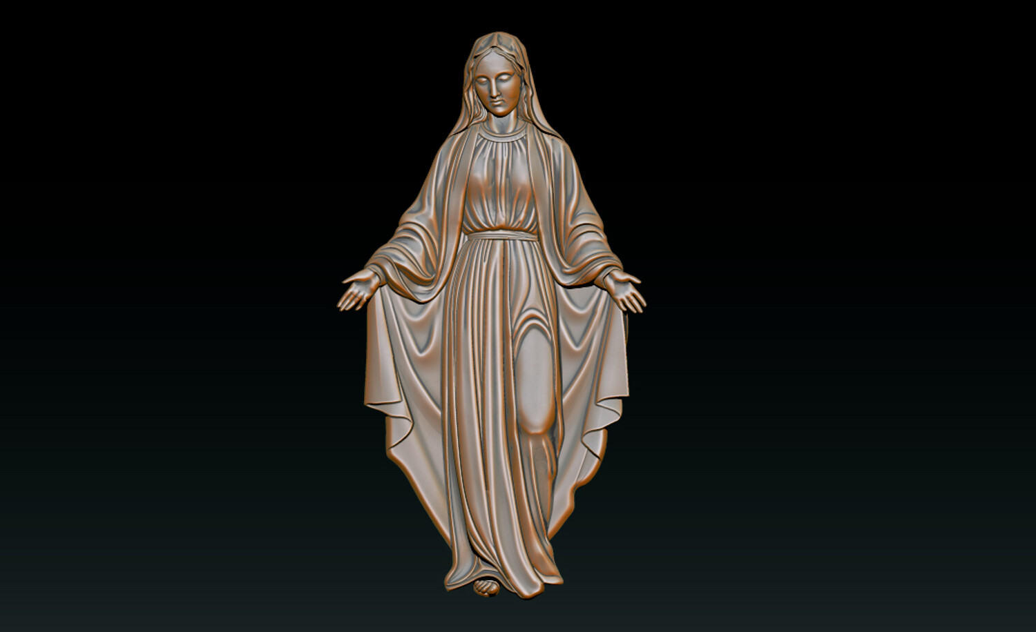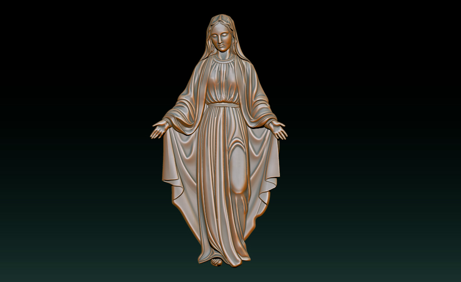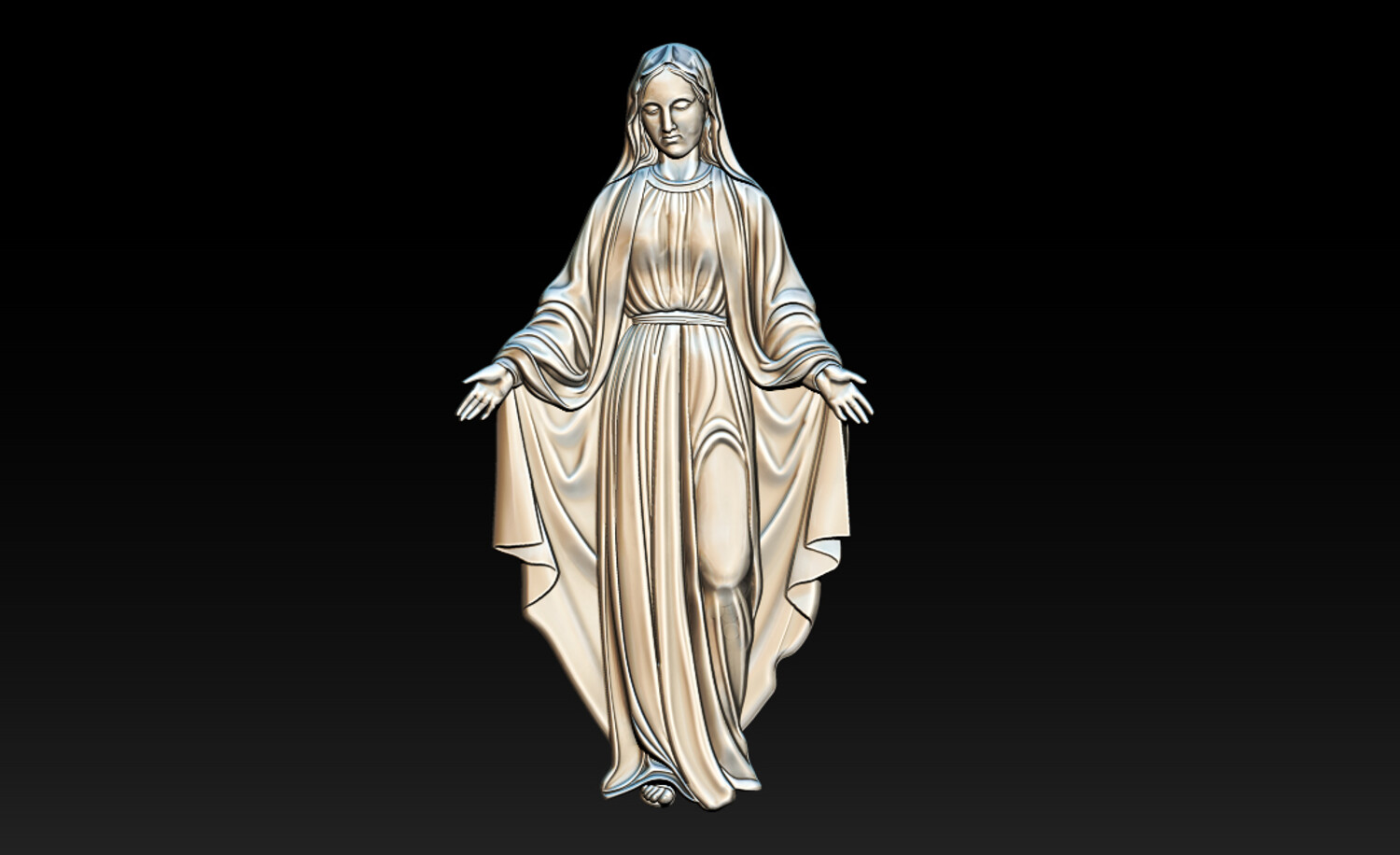 Virgin Mary Relief – 3D Model for CNC Carving and Religious Art This Virgin Mary 3D Relief Model presents a graceful and serene representation of the Blessed Mother with open arms, symbolizing love, compassion, and divine protection. The sculpture features beautifully flowing robes with soft natural folds, carefully sculpted to create depth and elegance in the relief. The gentle expression and balanced posture convey peace and spiritual comfort, making this design perfect for religious artworks and sacred decorations. Every detail has been crafted to ensure clean carving results and smooth surfaces, making the model ideal for both CNC machining and high-resolution 3D printing. This design is perfect for creating religious wall art, church decorations, memorial plaques, and devotional sculptures.